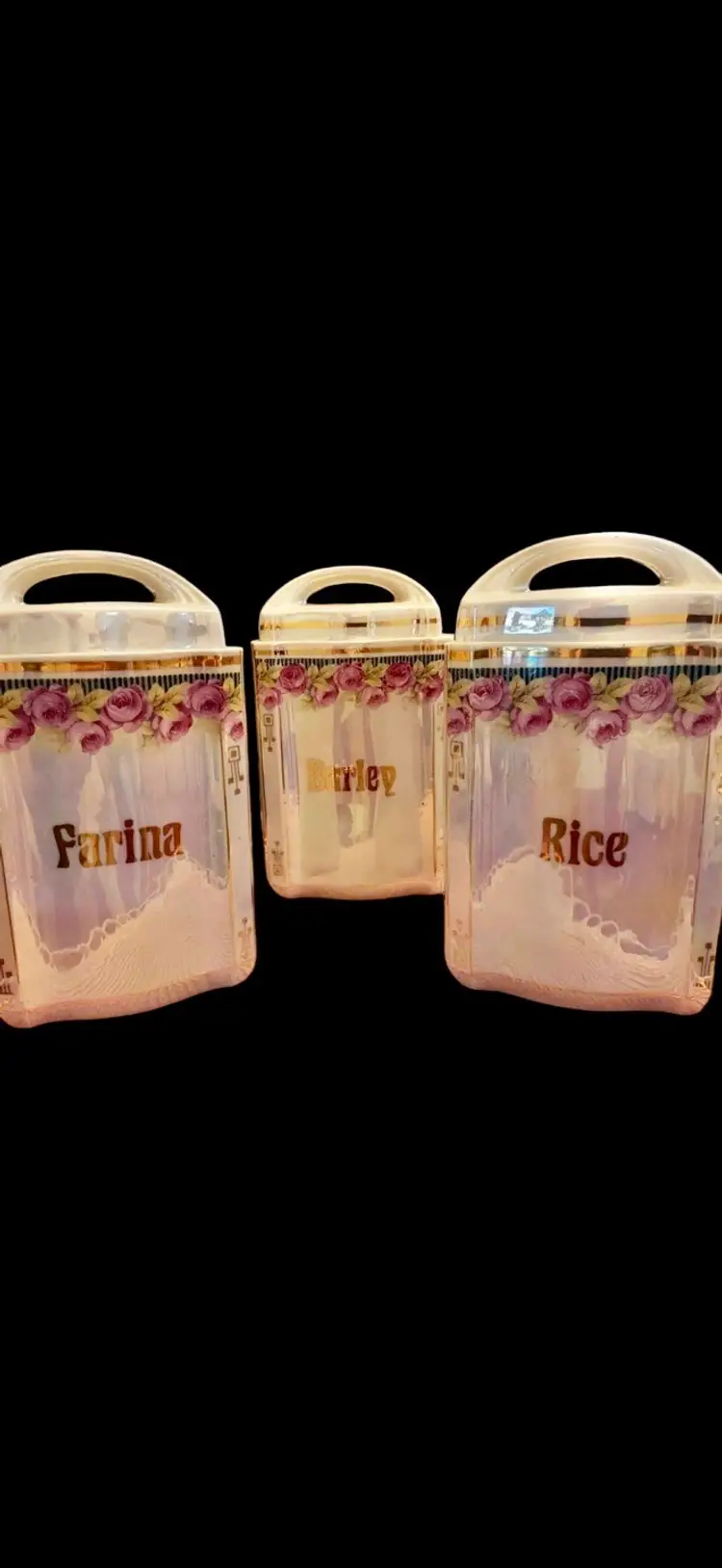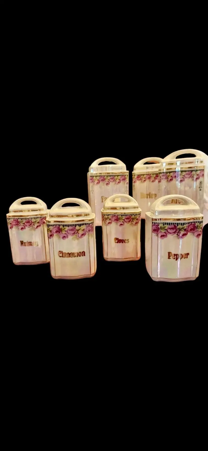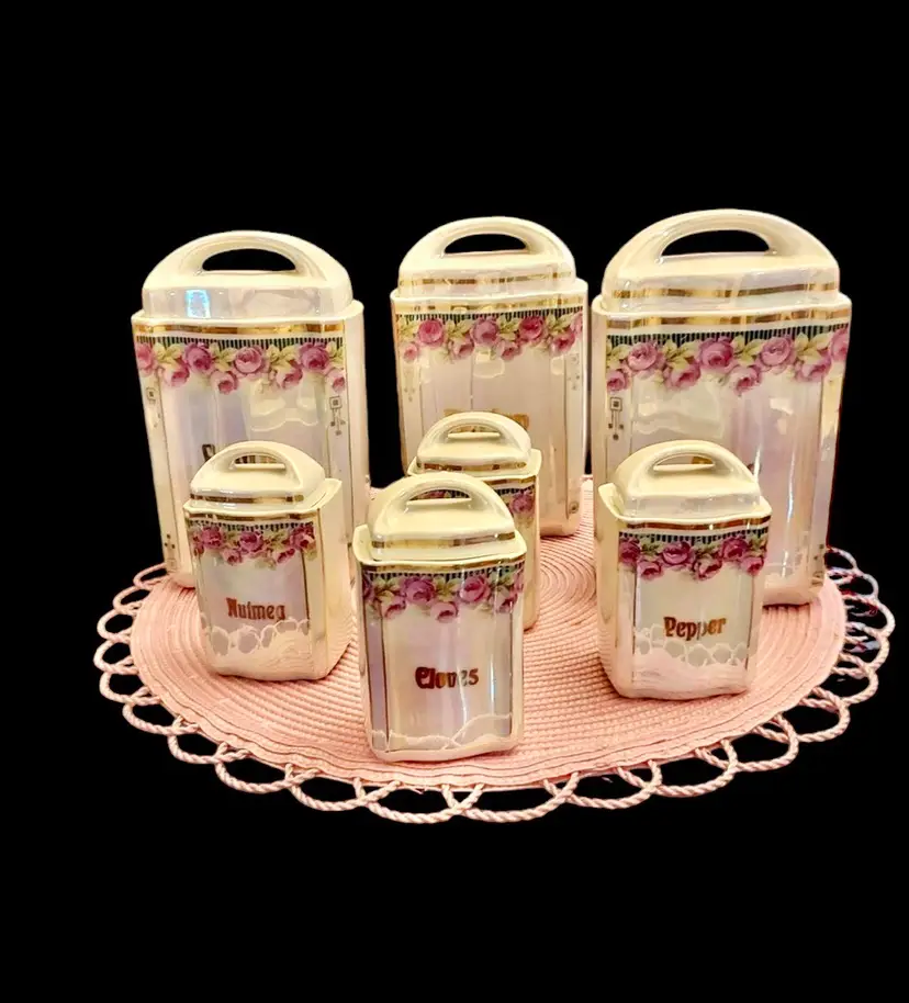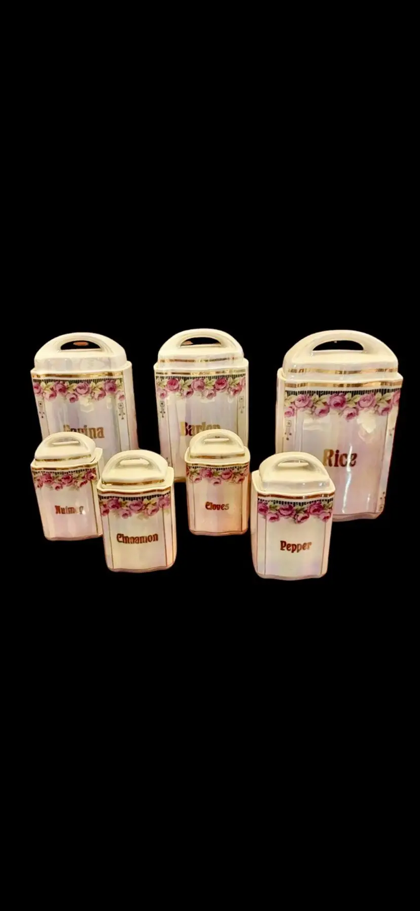 Highly sought after Pre WWIl vintage 1900’s lusterware Canister set … , all with lids (3 large, 4 small). Stamped 2730 and made in Germany on the bottom .. No chips, cracks or repairs. Farina, Barley, Rice, Nutmeg, Cinnamon, Cloves and Pepper. Large 7" ', small 3 1/2". Beautiful, shabby chic cottage design .. love the iridescent pink finish that shimmers .. smoke and pet freeh