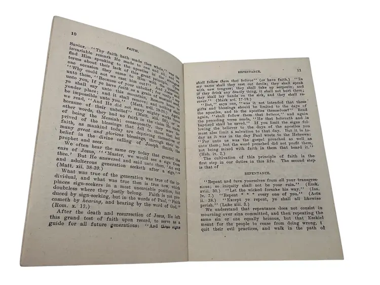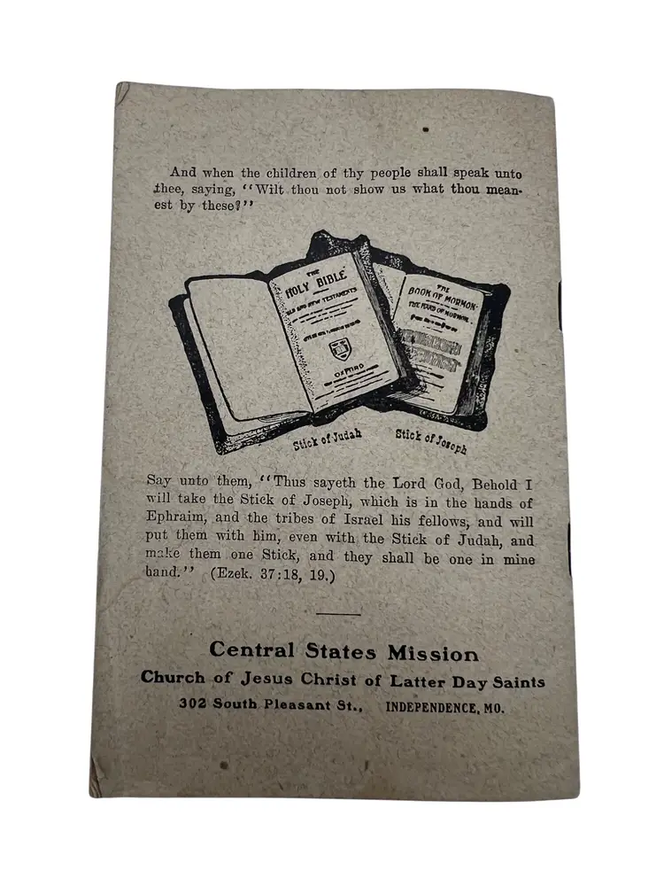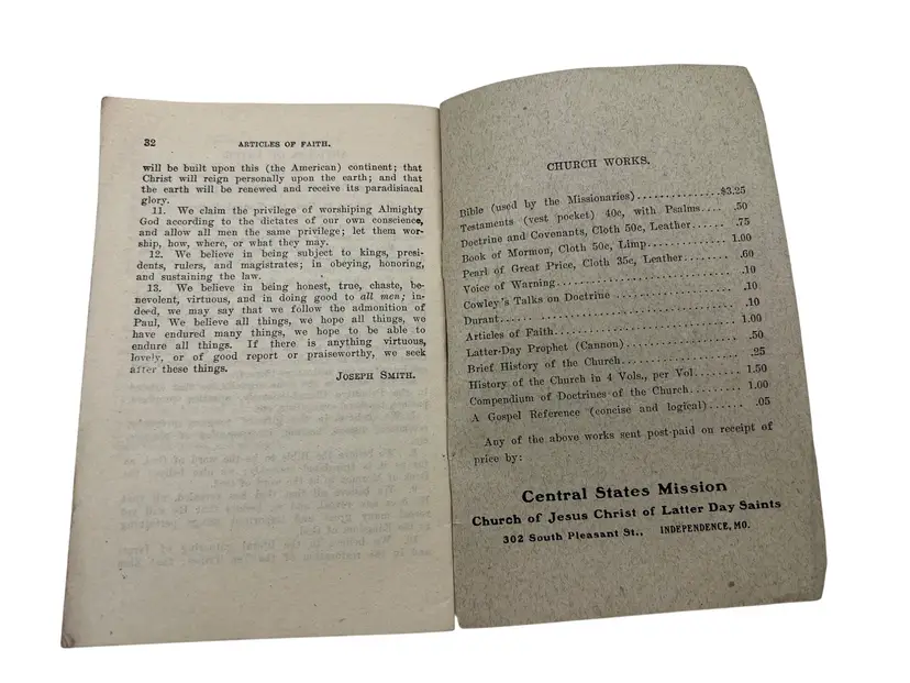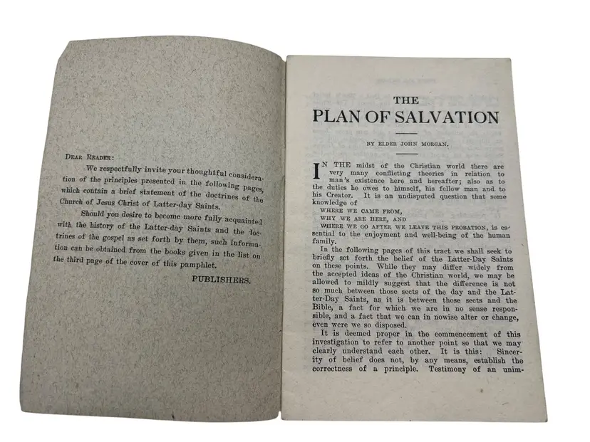 Early Mormon missionary tract titled The Plan of Salvation by Elder John Morgan, published in 1905 by the Central States Mission of the Church of Jesus Christ of Latter Day Saints in Independence, Missouri. Pocket-size booklet with Temple Block, Salt Lake City illustration on the front, 32 numbered pages explaining Latter-day Saint teachings on the plan of salvation, faith, repentance, baptism, and the Articles of Faith, with a printed catalogue of church works on the rear pages. A nice piece of early 20th-century LDS missionary ephemera.