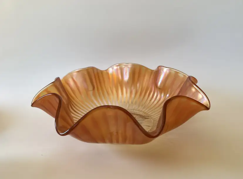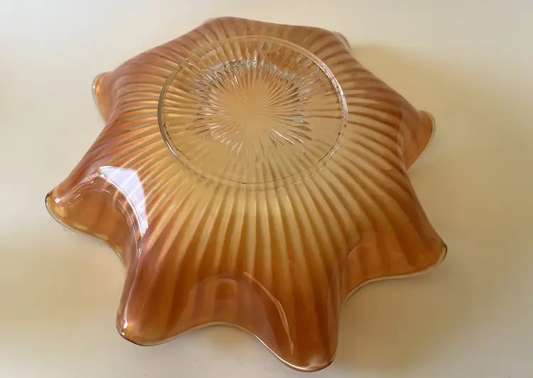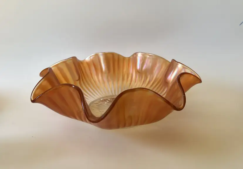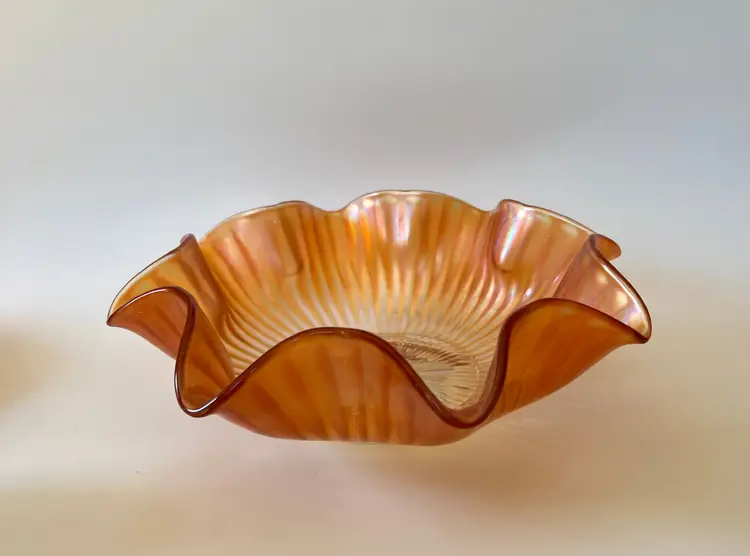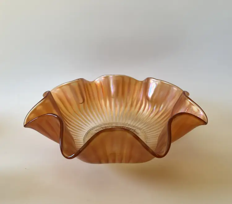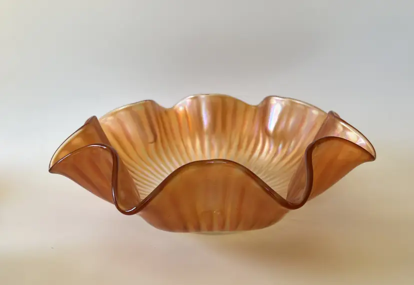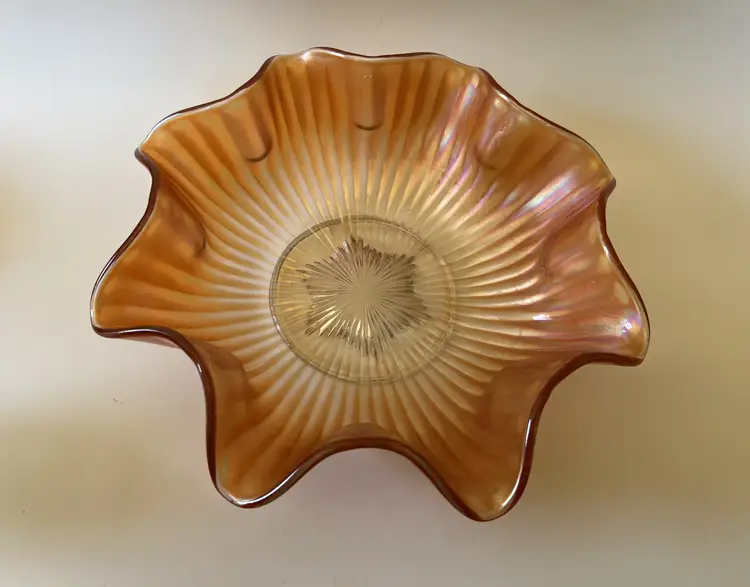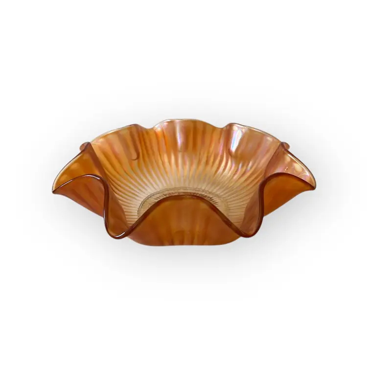 This beautiful bowl features a wide ruffled rim and the gorgeous iridescent shine of carnival glass. The beautiful piece would make a wonderful addition to a carnival glass collection or used as fall decor.