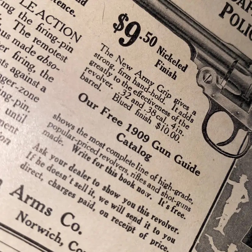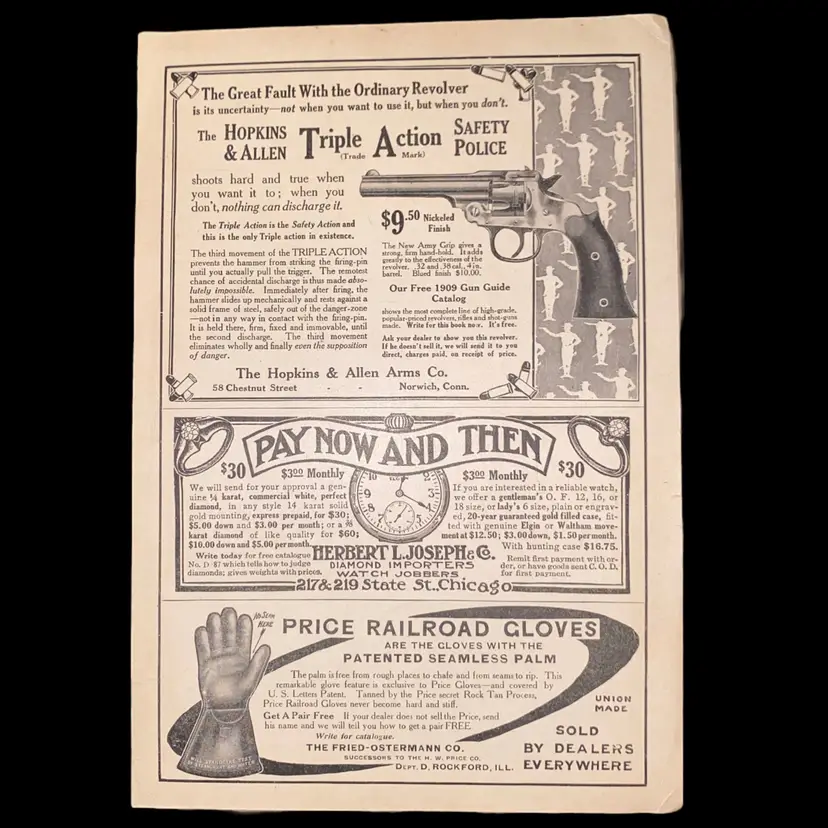 •back side features ads for revolvers, jewelry, and railroad gloves, and is where the 1909 date can be seen.