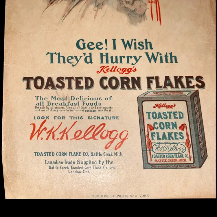 •Original 1909 ad from magazine for WK Kellogg Corn Flakes, featuring an illustration of a toddler by Rose O’Neill, famed female comic artist, illustrator, and creator of Kewpies. However this illustration and ad Pre-dates Kewpie fame.