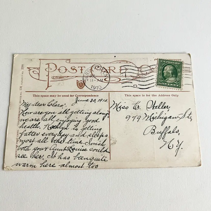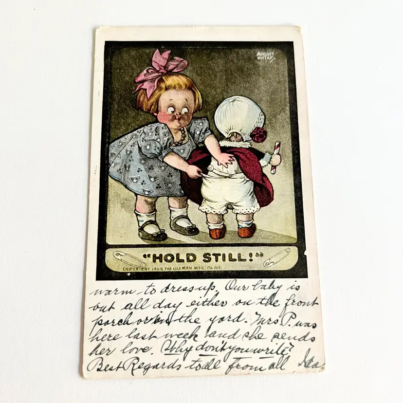 This sweet postcard depicts a big sister, checking her little sister‘s diaper by well known Postcard artist August Hutaf. The post mark is from 1910 from Jersey City, New York, and the postcard was sent to Buffalo, New York. The one cent stamp is still intact. 3 1/2“ x 5 1/2“.
