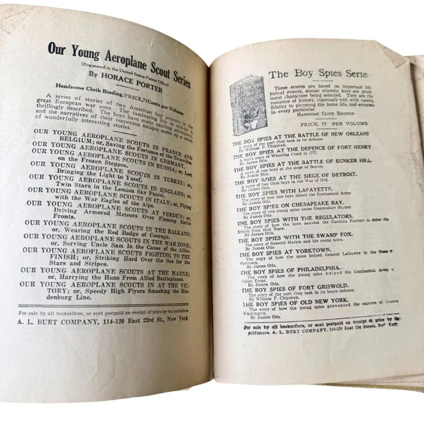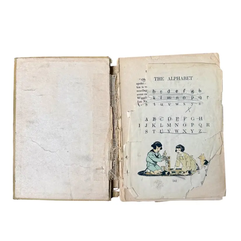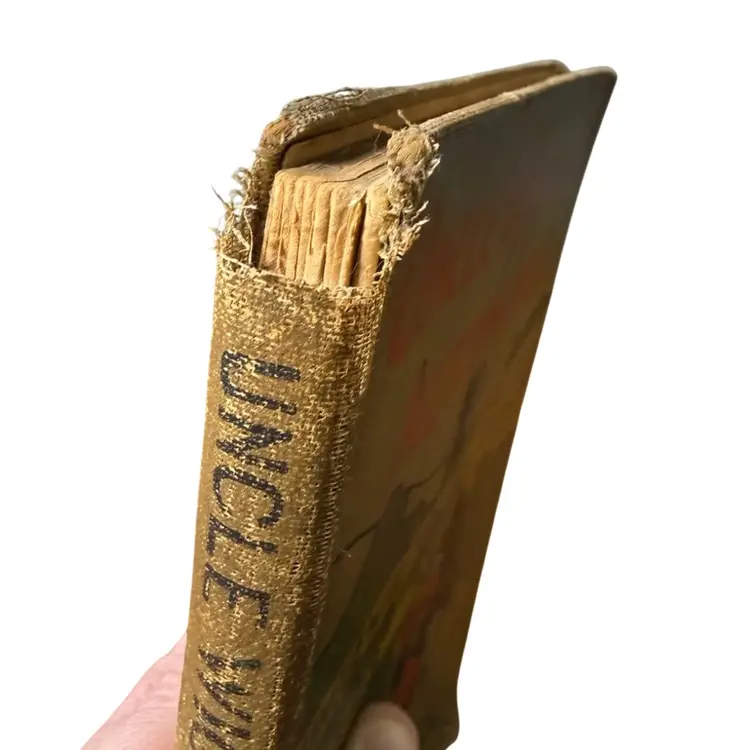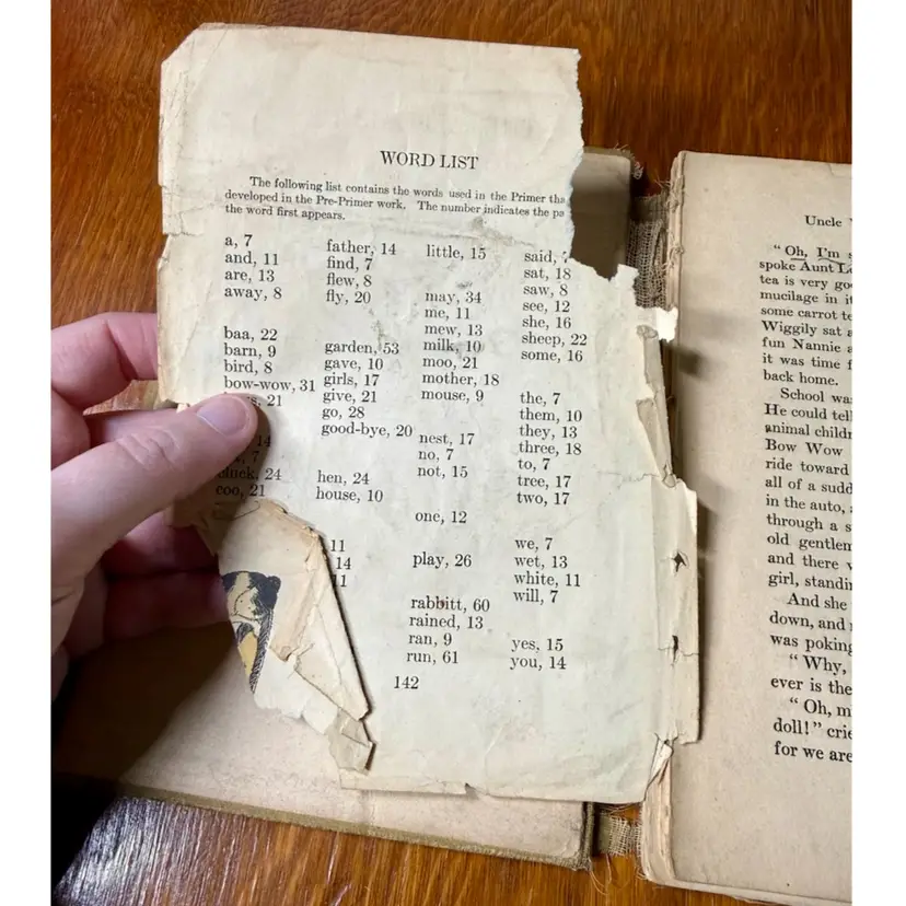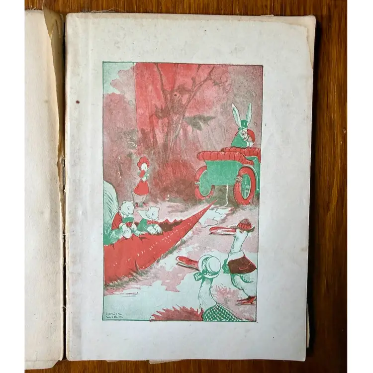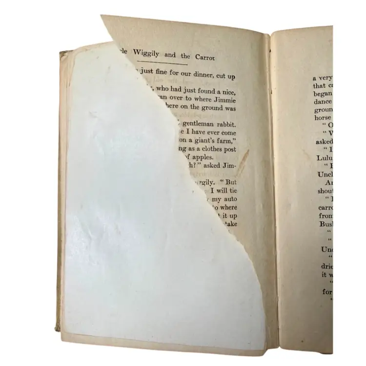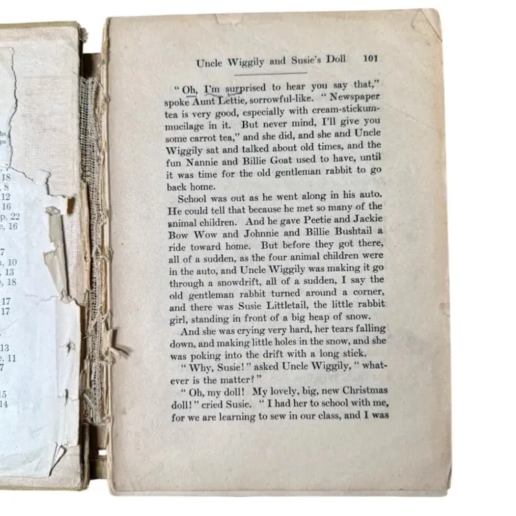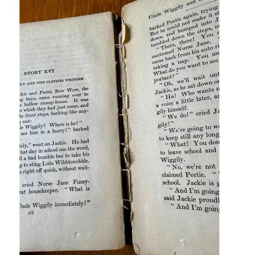 5.57"x8". Antique children’s book, Uncle Wiggly’s, from the 1910’s era. NOTE book is best for display, as it is not in the best condition and is missing a section of pages. A few random pages are separated from the book, binding is loose and holding on by the threads (literally!) but overall still connected, minus the random pages separated. Book starts on page 100 so it is missing front section. Cover has some wear, as do pages. Please see photos.