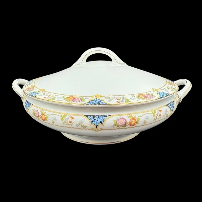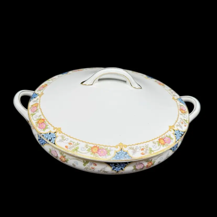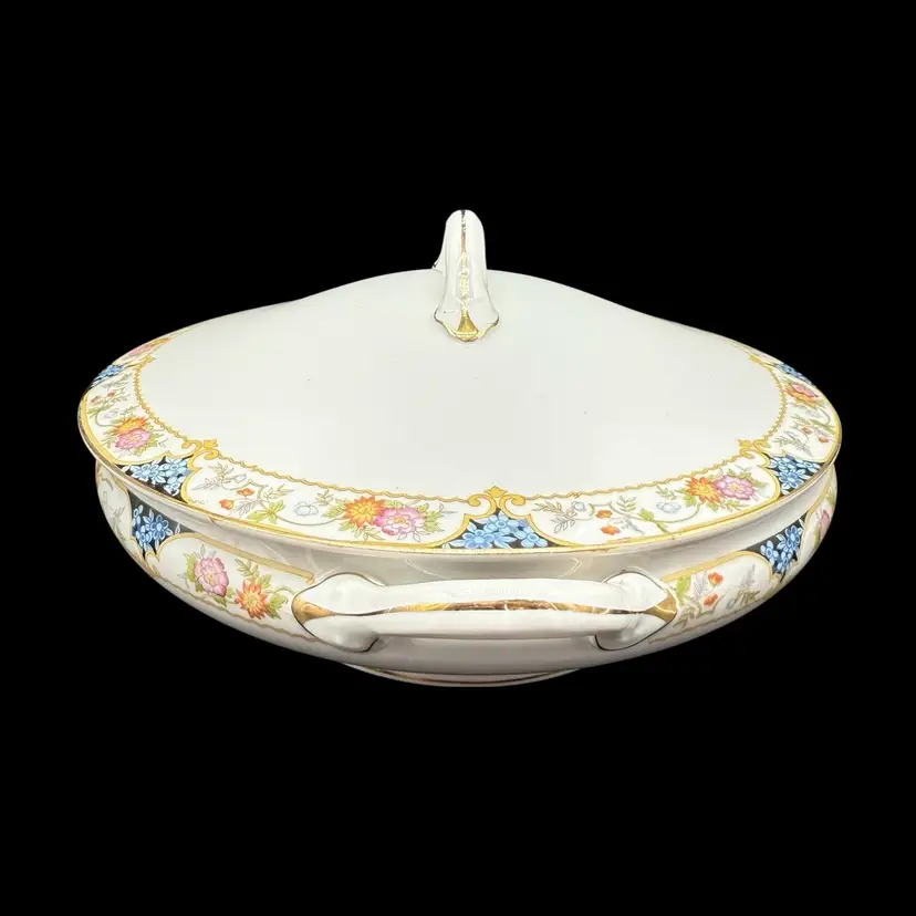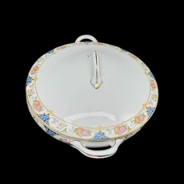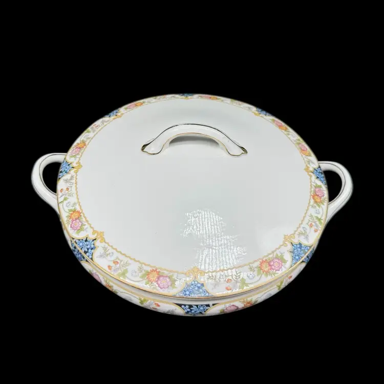This antique 1910s The Magenta by Noritake Morimura hand painted round covered dish is a beautiful addition to any table setting. Made of porcelain, this dish features a multicolor flower pattern, hand painted with a gold trim. Originating from Japan, this collectible piece is perfect for all occasions and adds a touch of elegance to any dining experience.