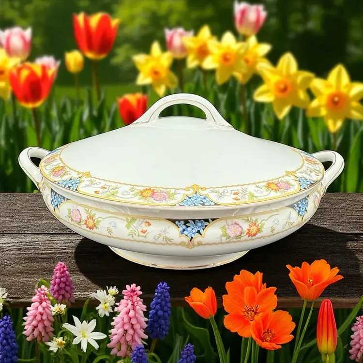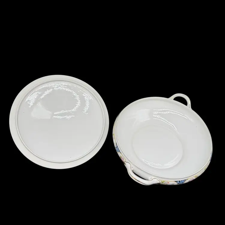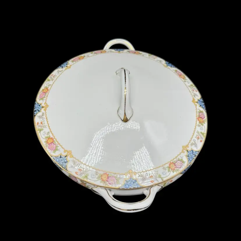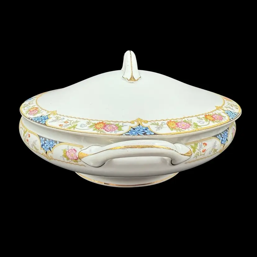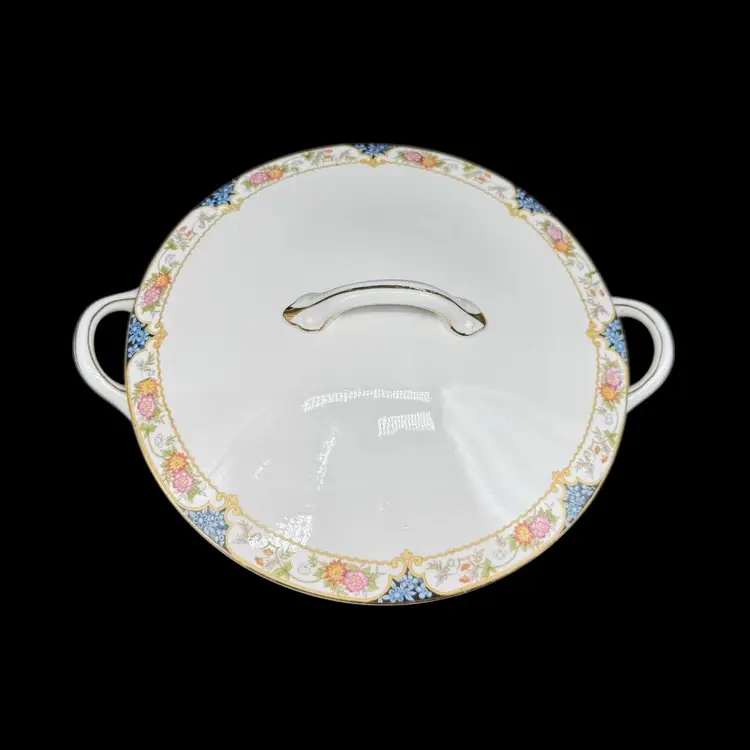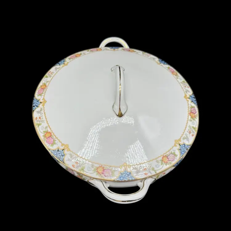 This antique 1910s The Magenta by Noritake Morimura hand painted round covered dish is a beautiful addition to any table setting. Made of porcelain, this dish features a multicolor flower pattern, hand painted with a gold trim. Originating from Japan, this collectible piece is perfect for all occasions and adds a touch of elegance to any dining experience.