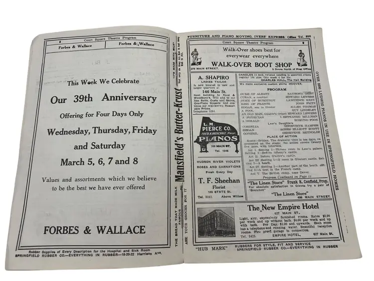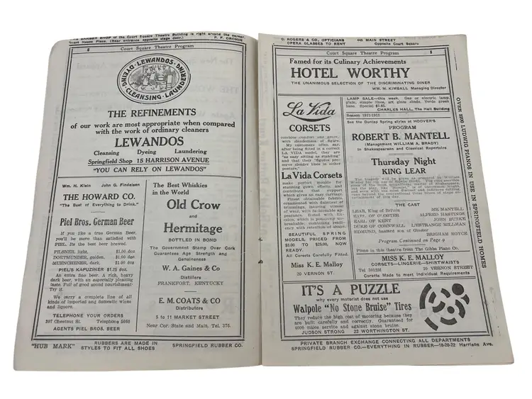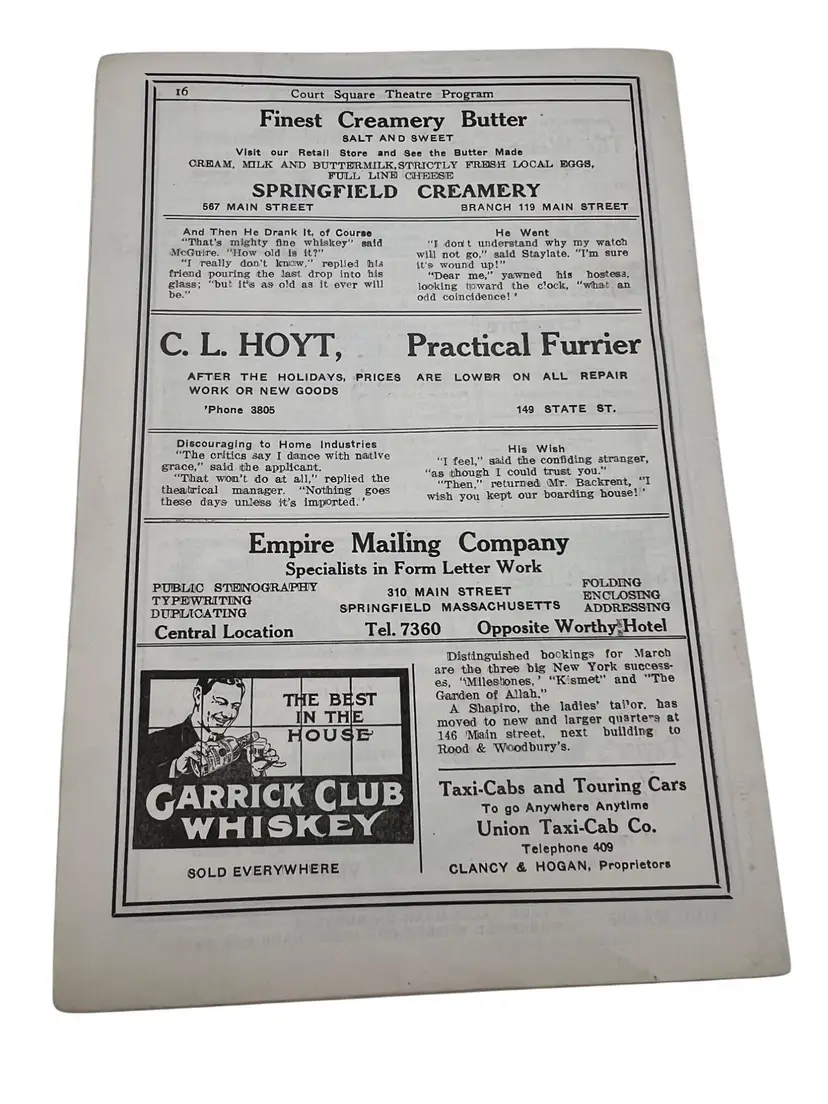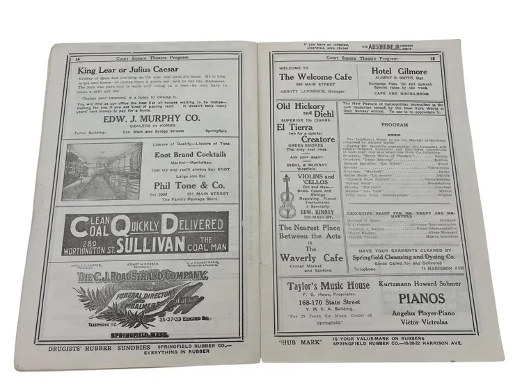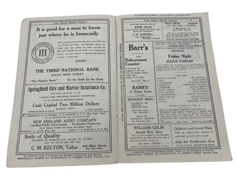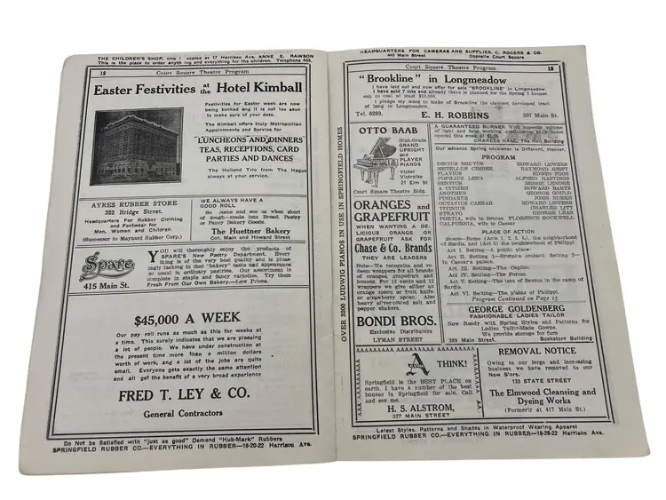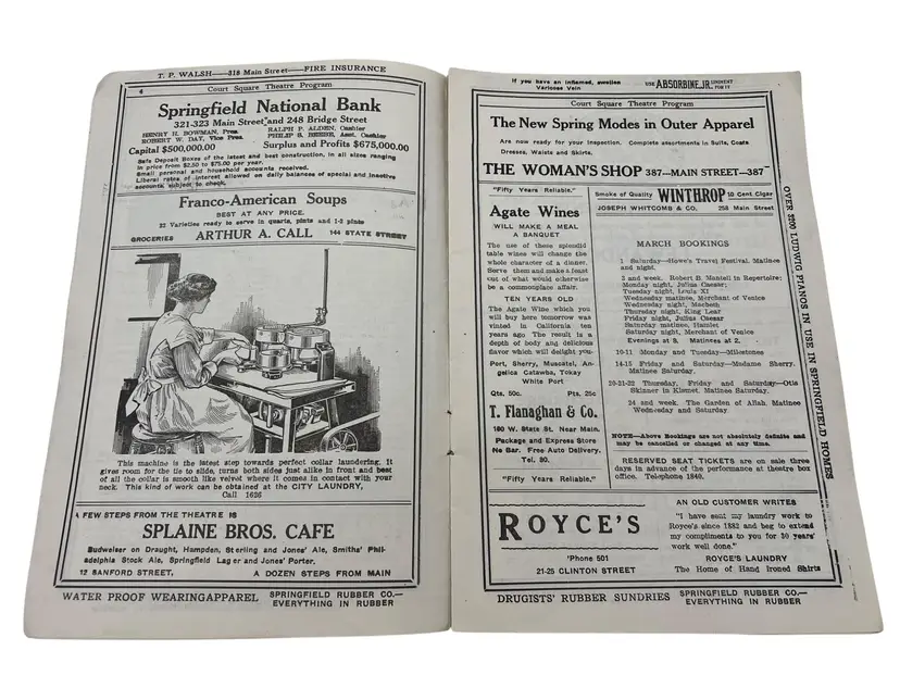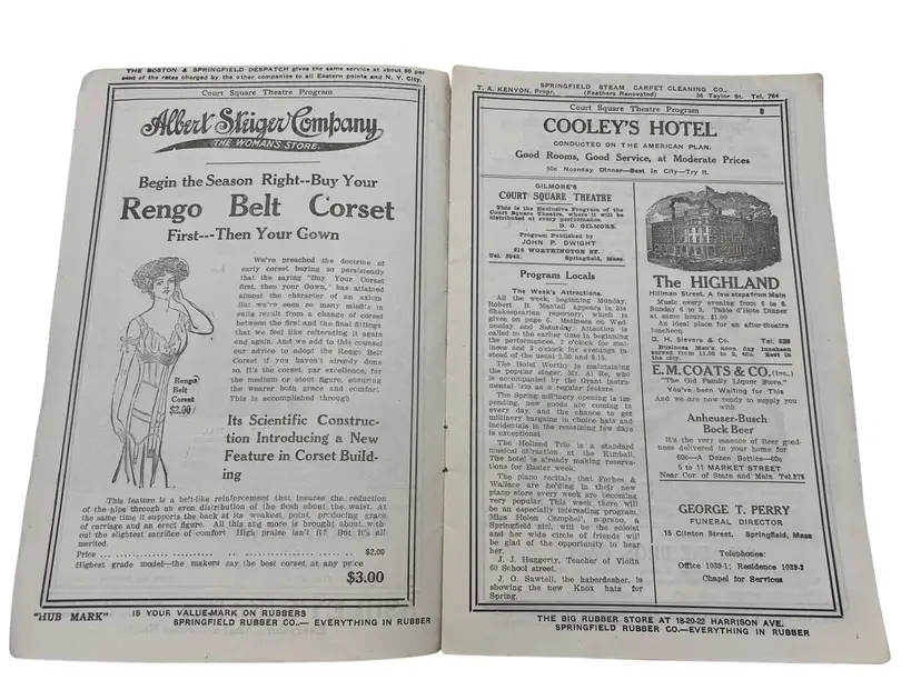 Discover a piece of history from Springfield, Massachusetts vibrant past with this 1913 Court Square Theatre program. Ideal for ephemera collectors and history enthusiasts. The Court Square Theater opened on September 21,1892 and was closed/demolished in 1956. Features lots of advertisements from 1913.