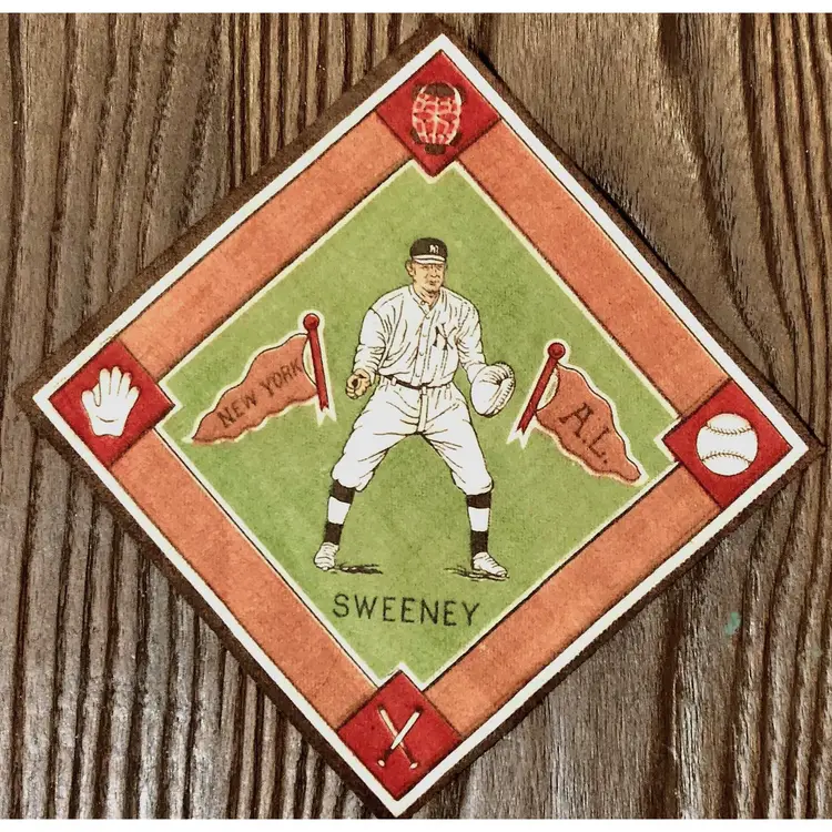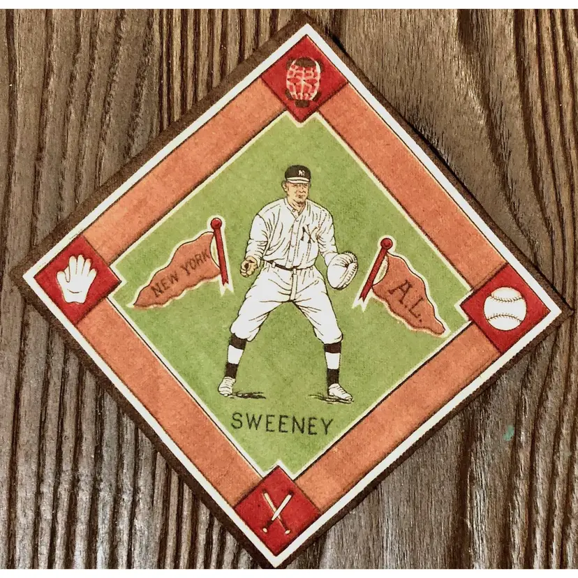 ✅ Player: Ed Sweeney ✅ Team: New York Yankees (American League) ✅ Year Issued: 1914 ✅ Series: B18 Baseball Blanket Felt ✅ Material: Flannel/Felt ✅ Size: Approx. 5 ¼” x 5 ¼” ✅ Border Color: Red Border Green Variant Condition: EX MT
