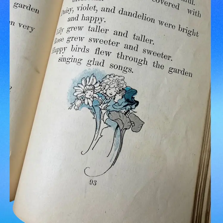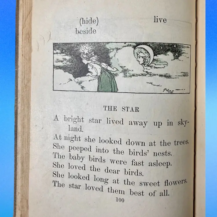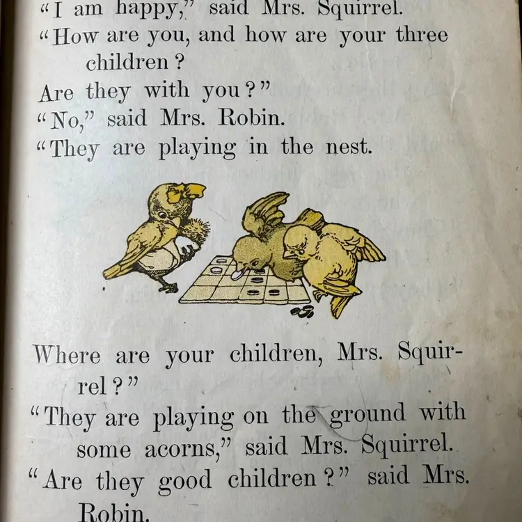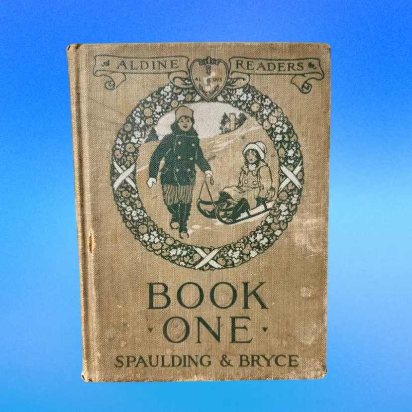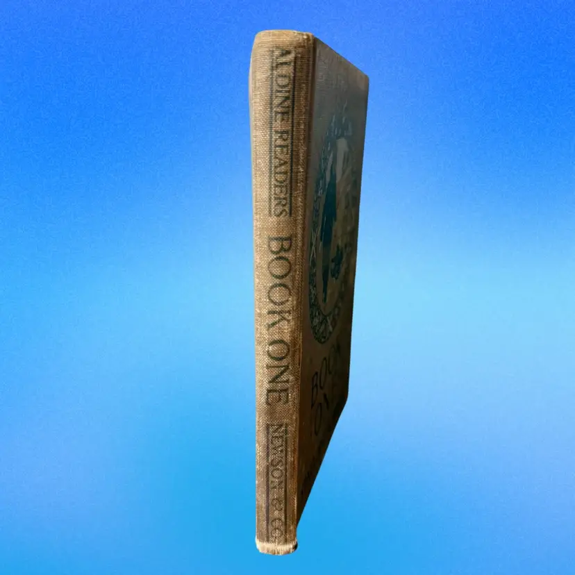 5.75"x7.5". 1916 Children’s reader book filled with various small illustrations in an art nouveau style. NOTE is in antique condition with wear consistent with age - some pages are ripped or have discoloration. Cover has wear as well. Binding is pretty good for its age, book isn’t falling apart. Has writing in front from a library & previous owner signature.