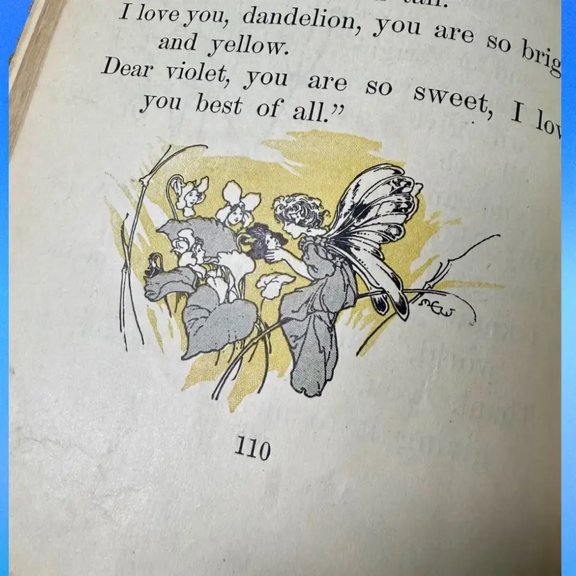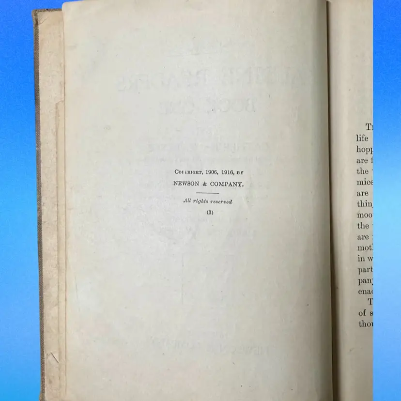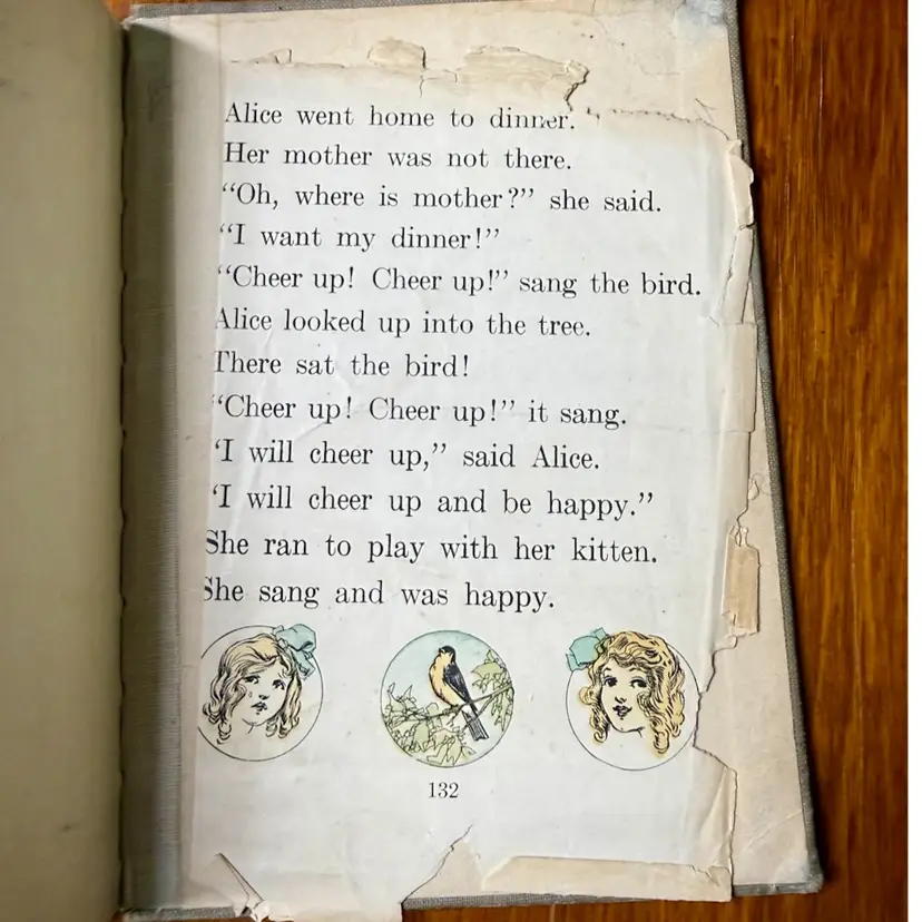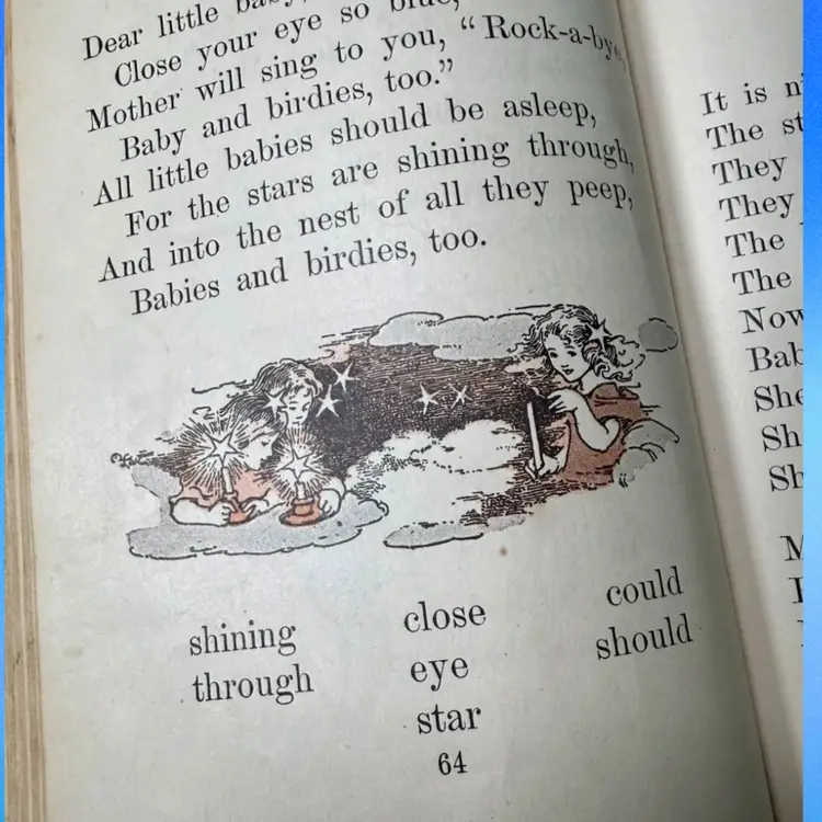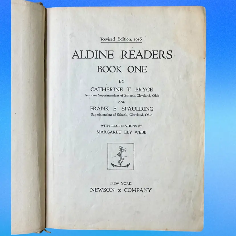 5.75"x7.5". 1916 Children’s reader book filled with various small illustrations in an art nouveau style. NOTE is in antique condition with wear consistent with age - some pages are ripped or have discoloration. Cover has wear as well. Binding is pretty good for its age, book isn’t falling apart. Has writing in front from a library & previous owner signature.