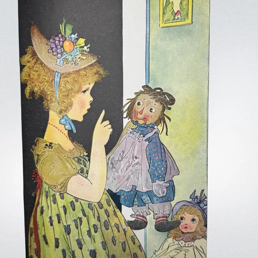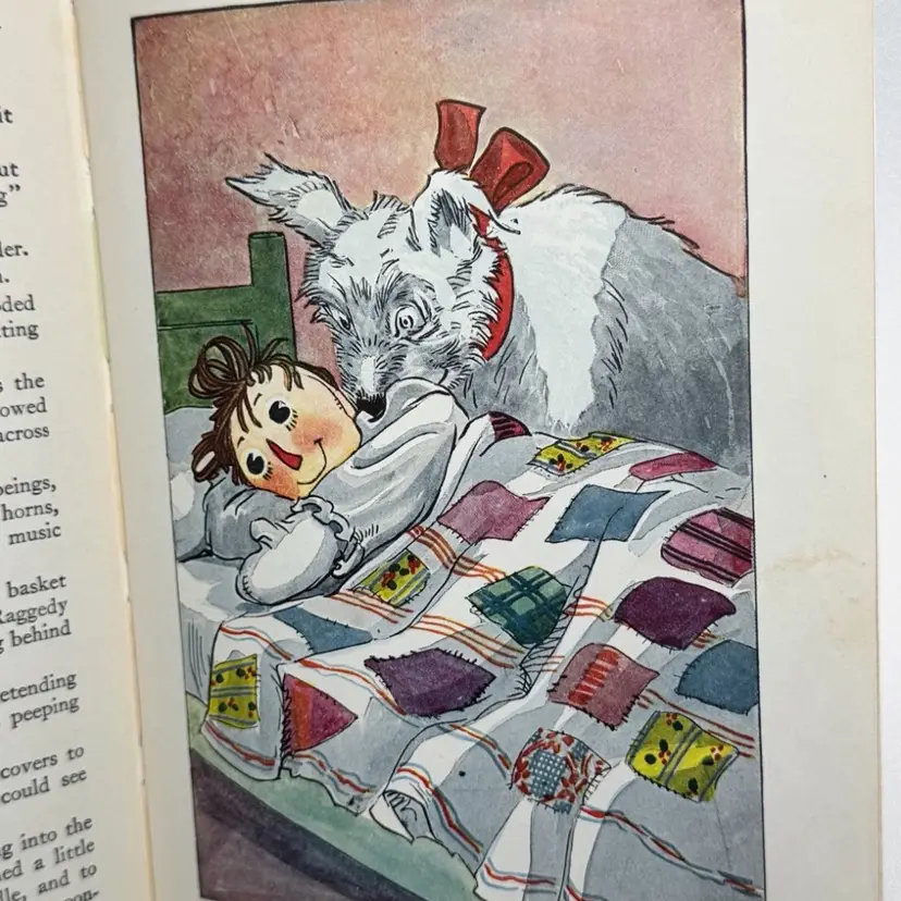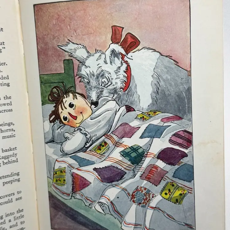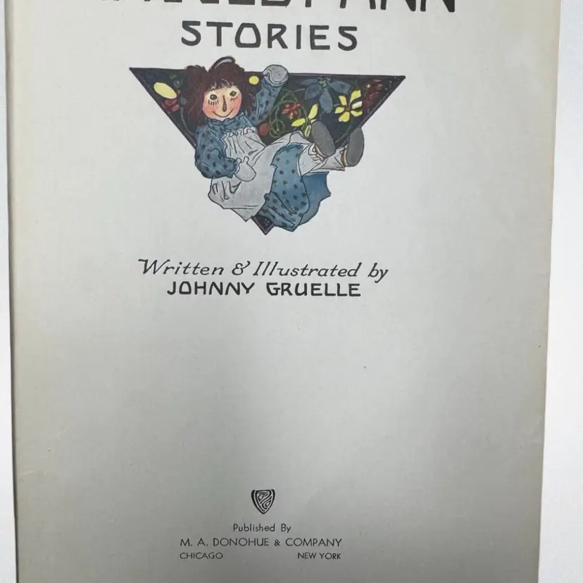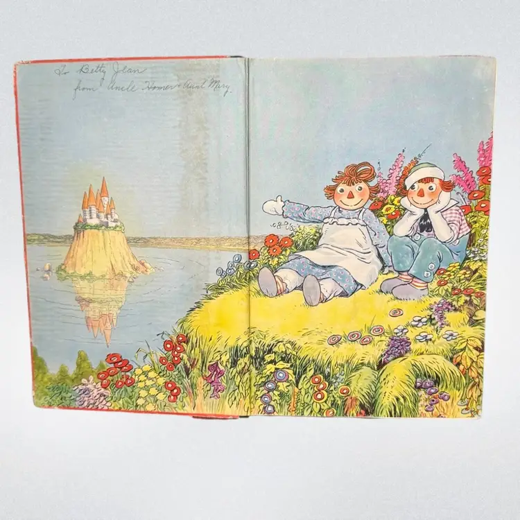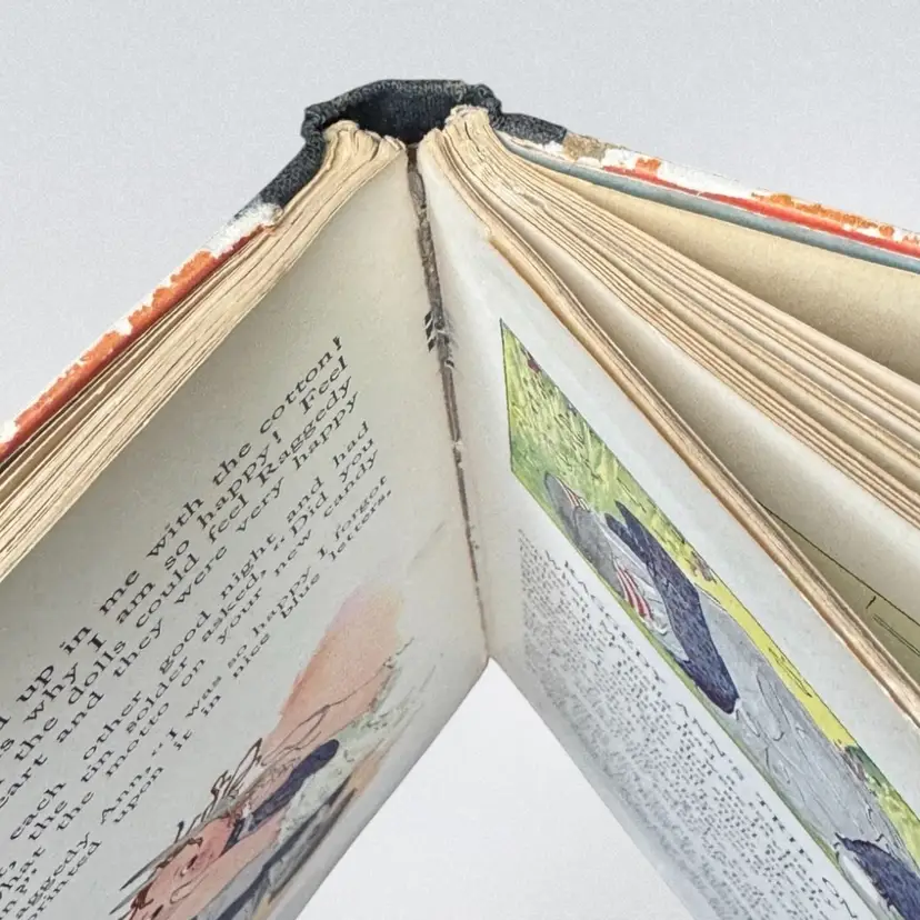 This Raggedy Ann story book is in such good condition considering it is from 1918. The book was inspired by a rag doll found by Johnny Gruelle in 1918. The book chronicles the adventures of Raggedy Ann and her toy friends. The color pictures are vibrant and adorable. There is minimal wear to the spine. There are a couple pages that have a tear but very minimal.