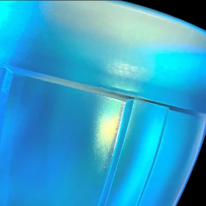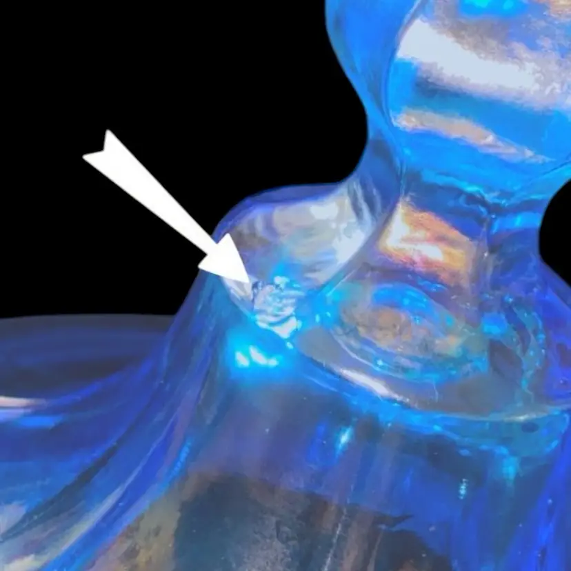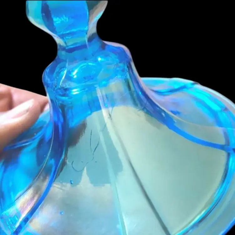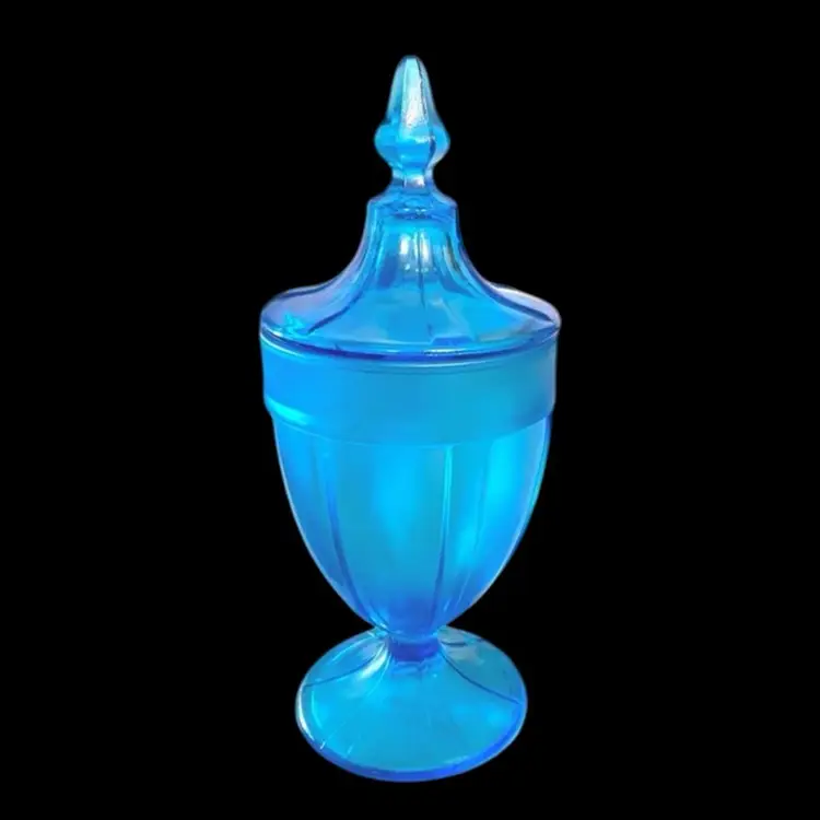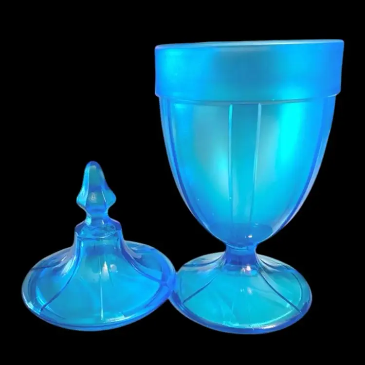 •1920s-30s Fenton glass Celeste blue stretch lidded candy jar •Celeste blue stretch was Re-released in 1990s for an anniversary collection, however this is an original 20s/30s piece as it is not stamped •stretch glass: an effect similar to carnival glass, but instead of leaving it very metallic, it leaves it iridescent and with a crackled or textured finish anywhere the glass has been reshaped while hot •only issue is a tiny flea bite below finial that may have happened during manufacturing; also has straw marks (common)