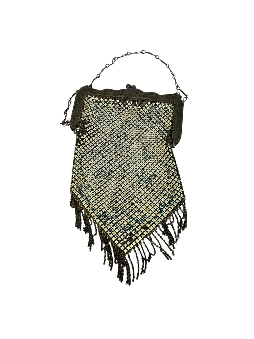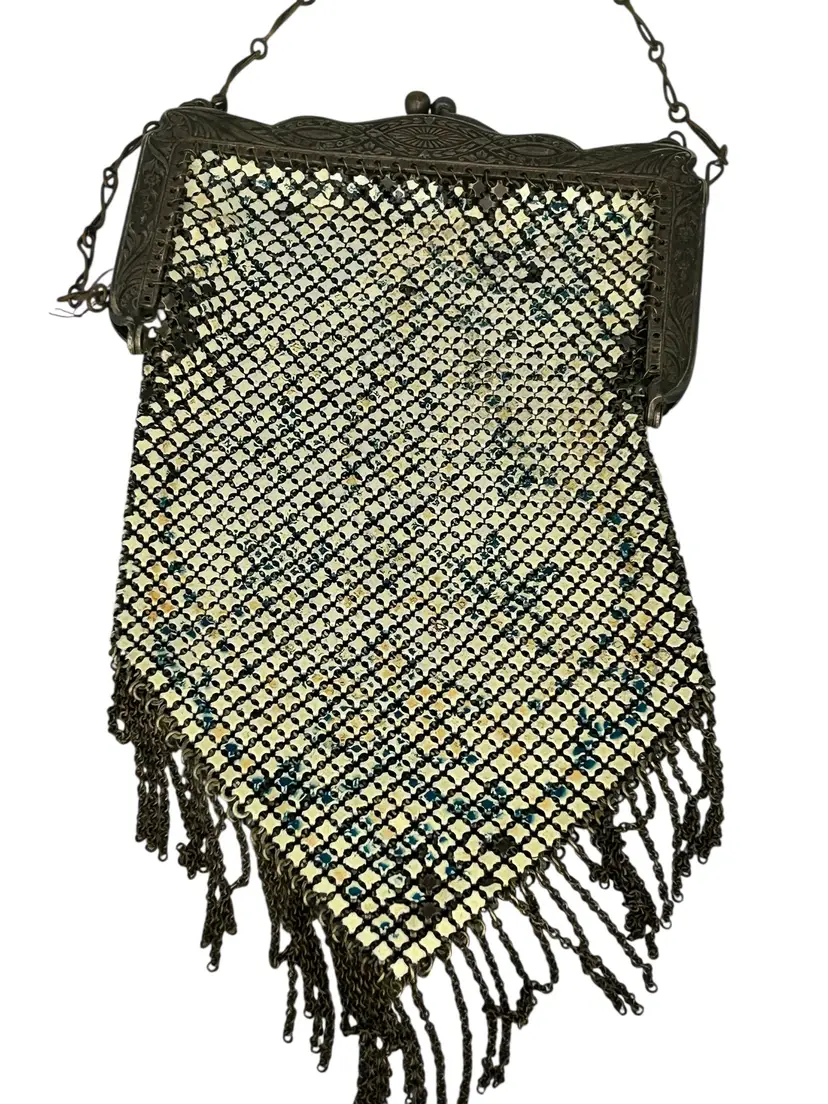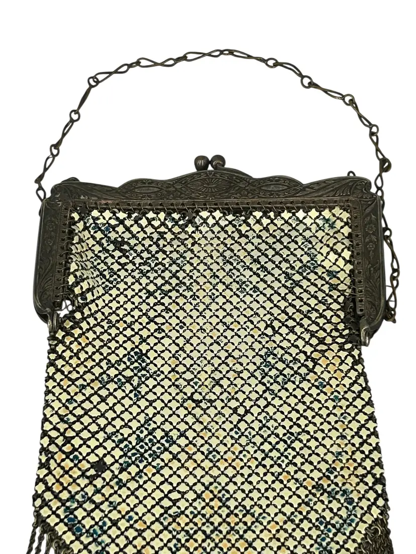 Fair condition Exquisite 1920s Mandalian metal mesh purse. It features a unique enameled design with blue and beige accents on a dark background. This flapper-era evening bag boasts a classic fringe detail at the bottom and an ornate metal frame with a delicate chain handle. The clasped opening reveals a mesh interior pocket.