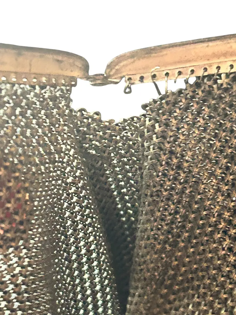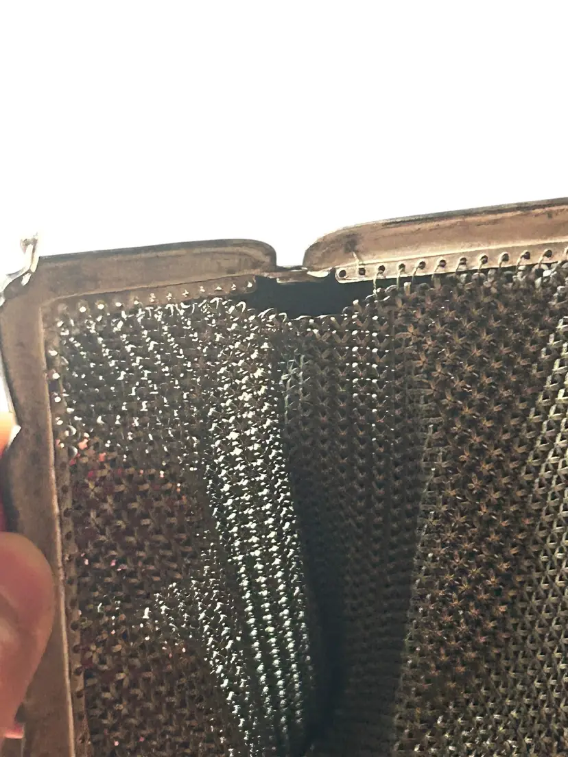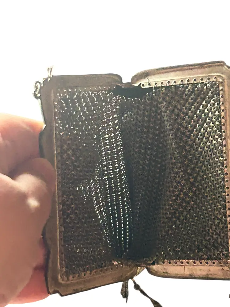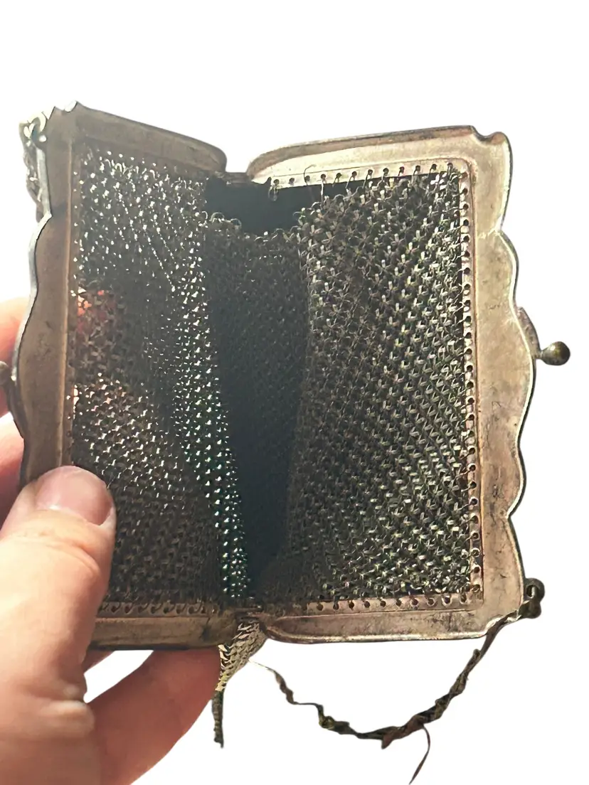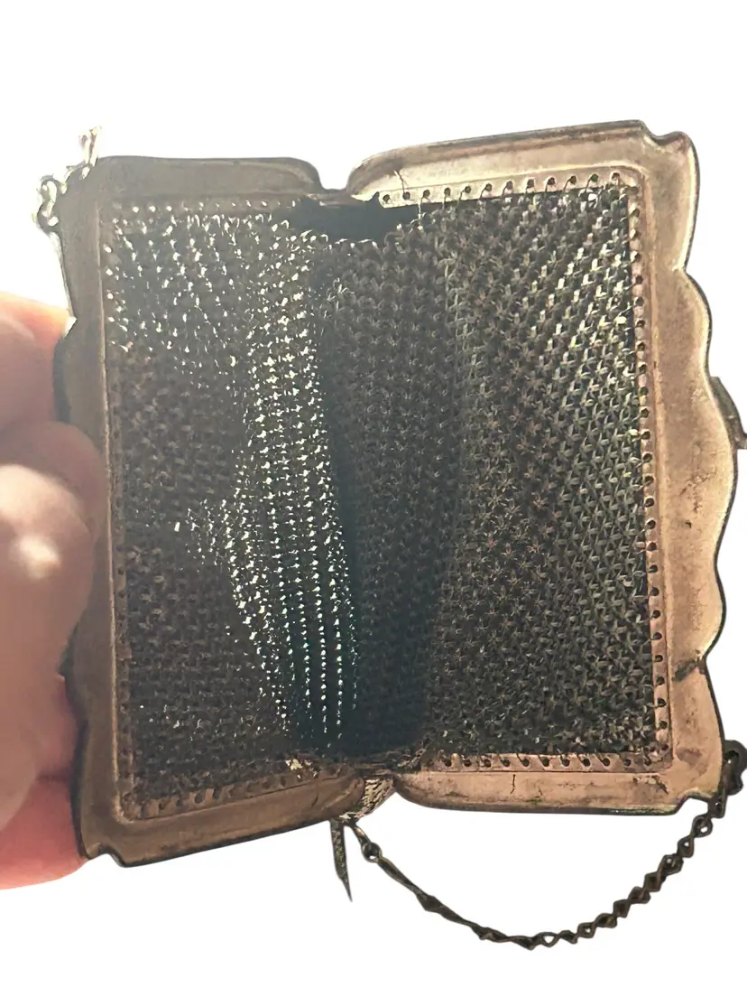 This vintage piece is in damaged pre-owned condition, showing some wear consistent with its age, including minor enamel loss in areas and typical patina on the metal frame and chain. The clasp functions well. The mesh is detaching on sides. Please see photos for details. This is a beautiful and rare find for collectors of antique accessories or anyone seeking a unique statement piece with historical charm!