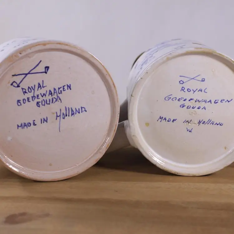 Both are signed underneath Royal Goedewaagen Gouda, Made in Holland and have the original white metal lids. There are potters throwing rims on the inside of the mugs.