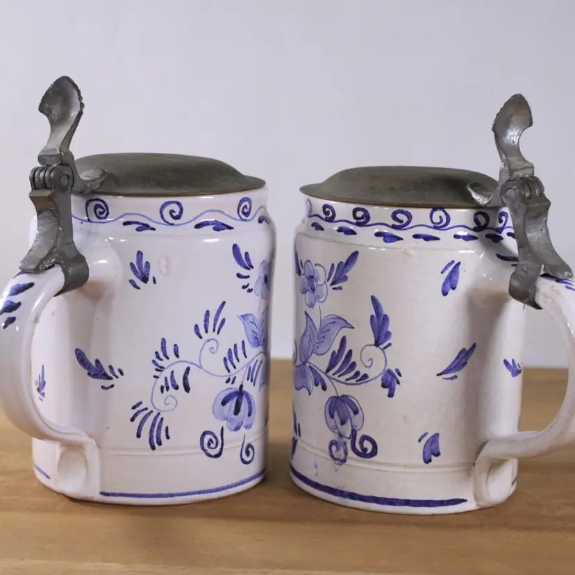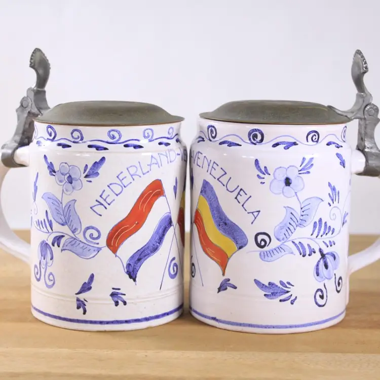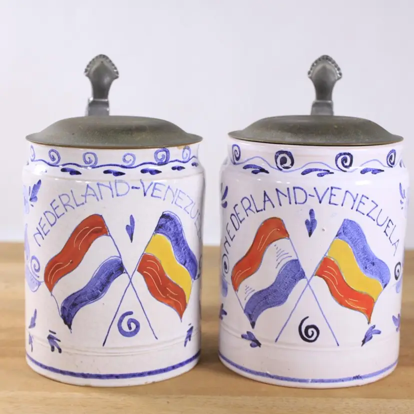These tin glazed Dutch Delft tankards were made in 1921 to commemorate the establishment of diplomatic relations relations between the governments of the Netherlands and Venezuela following a treaty to that effect concluded at Caracas on 11 May 1920. They are hand thrown on a potters wheel and painted with typical Delft blue motifs around the Dutch and Venezuelan flags - a fantastic piece of history!