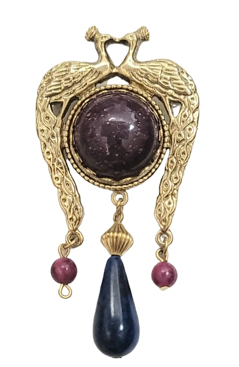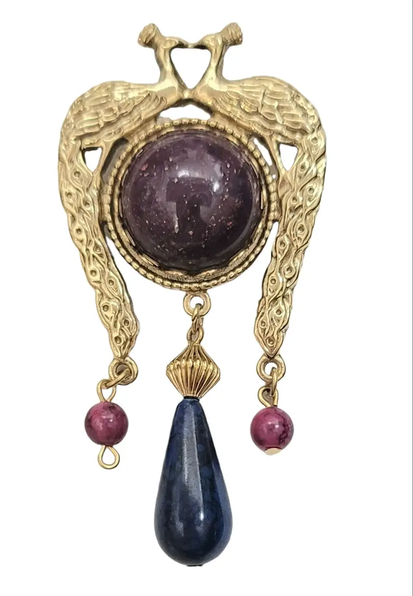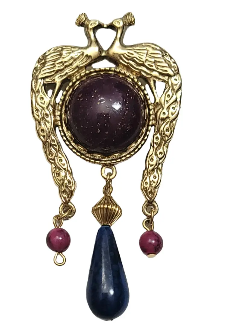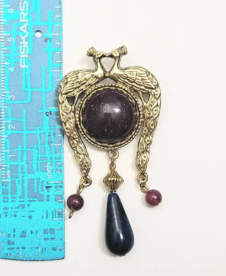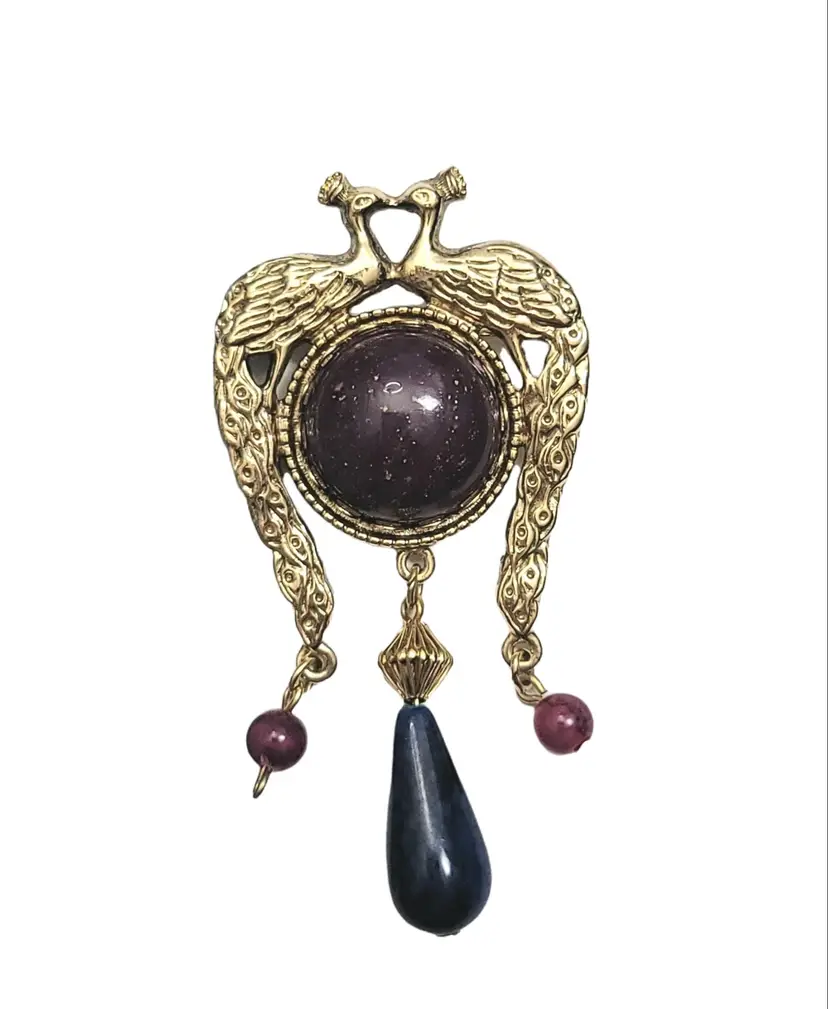 Peacocks are a symbol of elegance and noble, and this unique brooch is always perfect for a sweater, a dress for evenings and so much more. This vintage Peacock brooch features two peacocks facing each other, a round crystal at the center with a teardrop, and round dangling beads. Measure approximately 3-inch high. The pin functions properly. This brooch is in vintage condition.