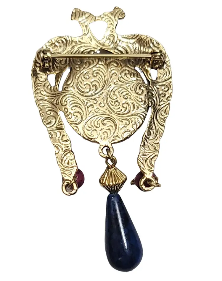 1928 Peacock Gold Tone Wine Blue Rhinestone Dangle Brooch