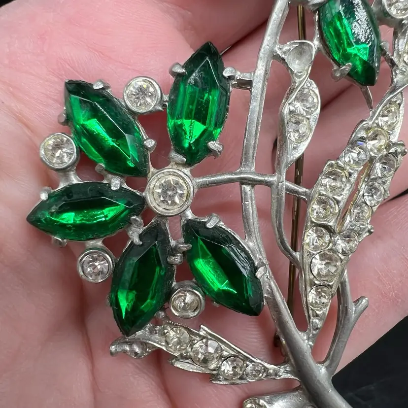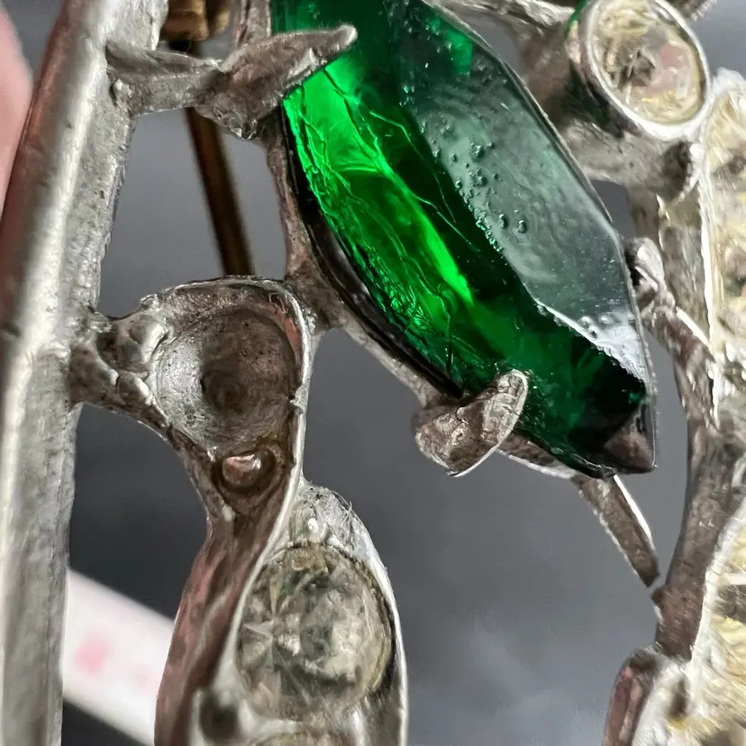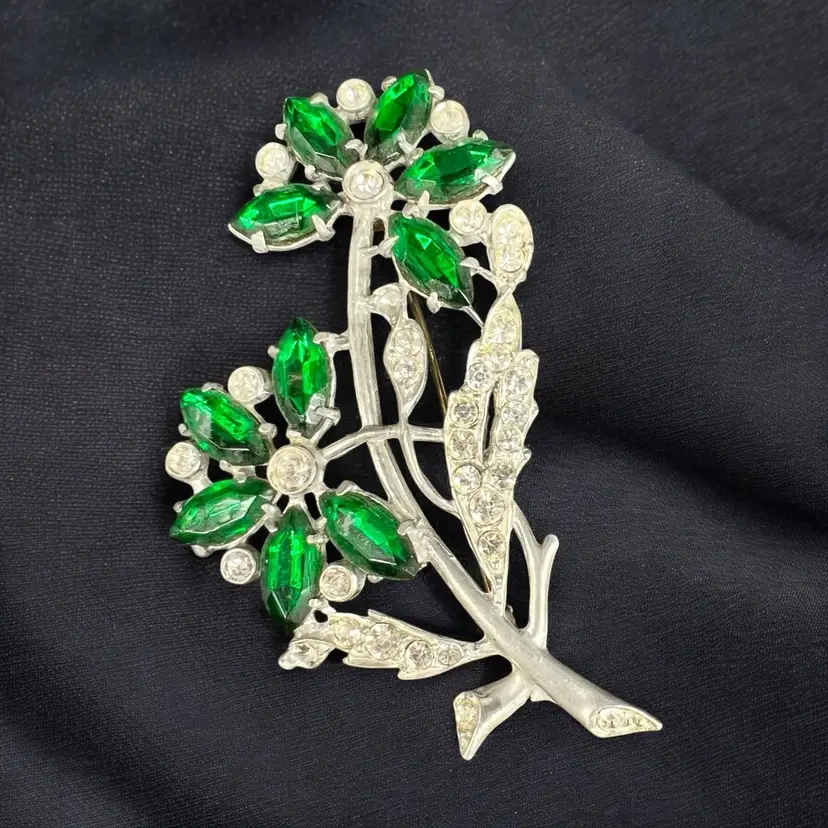 Adorn your ensemble with a touch of vintage elegance with this stunning 1930s Art Deco Czech Glass Pot Metal Flower Brooch Pin. The exquisite green glass marquise stone, prong-set in a lustrous pot metal setting, captures the essence of the era's flair for beauty and sophistication. The foil back enhances the stone's vibrant hue, creating a dazzling display that's sure to draw the eye.