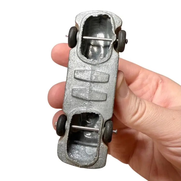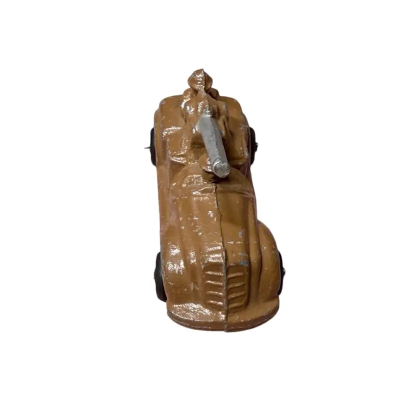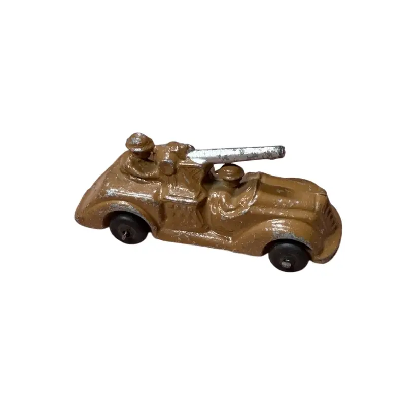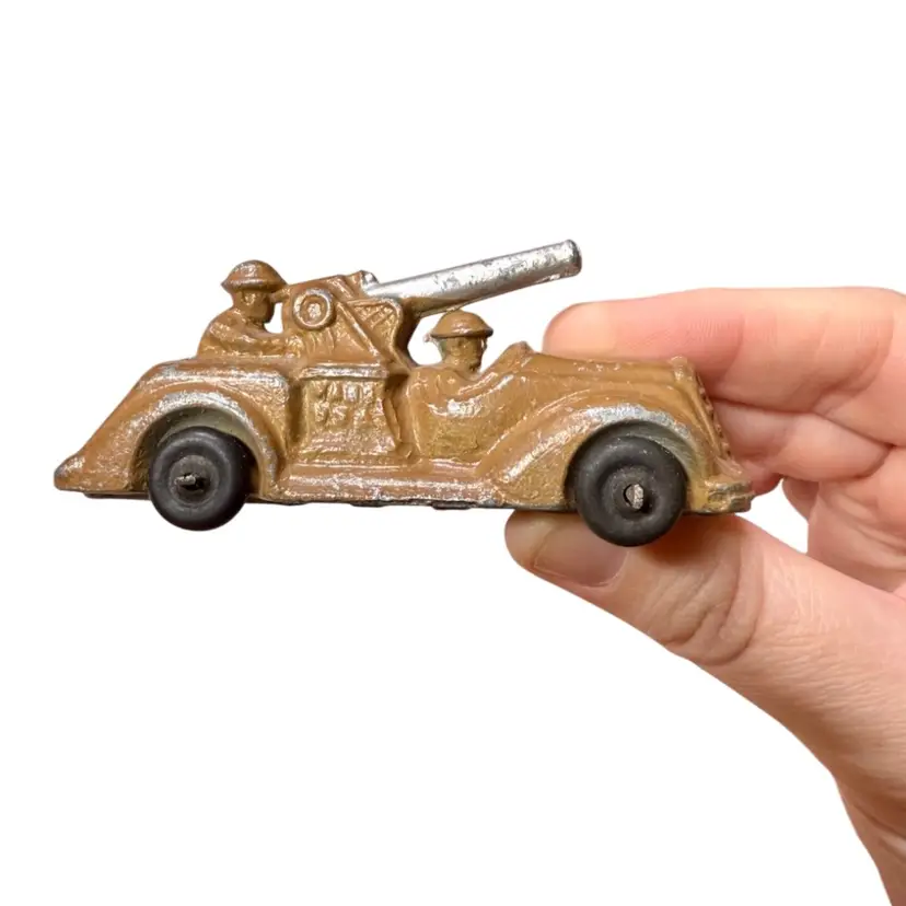 3.5”x1”x1.5”. 1930’s Barclay metal toy military truck, featuring figures in the car with a big cannon on top. Has minor wear consistent with age.