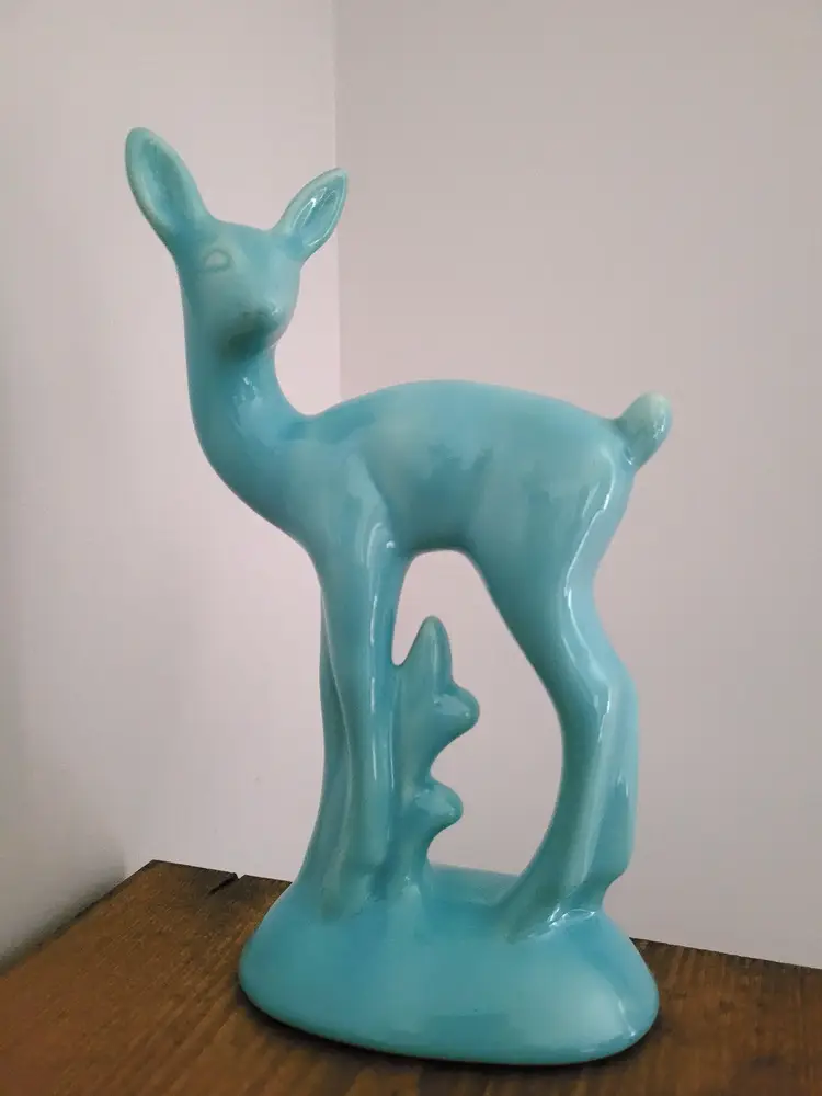 1930s Vintage Baby Blue Deer Figure standing by a small tree. A delightful figure to adorn your china cabinet or perhaps your bedroom. There are three pontil marks along with a scribble , which could be some sort of signature, located on the base. Stands at 8.25" high. The deer is in wonderful condition!