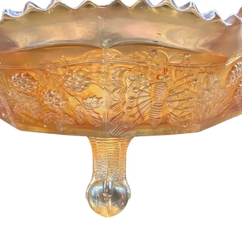 1930s Fenton Marigold Carnival Glass Bowl - Butterfly and Berry 4 Inches Tall