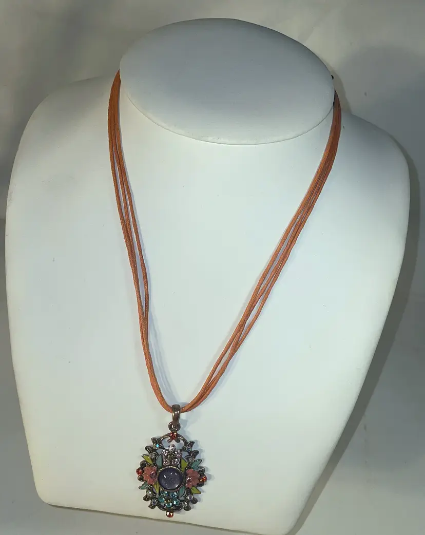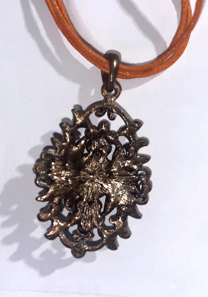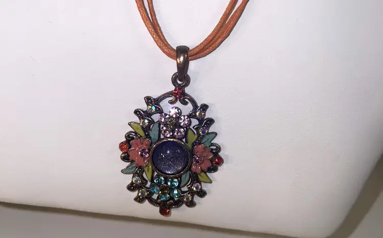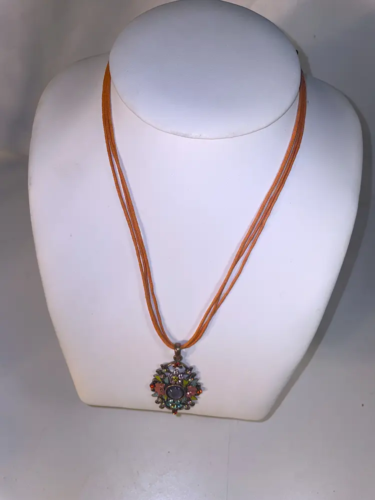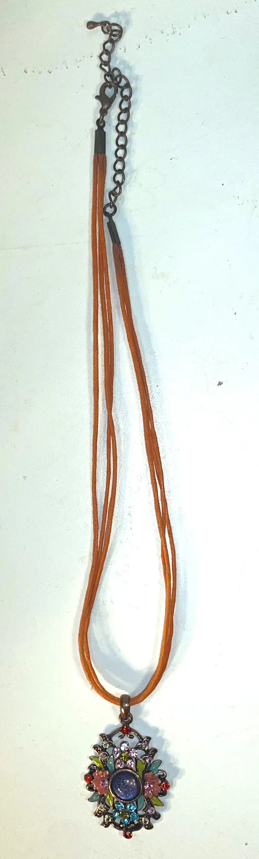 Antique 1930s medallion pendant necklace. Lovely filigree medallion with three dimensional leaves and flowers with cut glass centers of blue, red, yellow, green and pink. Spring ring closure. No maker's mark. Wonderful vintage condition. Slight patina in keeping with age. Slightly negotiable Possibility of shipping everywhere