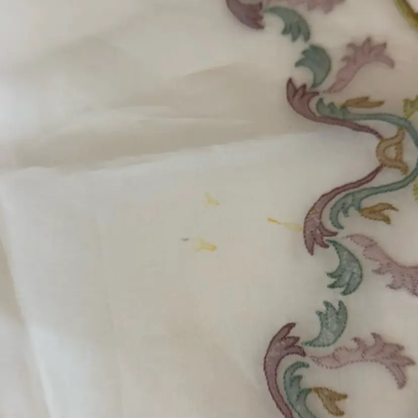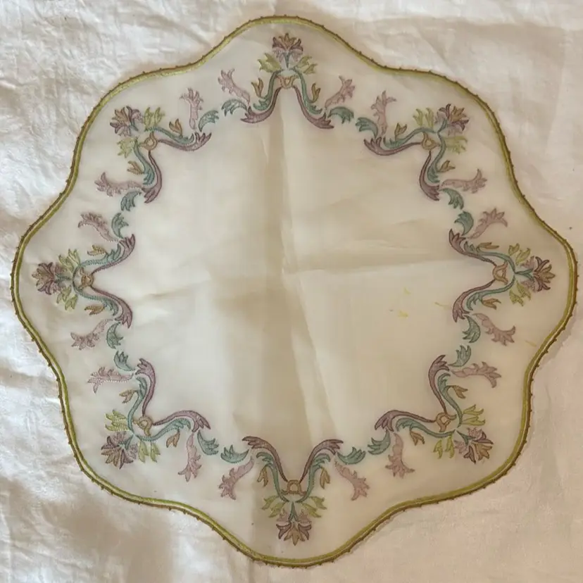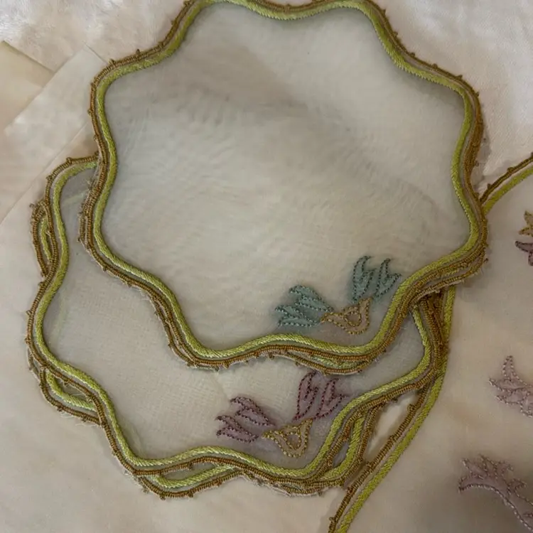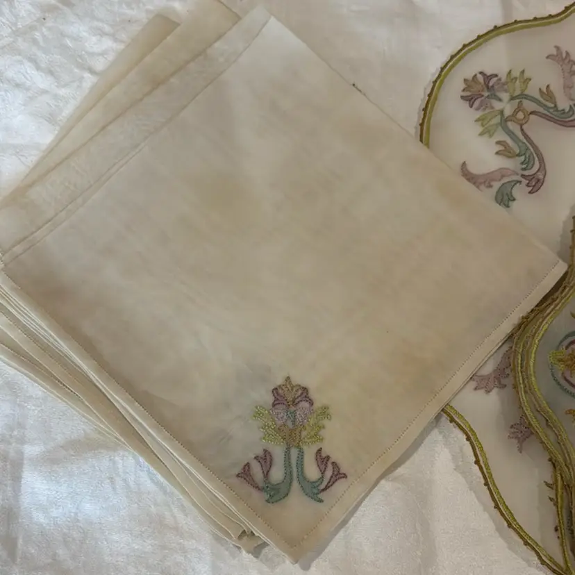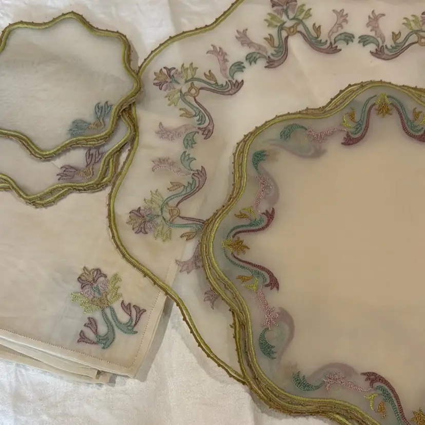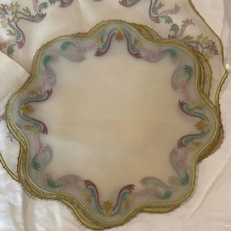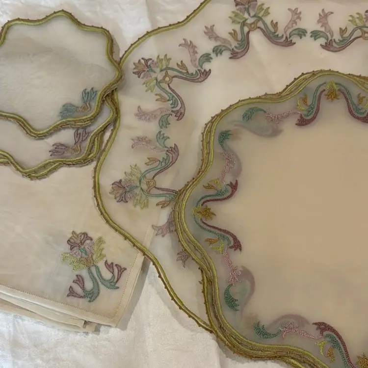 Excellent condition, small stains on large table mat as shown - could likely be hand washed out 1 large centerpiece mat 5 drink coasters 6 placemats 5 napkins