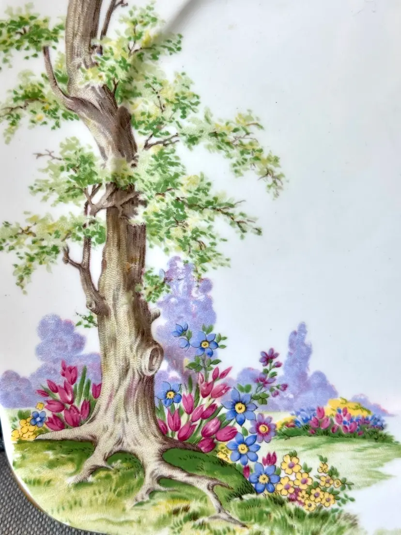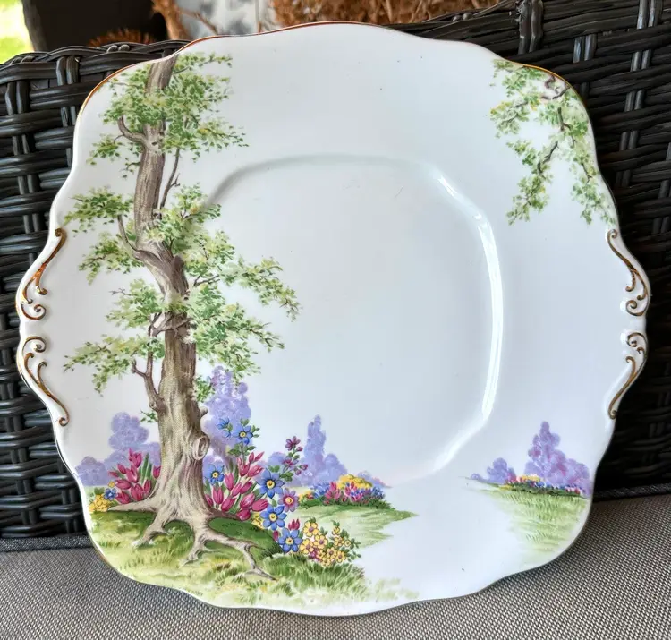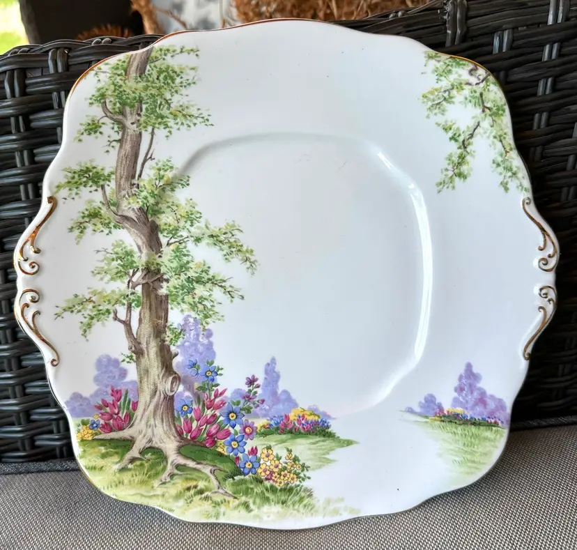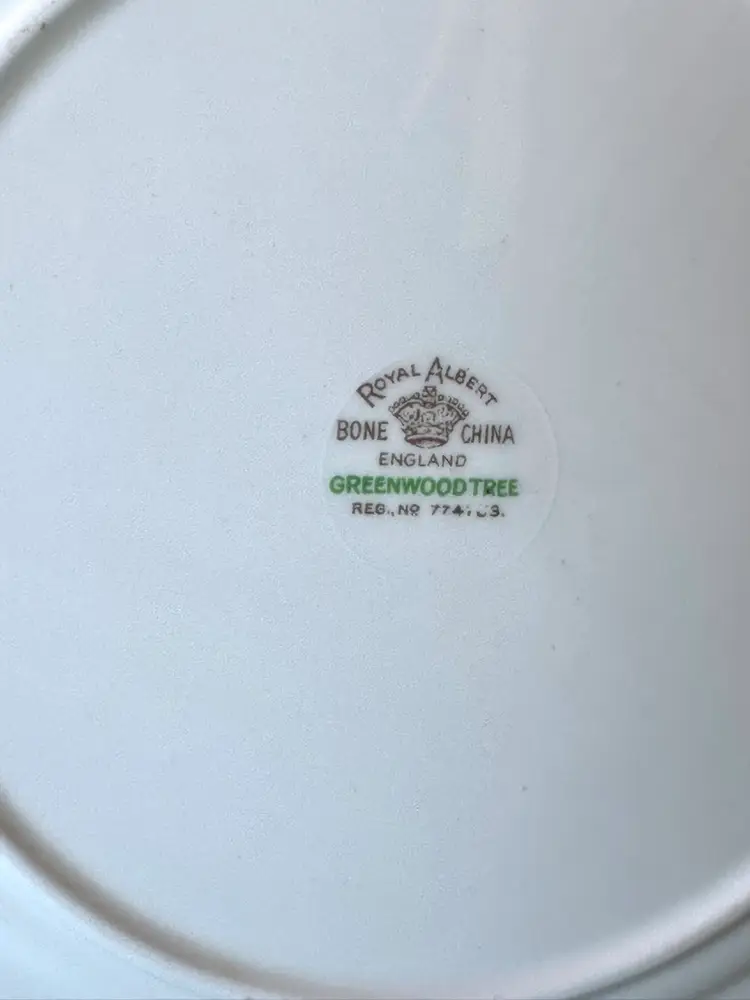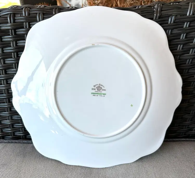 Lovely vintage Royal Albert cake plate in the Greenwood Tree pattern. It is 10” x 9”. No chips, cracks or repairs. Very good condition.