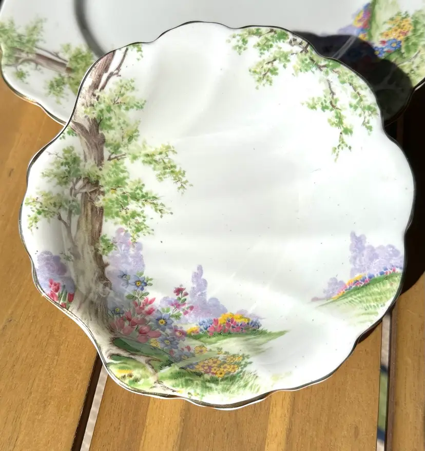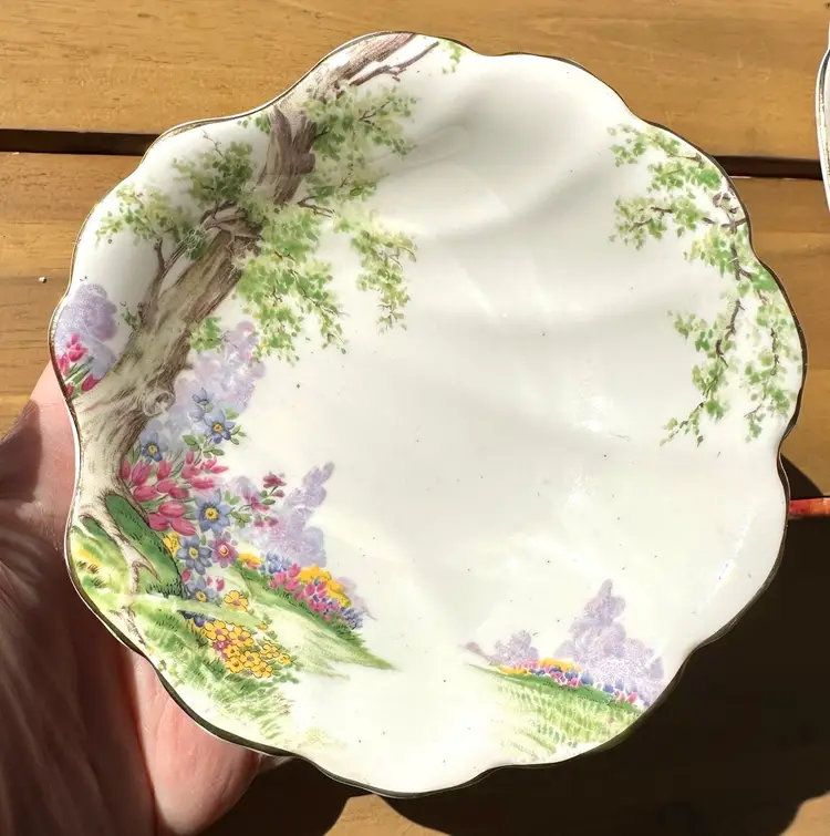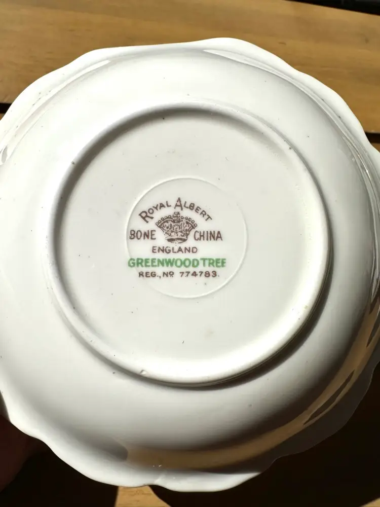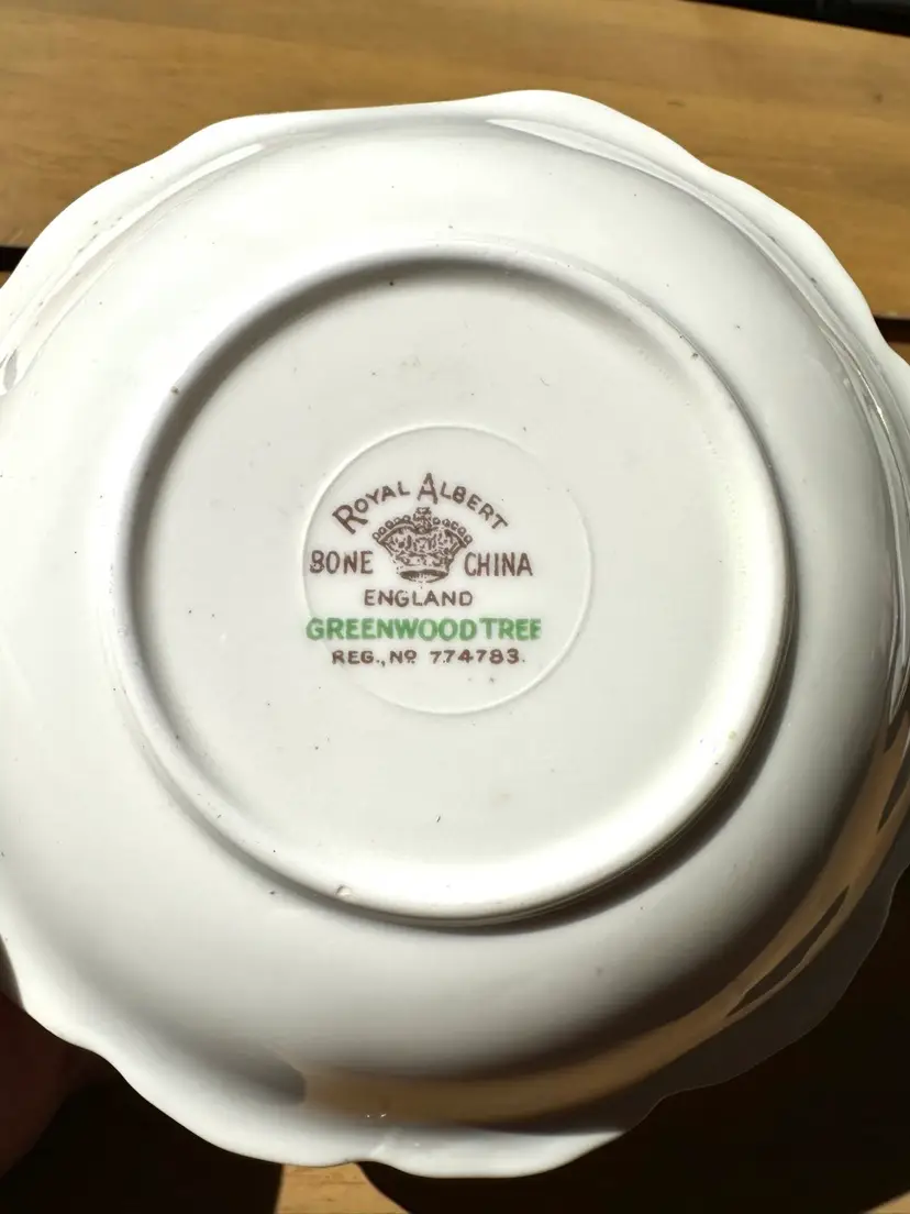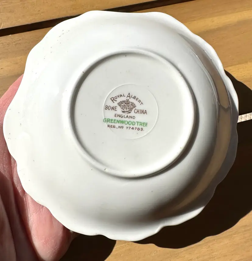 Sweet trinket dish made by Royal Albert England in the Greenwood tree pattern. It is scallop shell shaped and measures 5”. No chips, cracks or repairs. Very good condition.