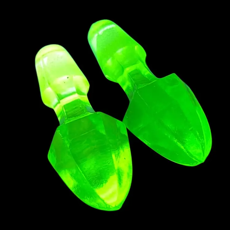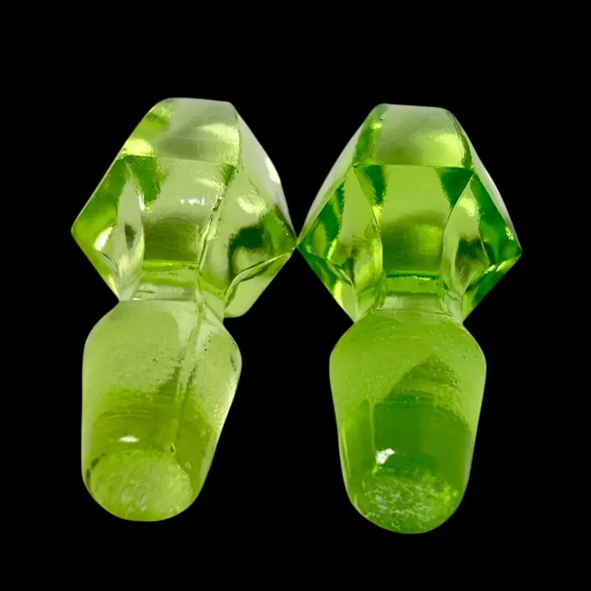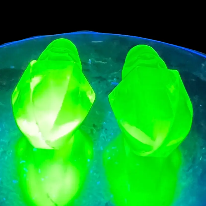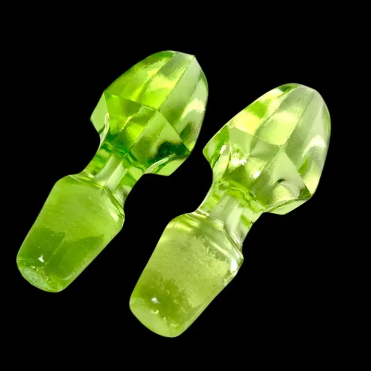 You get both! Hard to find just the stoppers! 1930s Uranium Anchor Hocking Cruet Stoppers. Incredible Green Glow Under UV Light. See the first two photos and the video for the glow! 6-sided Pointed. One is a lighter shade of green than the other. 2-1/2” length Weigh 1.5 ounces each. Condition: No chips/cracks. Lighter color stopper has a little rougher edges on the seams. Will consider selling separately- please message*