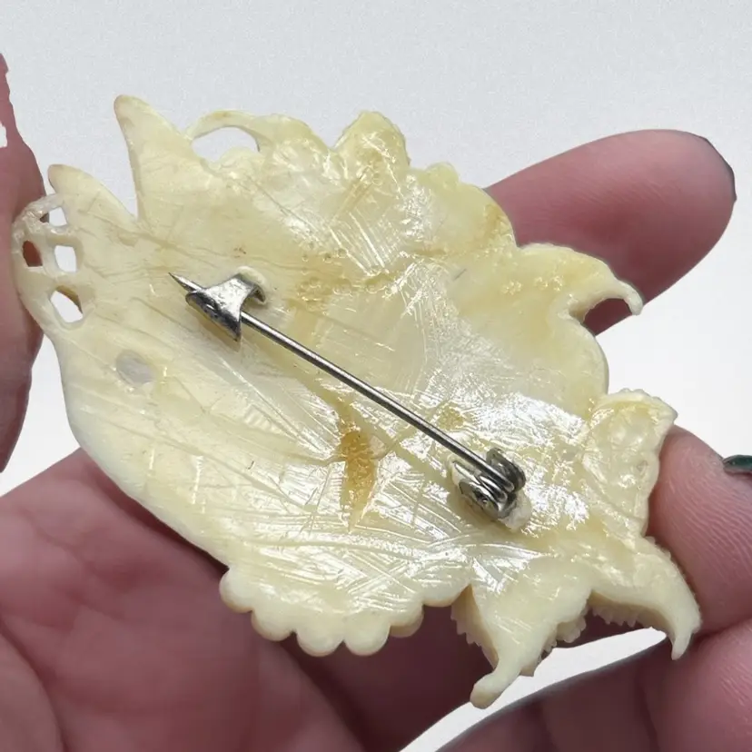 Notable Details • Authentic 1930s vintage • Made in Japan • Carved cream/ivory celluloid • Fruit basket / abundance motif • Dimensional, pierced carving • Original early pin back with metal end cap • Lightweight but substantial in appearance