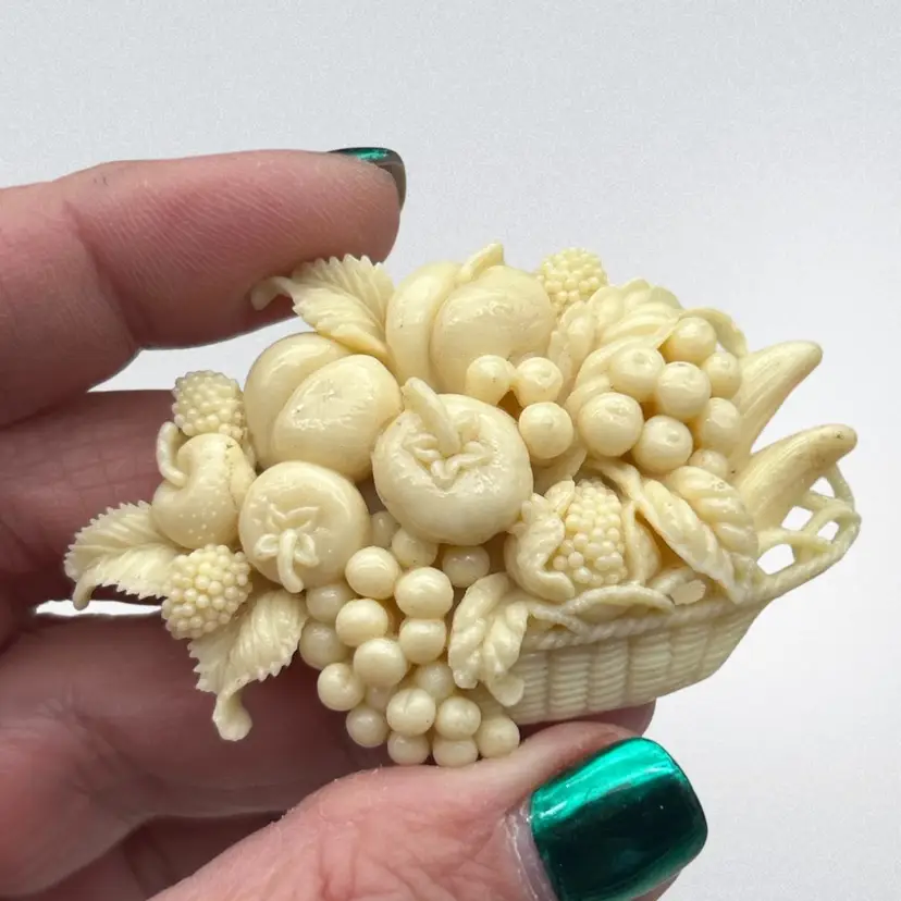 Charming and highly collectible vintage celluloid brooch dating to the 1930s, featuring a beautifully carved fruit basket motif symbolizing abundance and prosperity. This piece showcases exceptional detail—from apples and grapes to leaves and woven basket texture—crafted in a warm cream/ivory celluloid.