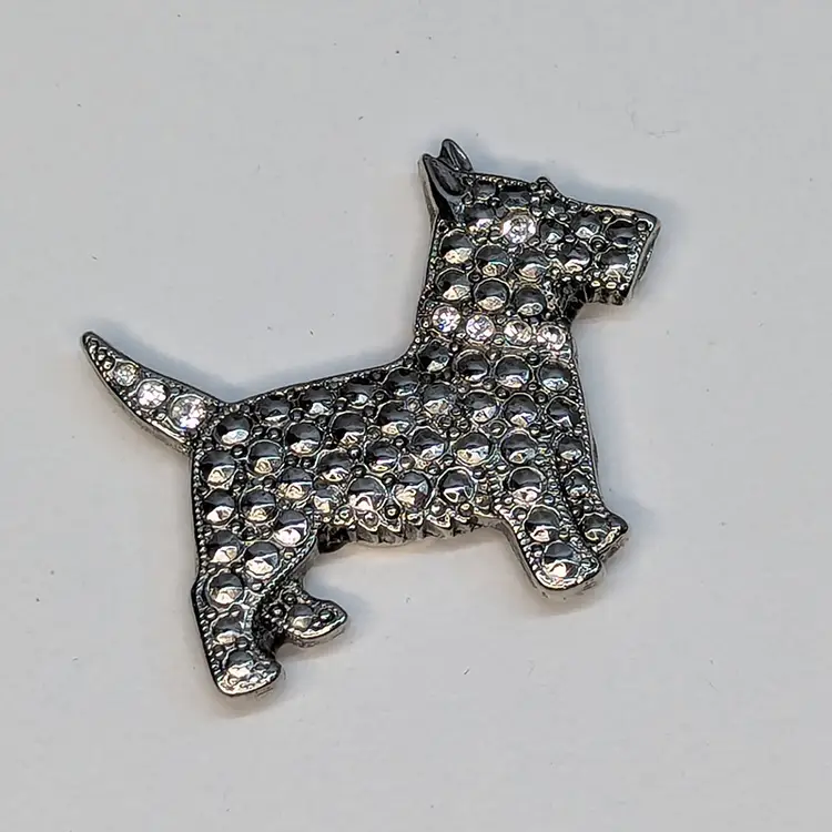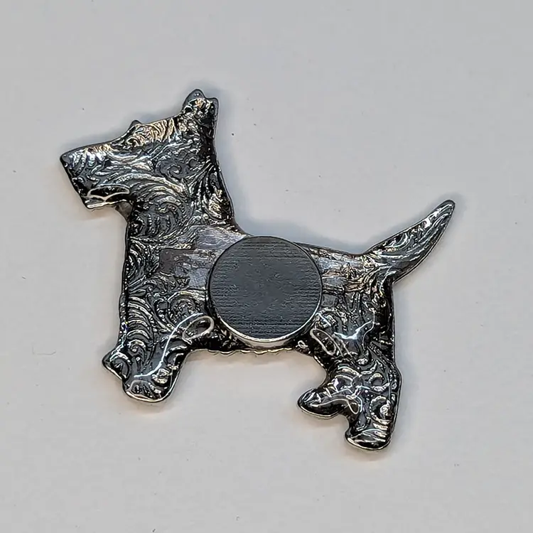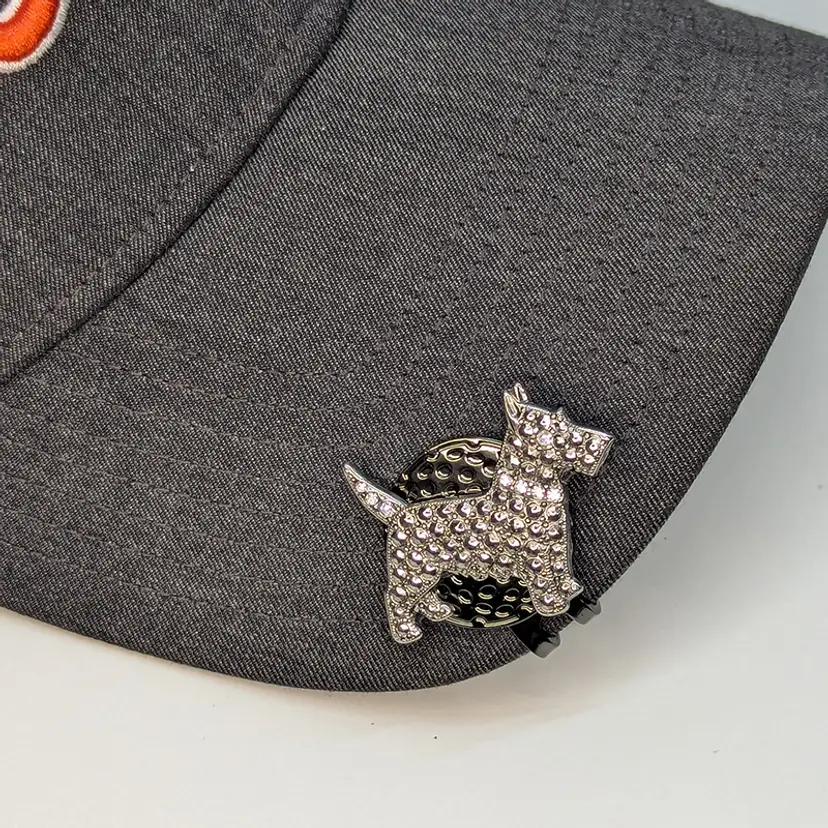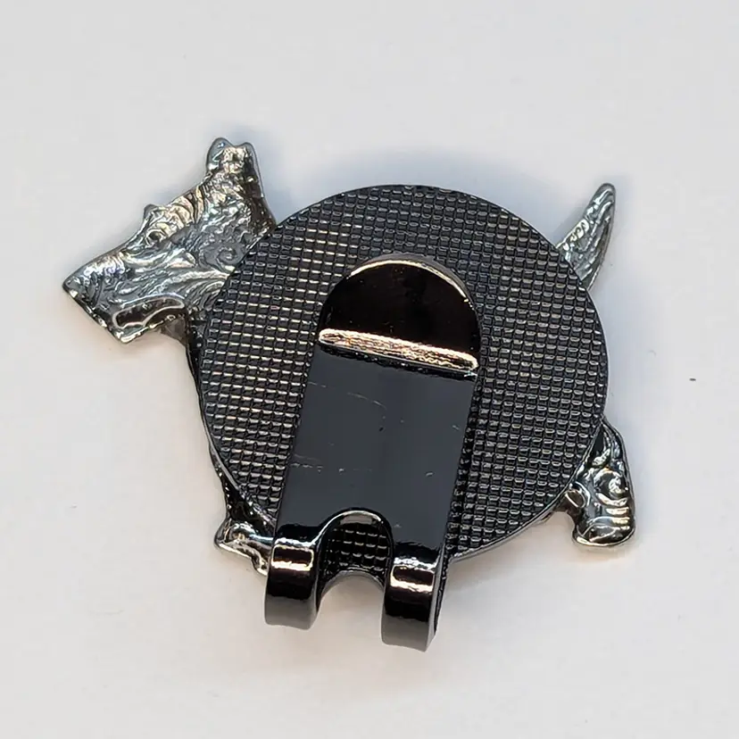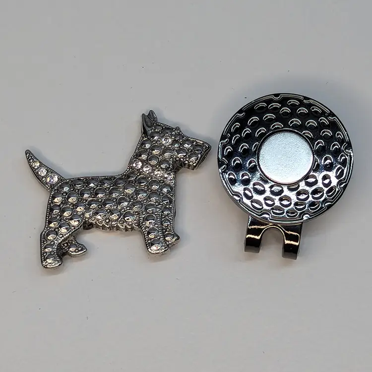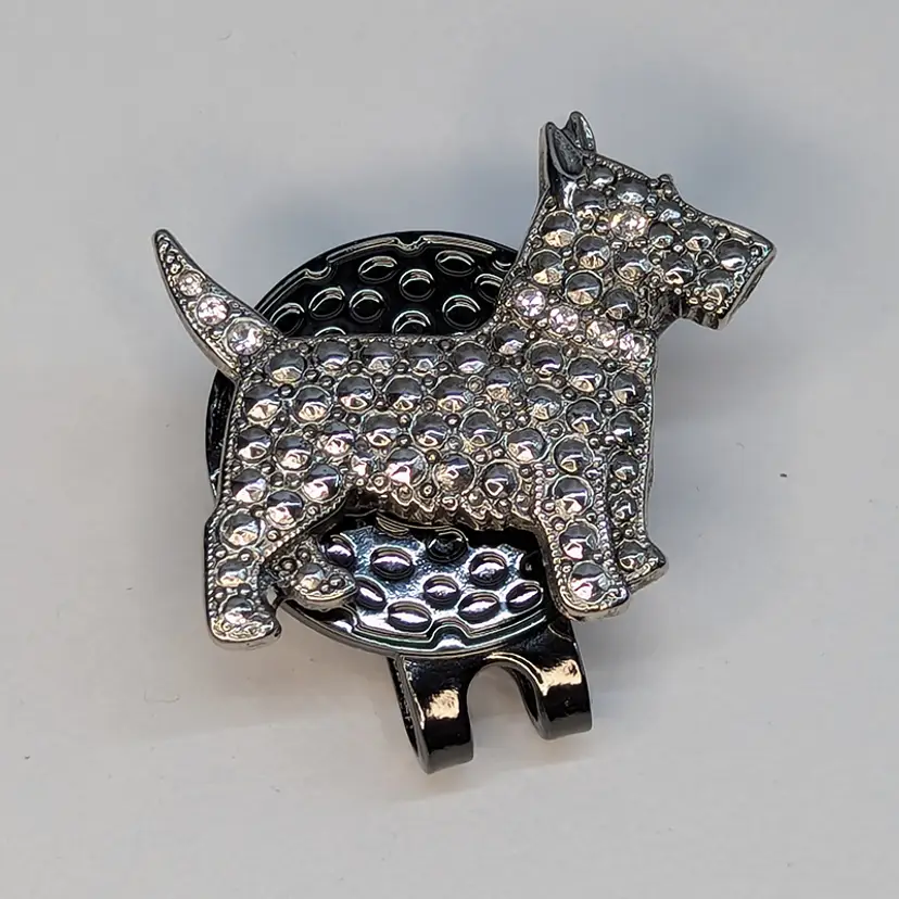 “One-of-a-Kind!!!! This unique ball marker is handmade from a 1930's vintage brooch that features a Scotty Dog, which is the iconic symbol of Scotty Cameron.” This vintage golf ball marker features a charming scotty dog design with jeweled accents. It comes with a magnetic hat clip for easy attachment to your golf bag or hat. Made of metal, this marker is durable and perfect for any golf enthusiast. The silver color adds a touch of elegance to your golf accessories collection. This item is a great addition to your golf bag and perfect for marking your ball on the course.