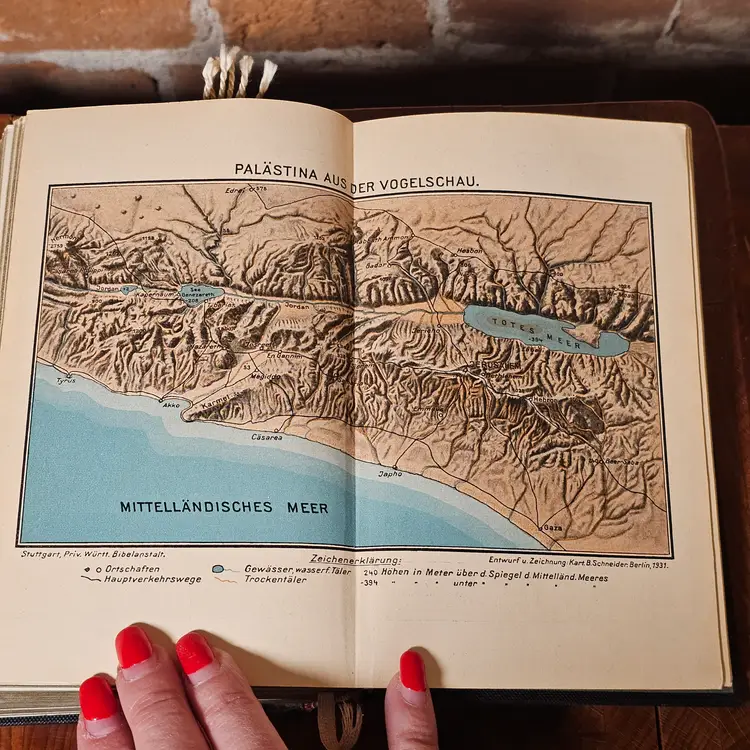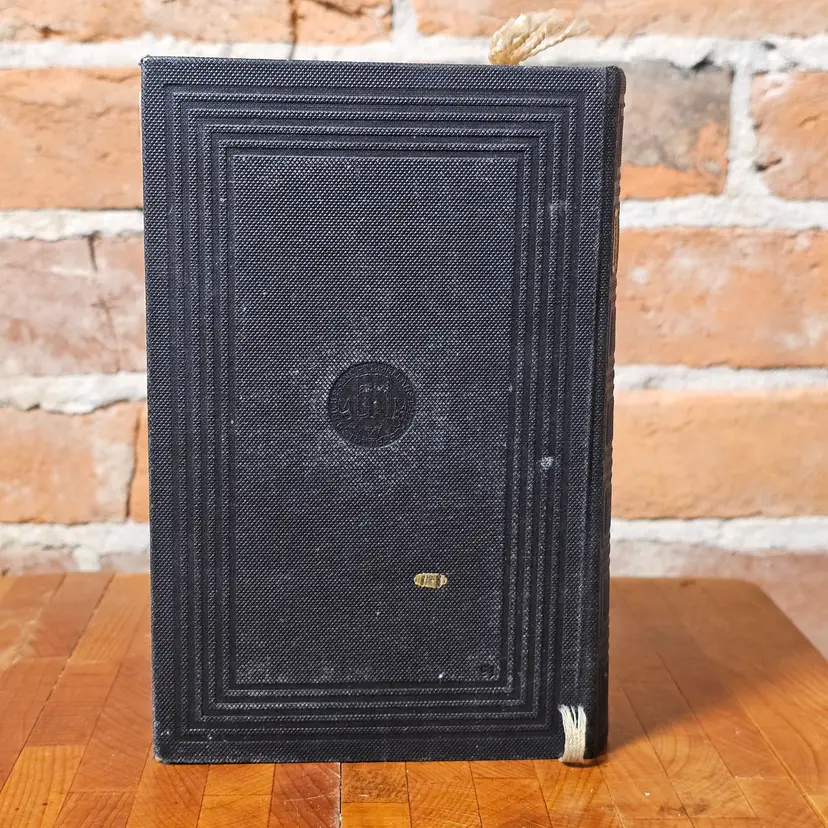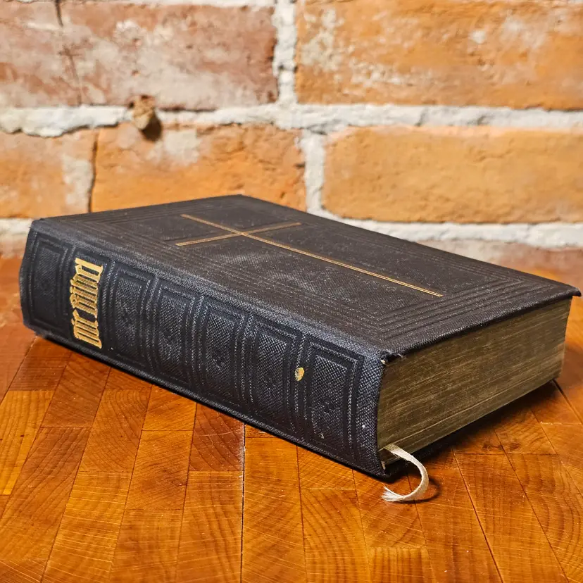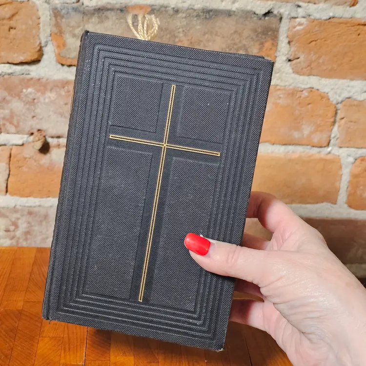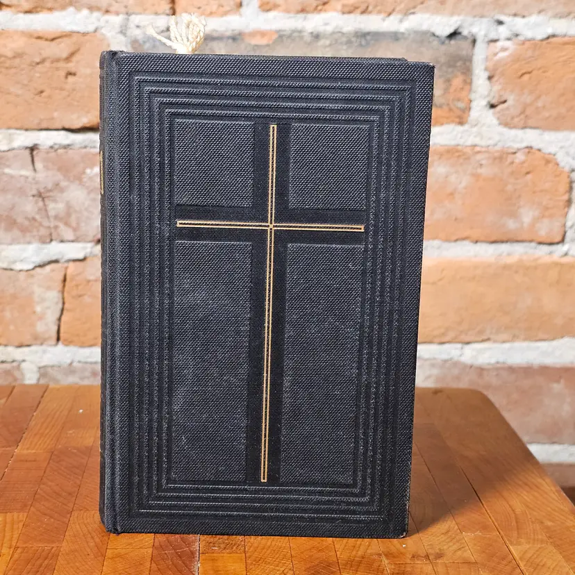Features a beautiful black hardcover with embossed cross and gold lettering. Includes a personalized confirmation page (dated 1932) and printed maps in the back.