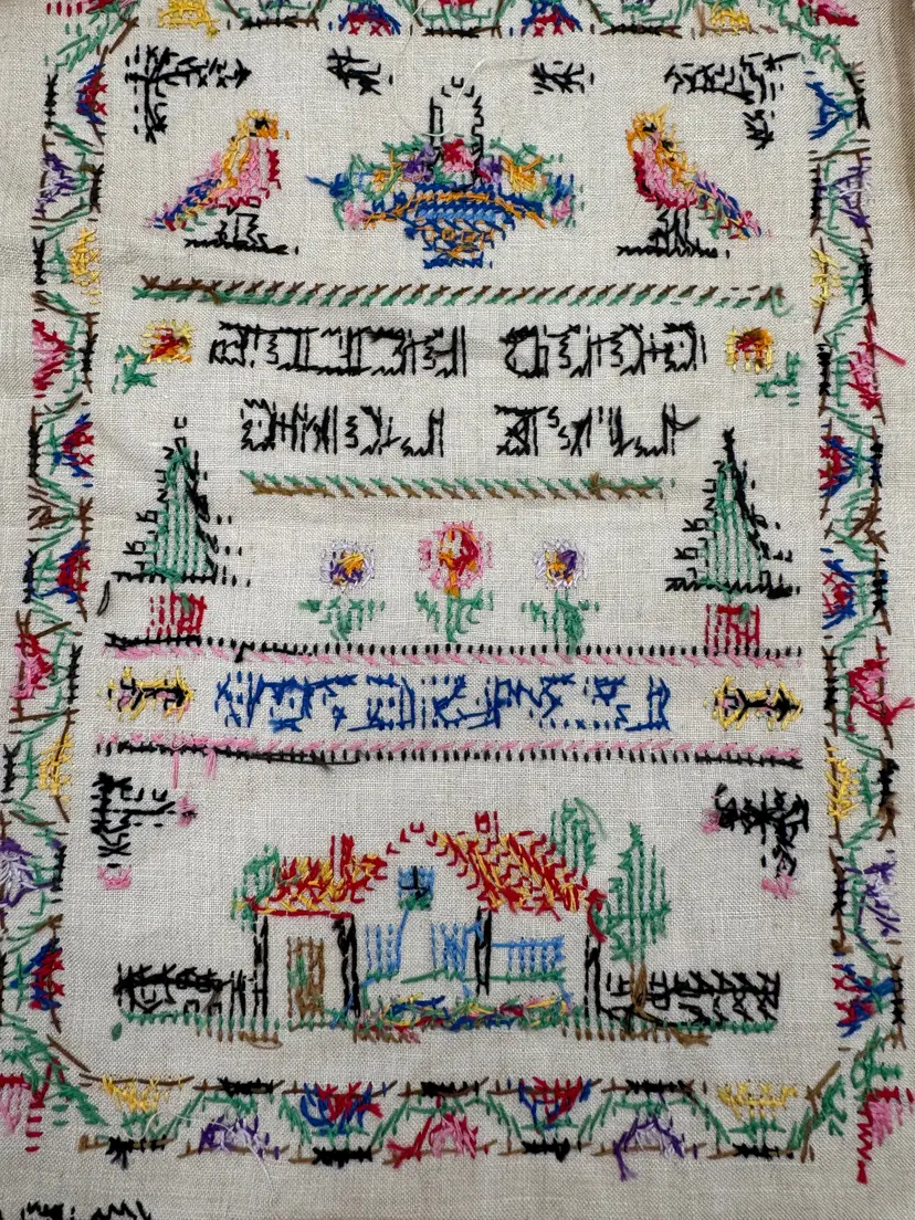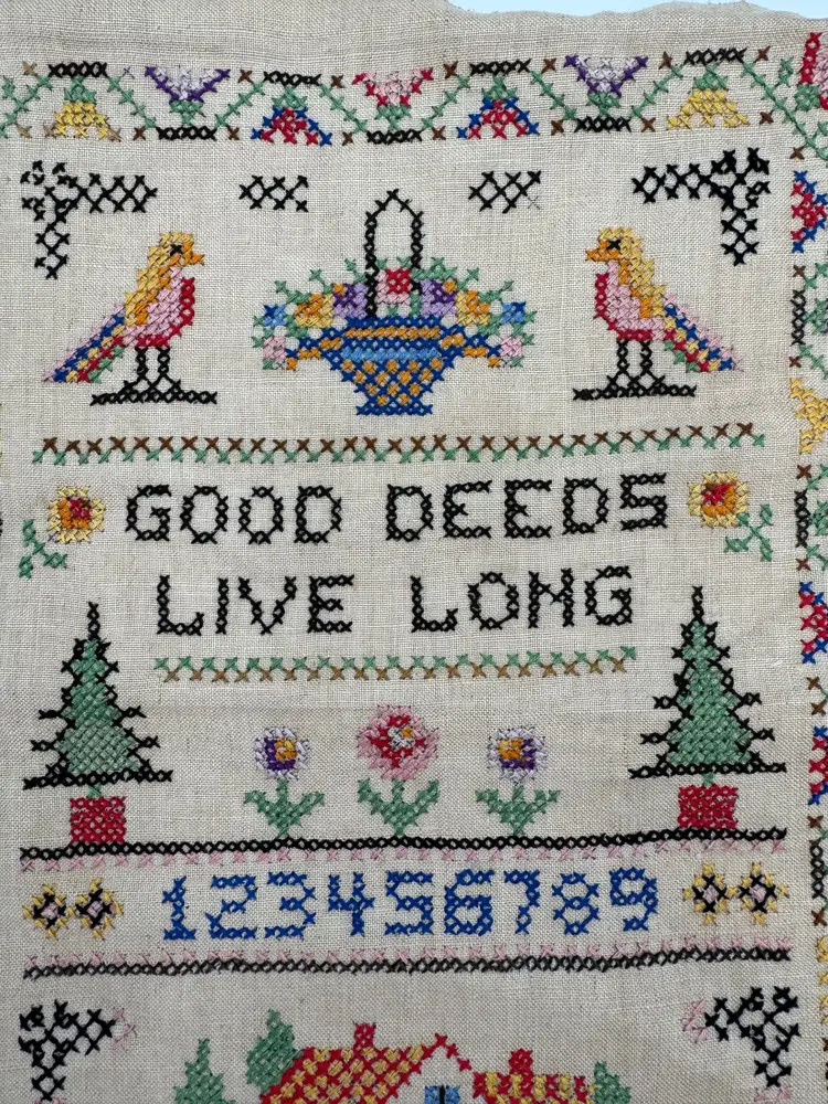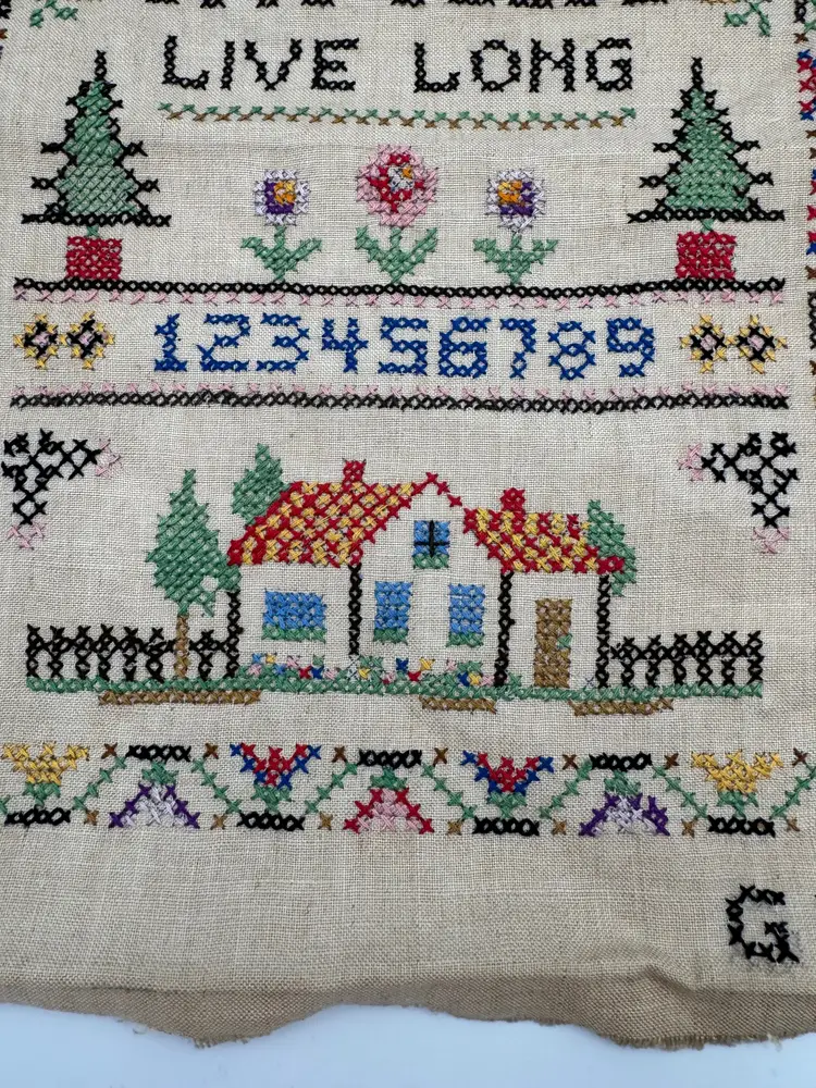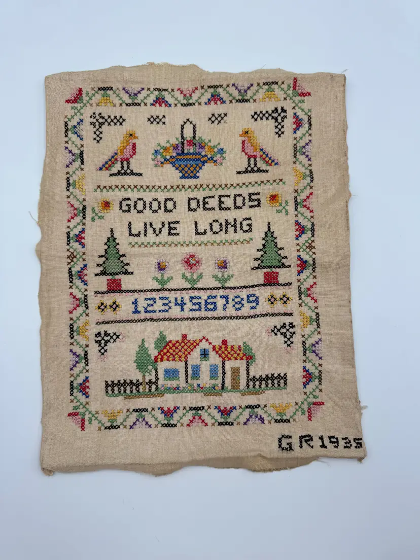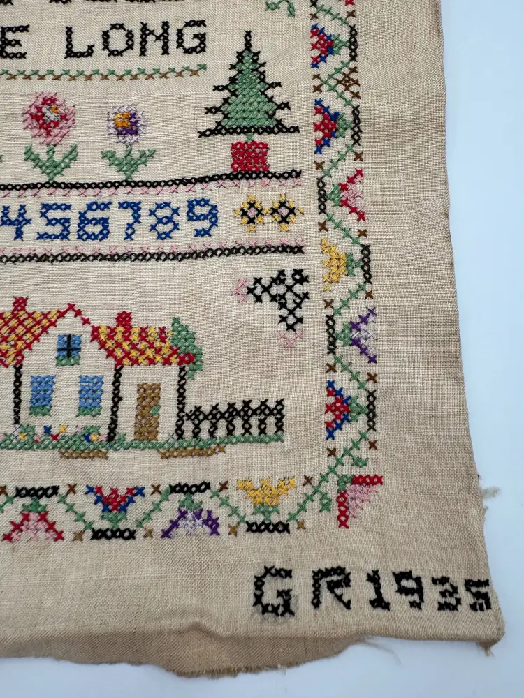 1935 National Recovery Act Depression Needlework in excellent condition Vibrant colors. Initialed and dated "GR 1935". Measures 9.75" x 12". Tea stained linen. Clean, no odor or damage. Ready for framing.