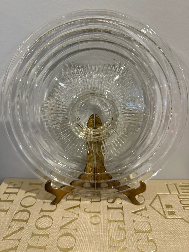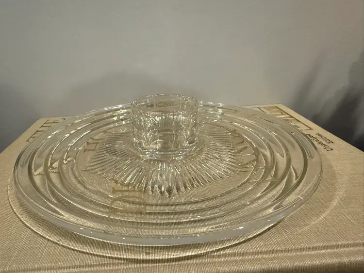 Discover a piece of history with this exquisite Vintage 1937 Louis A. Leppke platter. Crafted in Ireland, this elegant clear glass piece embodies the sophisticated luncheon and bridge gatherings of the era. The platter features a central section often used for dips or condiments, surrounded by a ribbed design that radiates outwards, perfect for individual servings of snacks or desserts. This collectible item is not only functional for entertaining but also serves as a beautiful decorative piece, reflecting the timeless design sensibilities of its time. The condition is excellent, showing minimal signs of age consistent with a beloved vintage item.