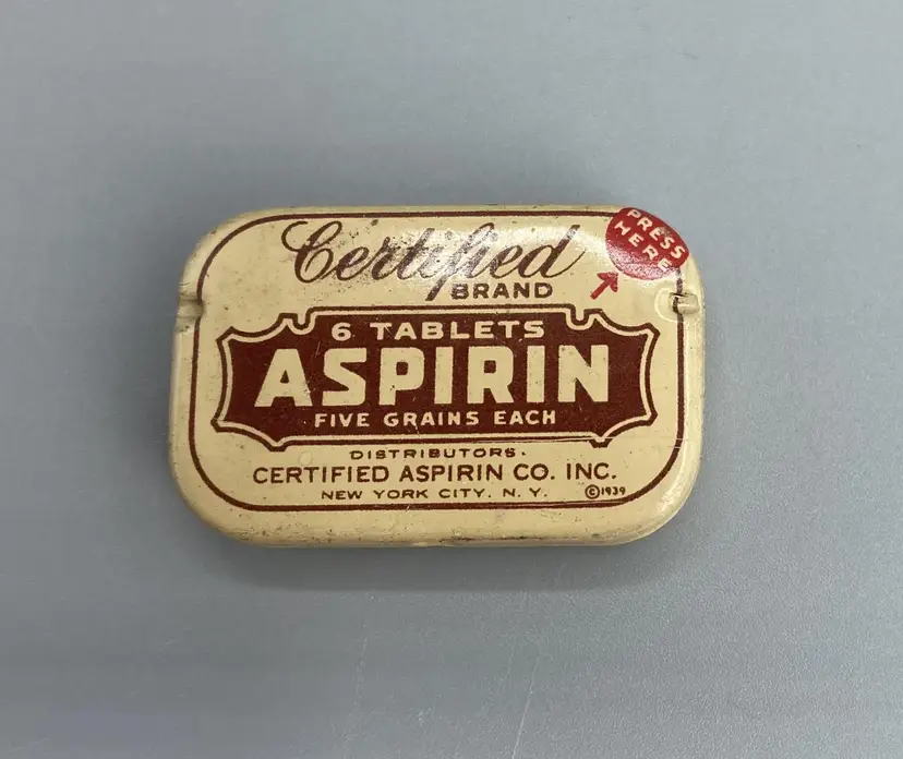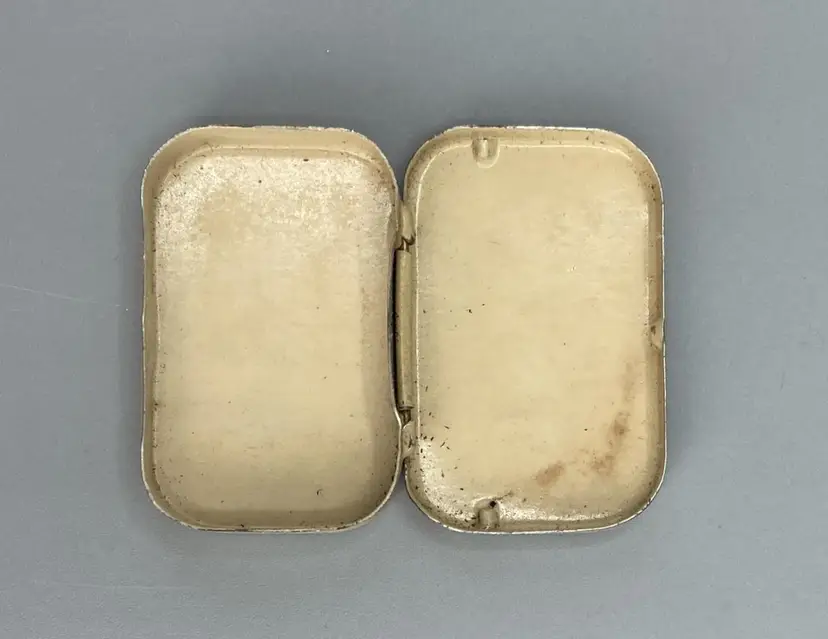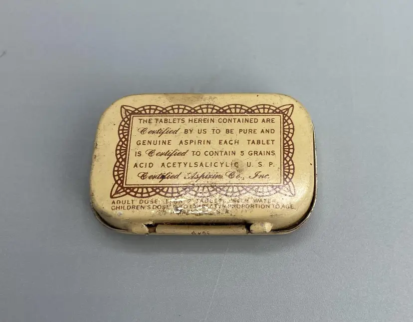 This aspirin tin is in good used condition. It does a little pitting, rust, and paint loss all visible in the pictures. Please see pictures for specific details. This tin measures approximately 1 1/2" x 1" x 3/8".