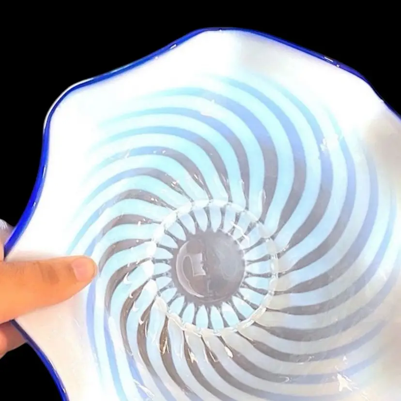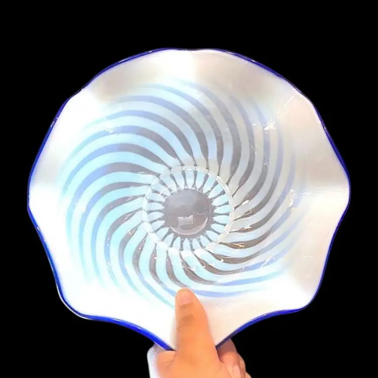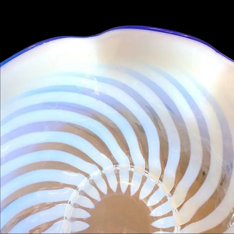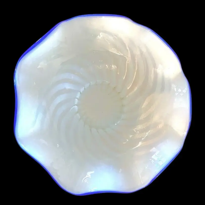 •original Blue Ridge line by Fenton, made in 1939 and beginning of 1940 •about 10.5” wide •Blue Ridge line is a highly collectible line with a variety of pieces made in a 6-8 month period; all pieces are French-opalescent swirl optic with very thin, cobalt blue crests on the edges. An anniversary limited re-release was done in the 80s but this is original 1939 version, lacking any stamp •may be the base to a September Morn Nymph, or a standalone bowl (made both ways) •has some bubbles & very small inclusions but both are common in older glass