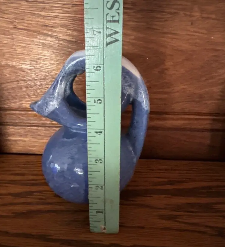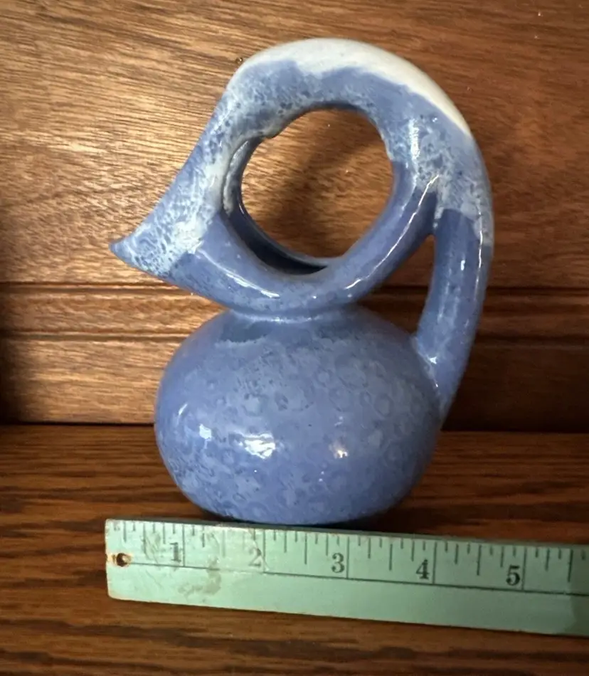 The abstract style and art deco theme of this vase make it a great addition to any home decor. It is a vintage item, but has been well-maintained over the years. The vase is incised with a backstamp and is marked as handmade. This is a rare find for anyone interested in mid 20th century pottery.