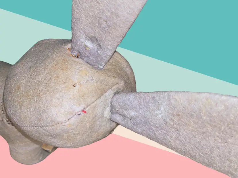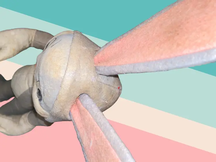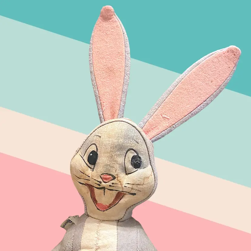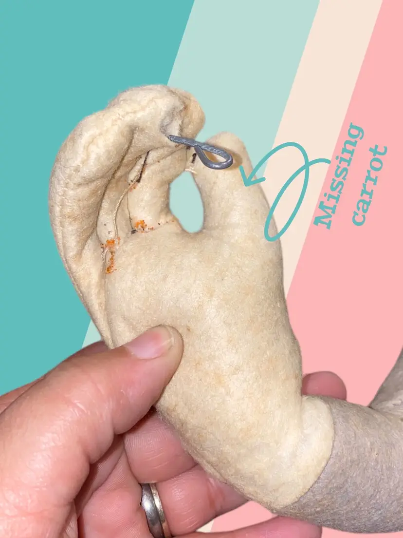 •conditional notes: has lots of conditional issues from a life of love, such as a missing plush carrot in hand, staining, rips, several repaired seams. However it is still displayable and shows just how much the original owner loved and wanted to preserve this piece.