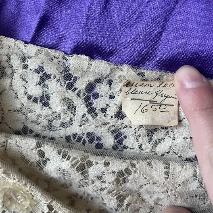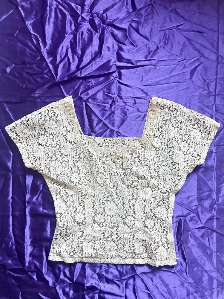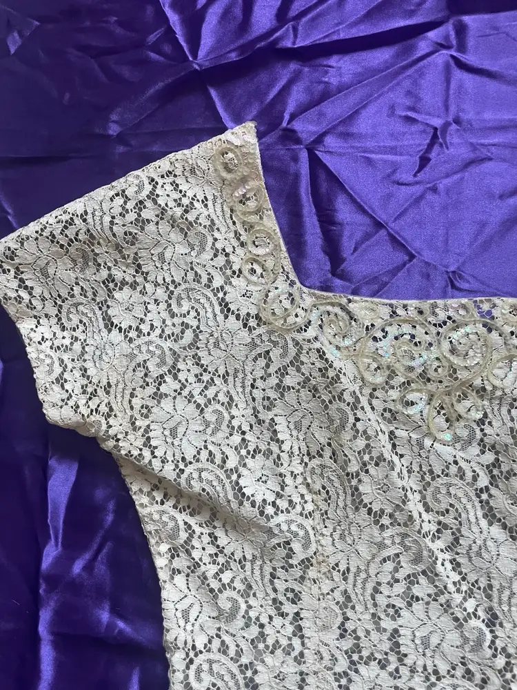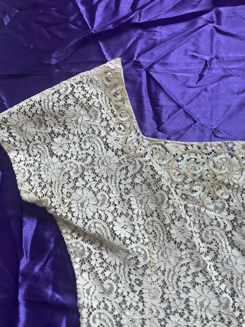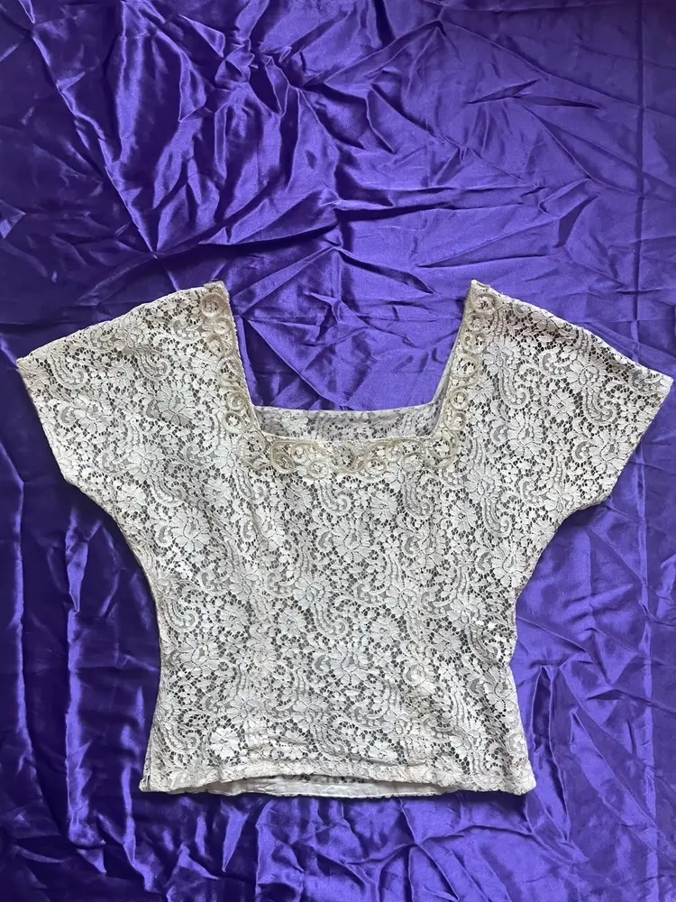 Lovely 1940's lacy short sleeve blouse with a nipped waist and short sleeves. Dramatic square neckline. So gorgeous! Metal zipper at the side. Original (?) paper tag stapled. One tiny dark dot, about the size of a pinhead. I believe the sequins may be gelatin.