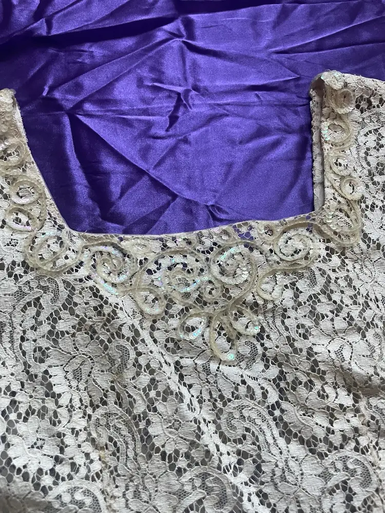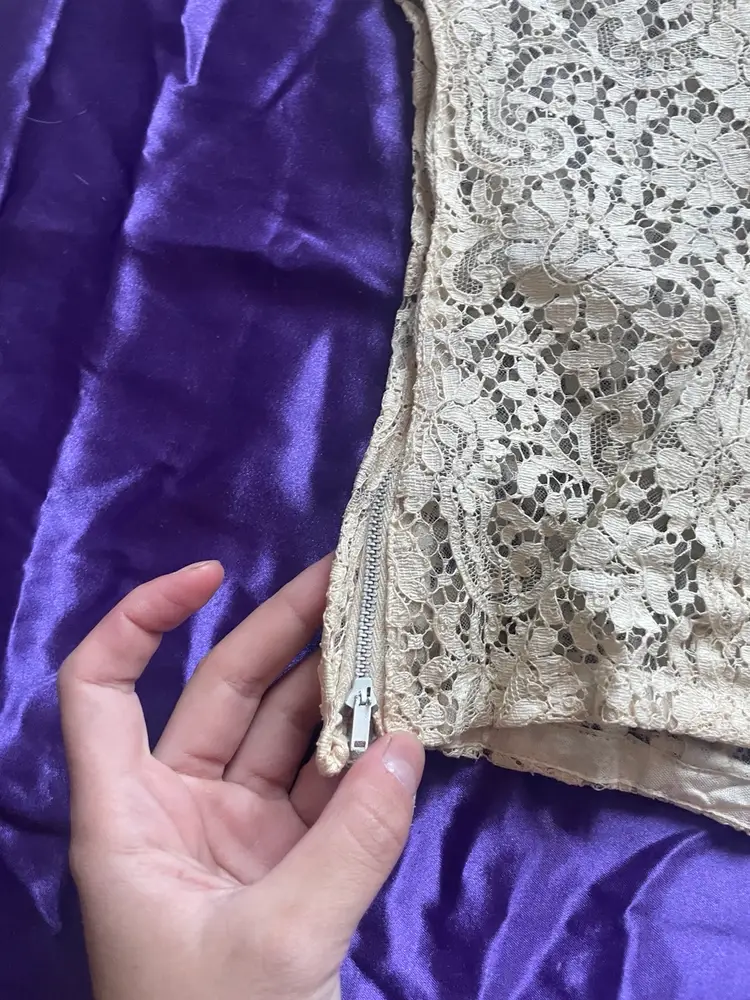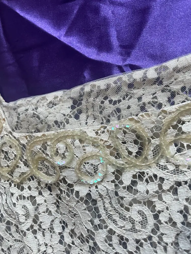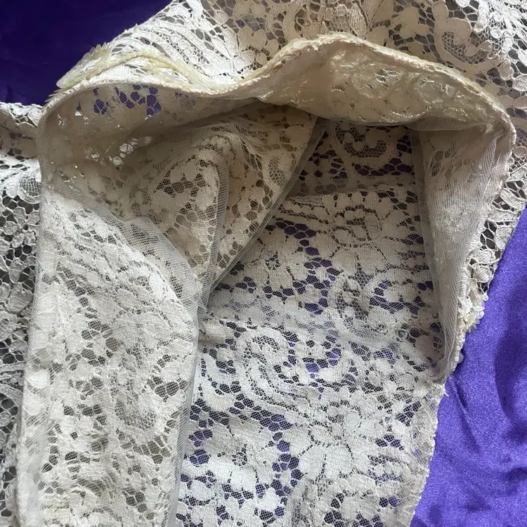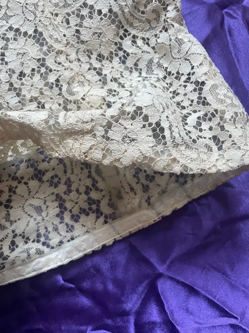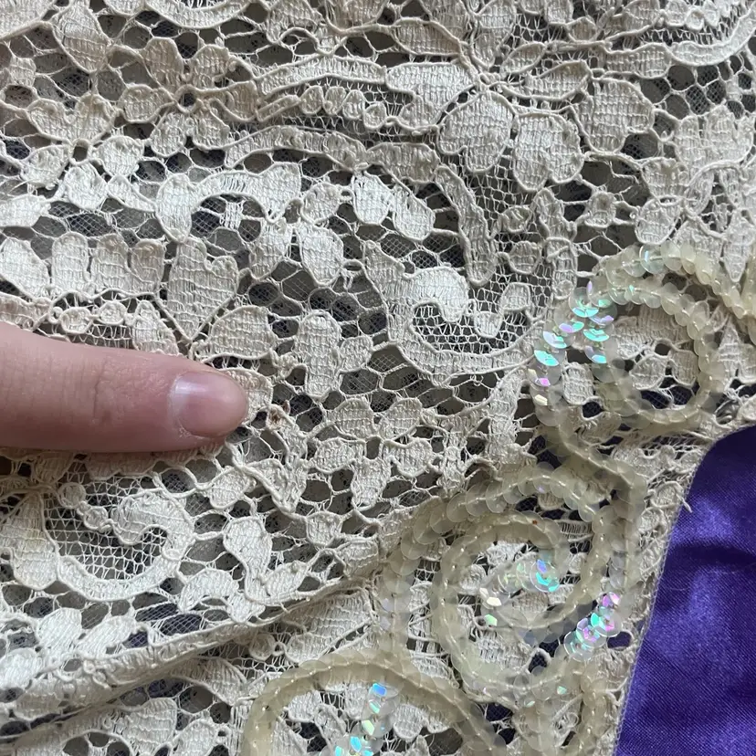 Lovely 1940's lacy short sleeve blouse with a nipped waist and short sleeves. Dramatic square neckline. So gorgeous! Metal zipper at the side. Original (?) paper tag stapled. One tiny dark dot, about the size of a pinhead. I believe the sequins may be gelatin.