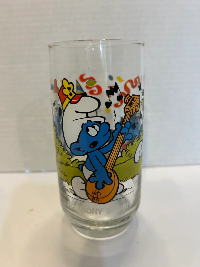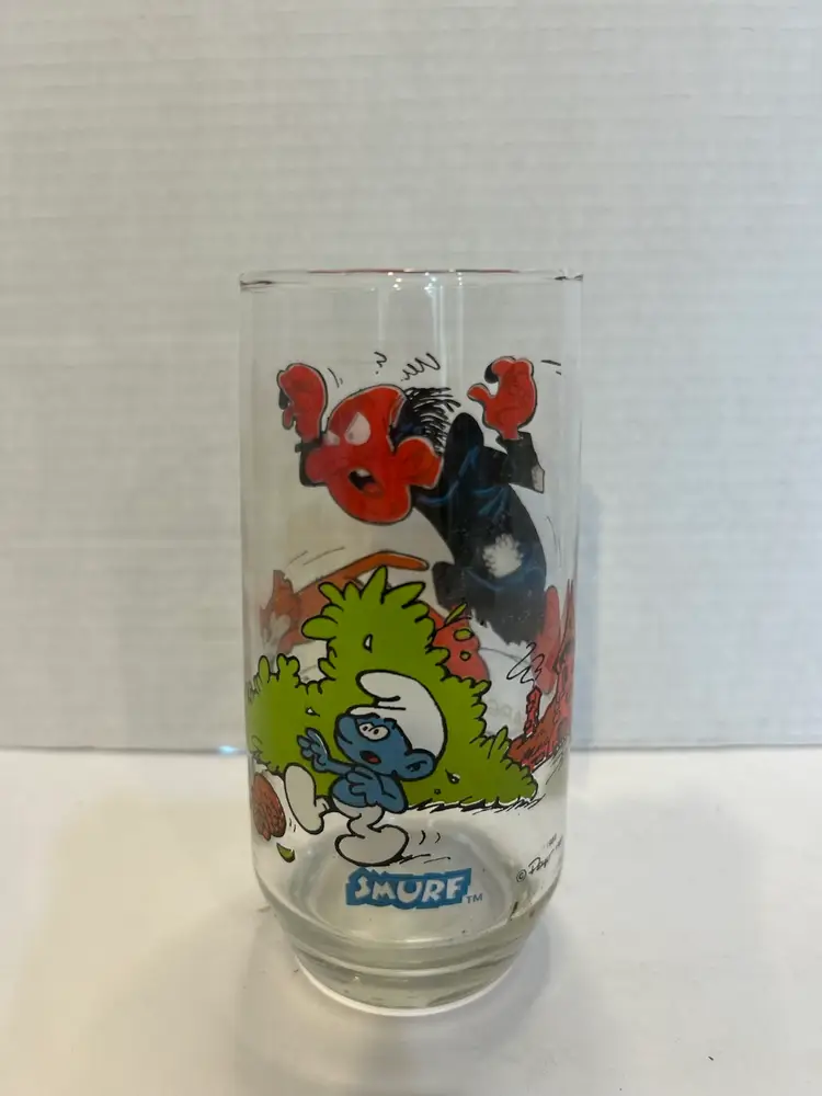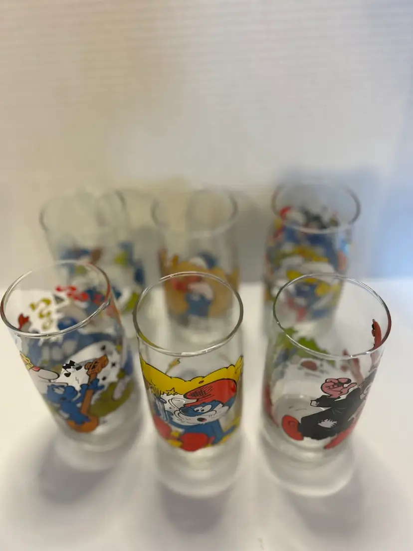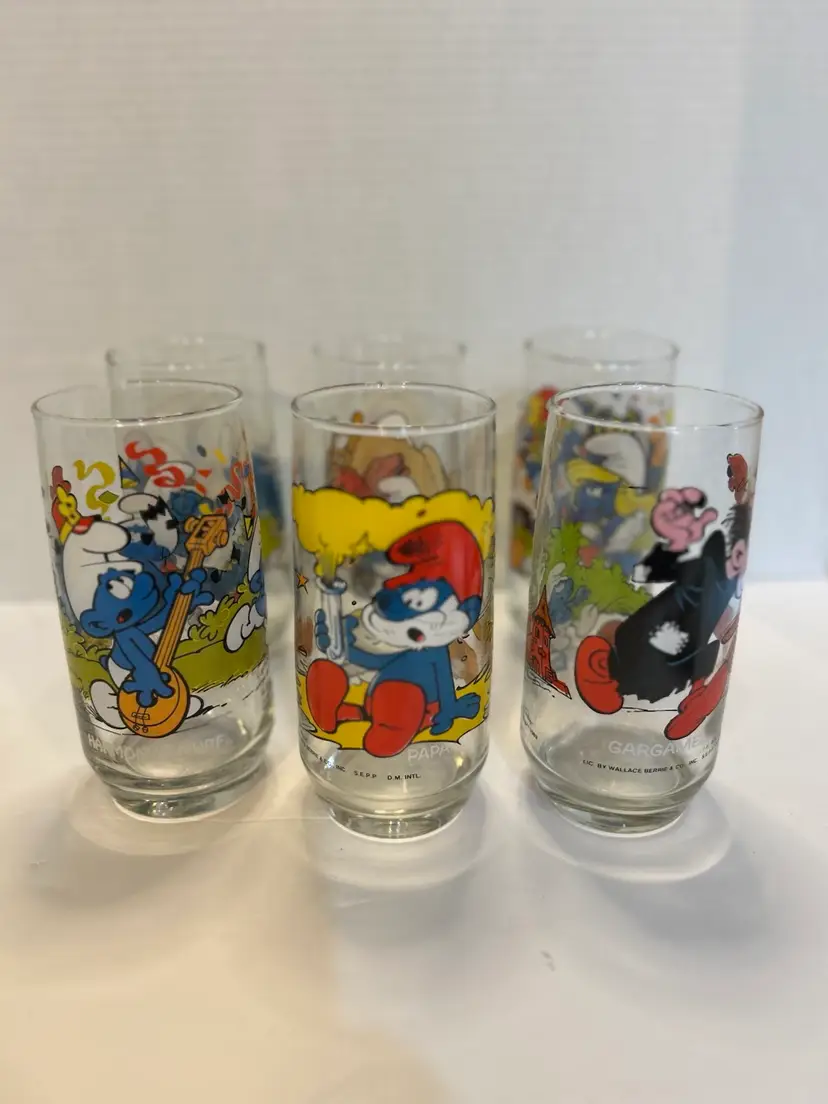 6 Vintage Smurf Glasses. 1982-1983, Peyo and Wallace Berrie & Co. from Hardee’s. 6 x 2 6/8. Papa, Harmony, Smurfette, Gargamel, Brainy, Hefty. Excellent condition.