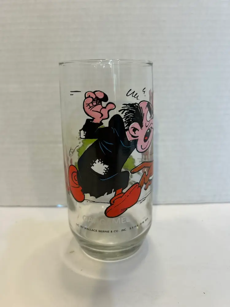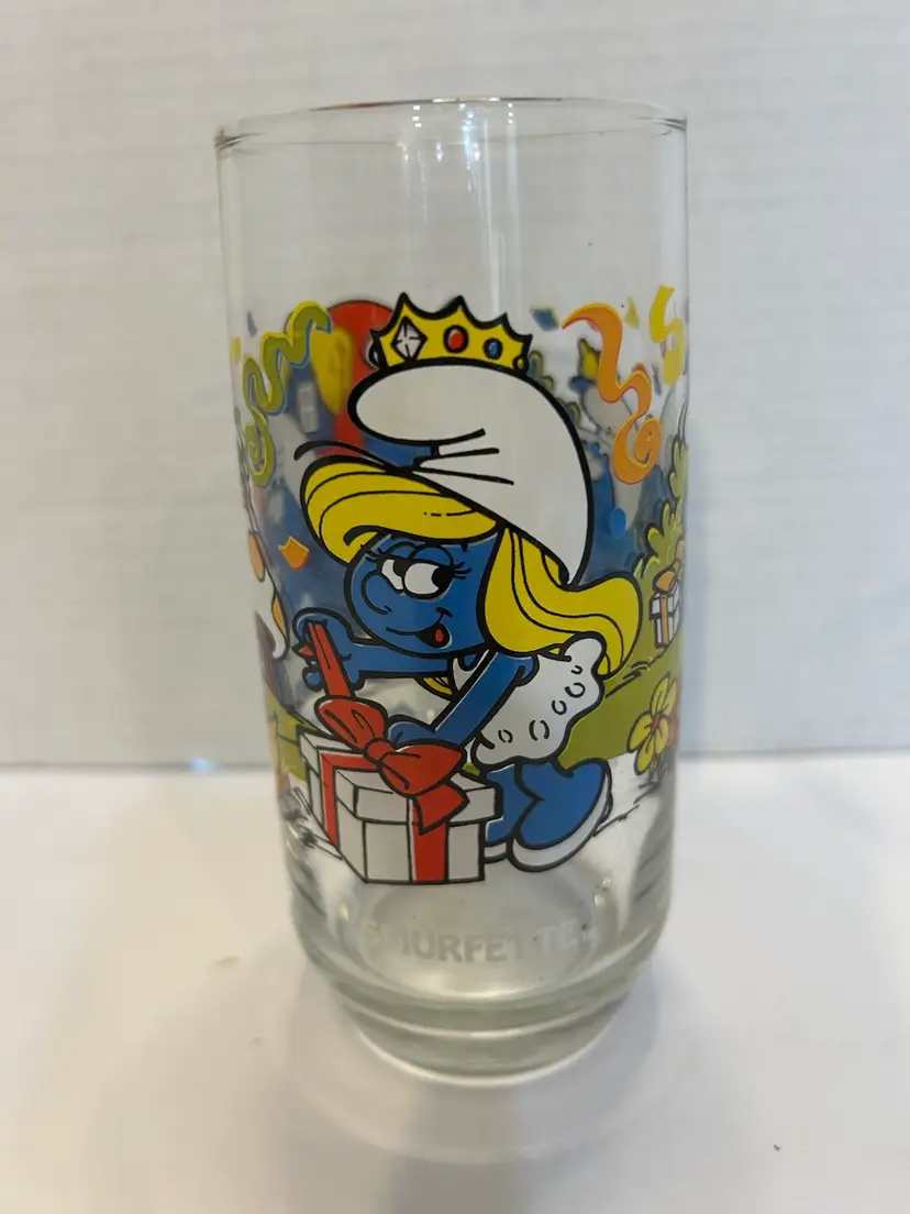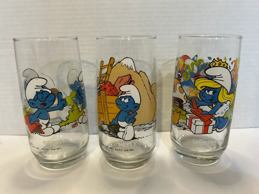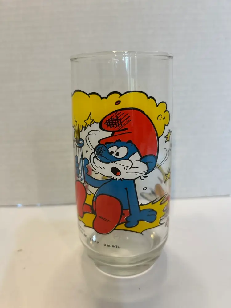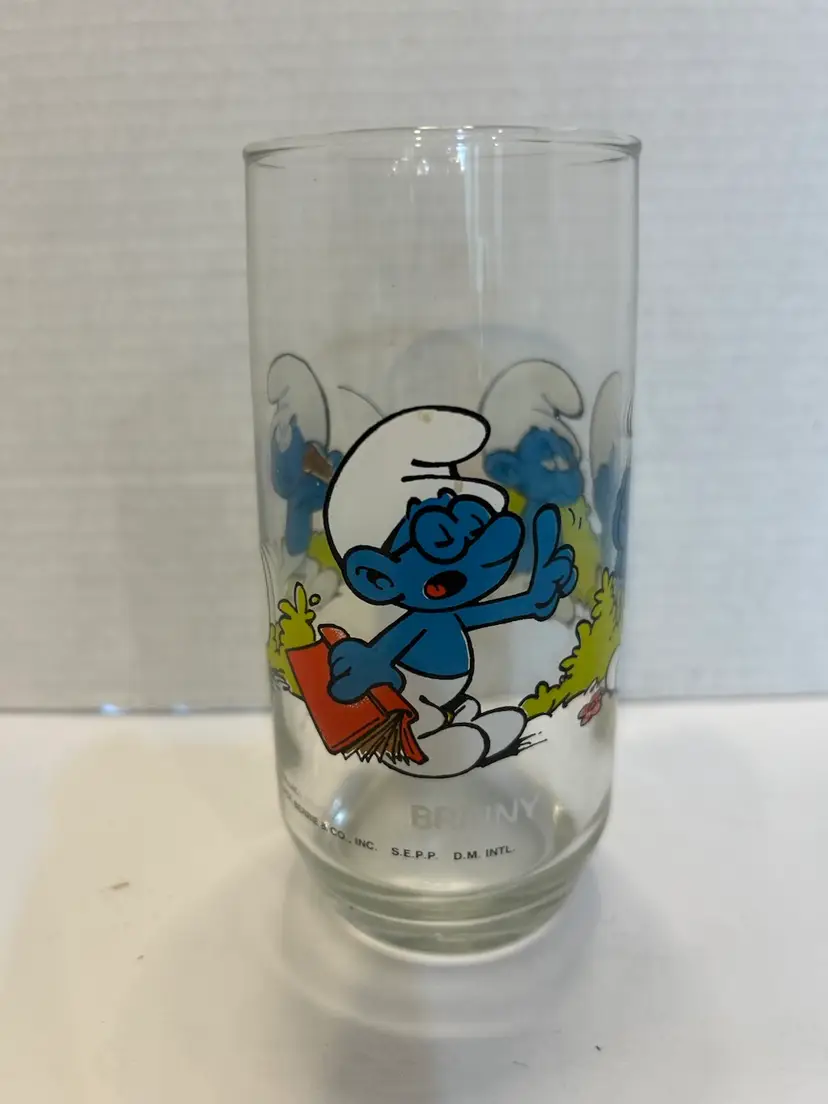 6 Vintage Smurf Glasses. 1982-1983, Peyo and Wallace Berrie & Co. from Hardee’s. 6 x 2 6/8. Papa, Harmony, Smurfette, Gargamel, Brainy, Hefty. Excellent condition.