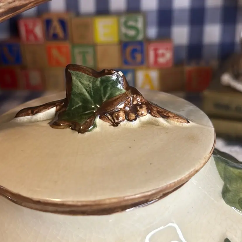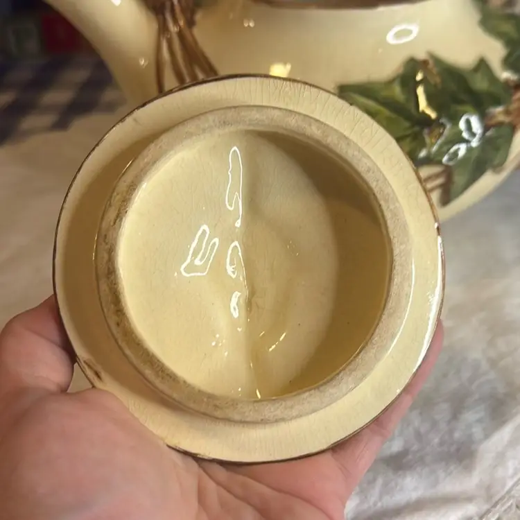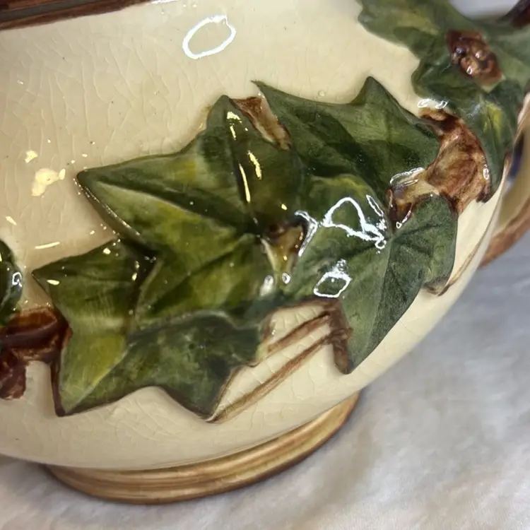 There is one small chip on an ivy leaf on the lid, as shown in the last photo.