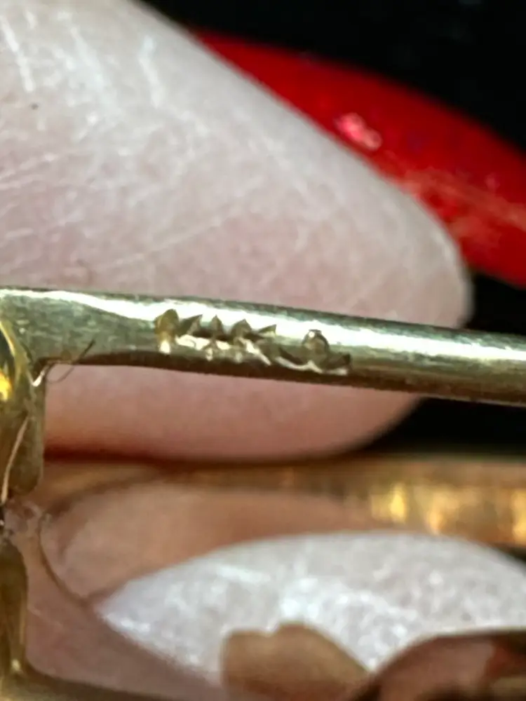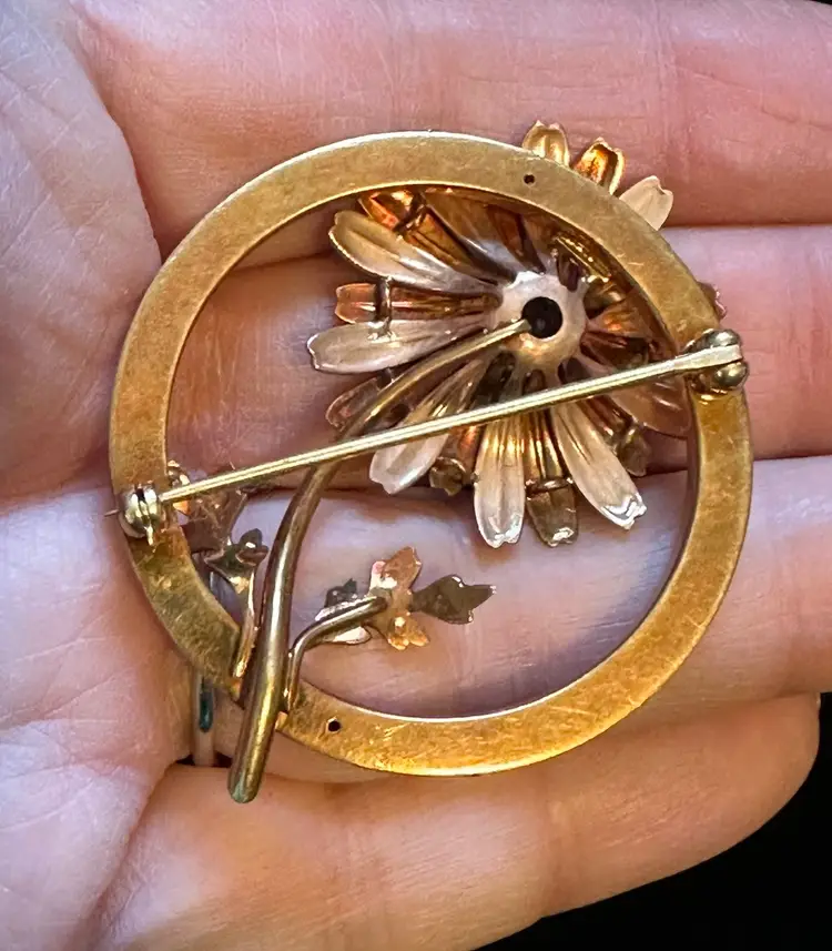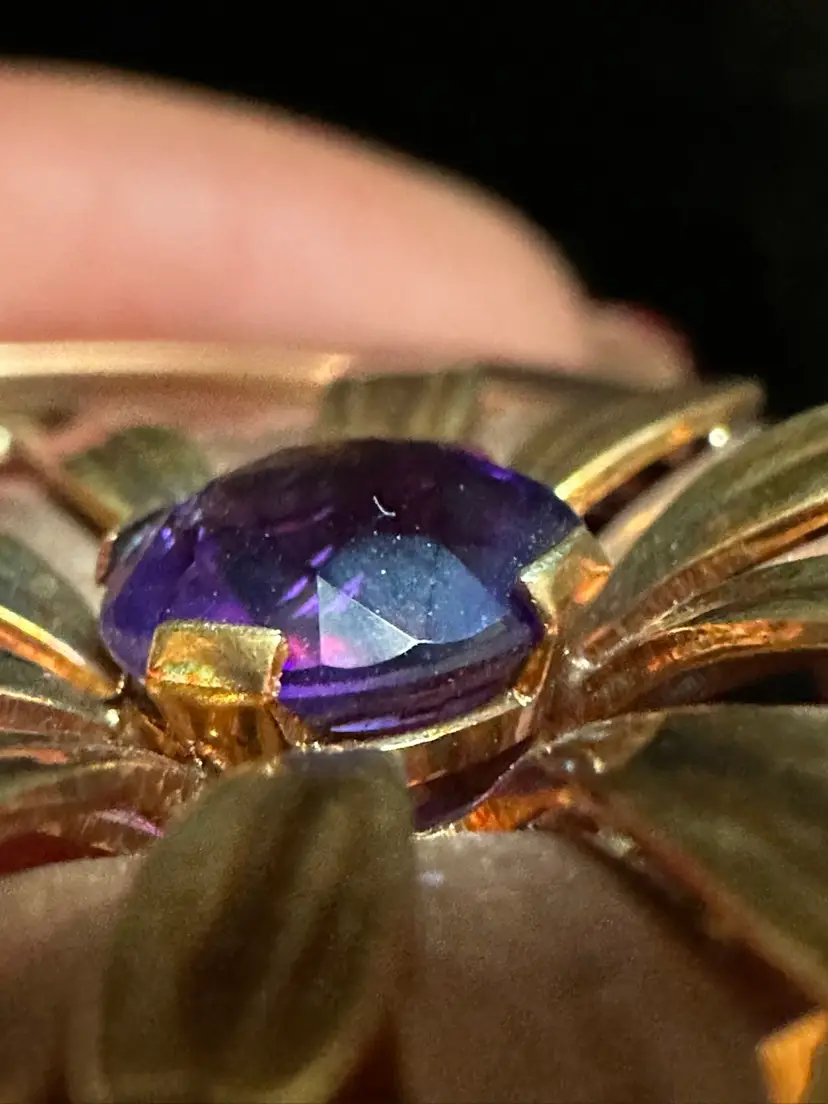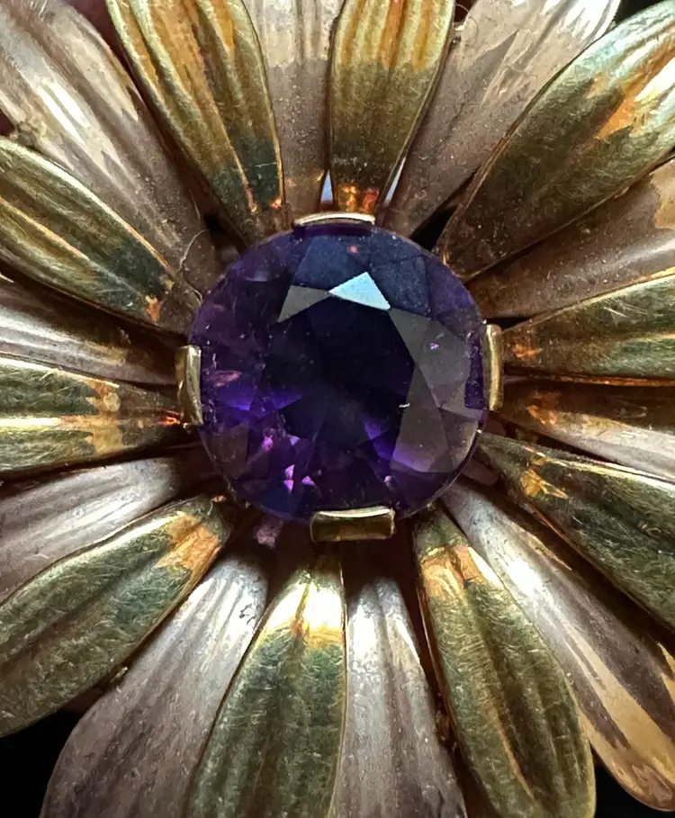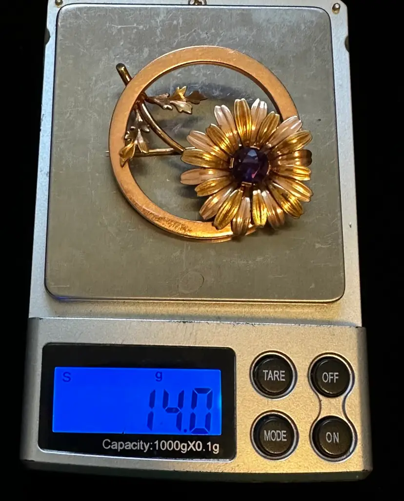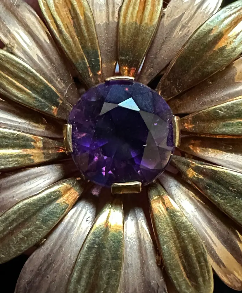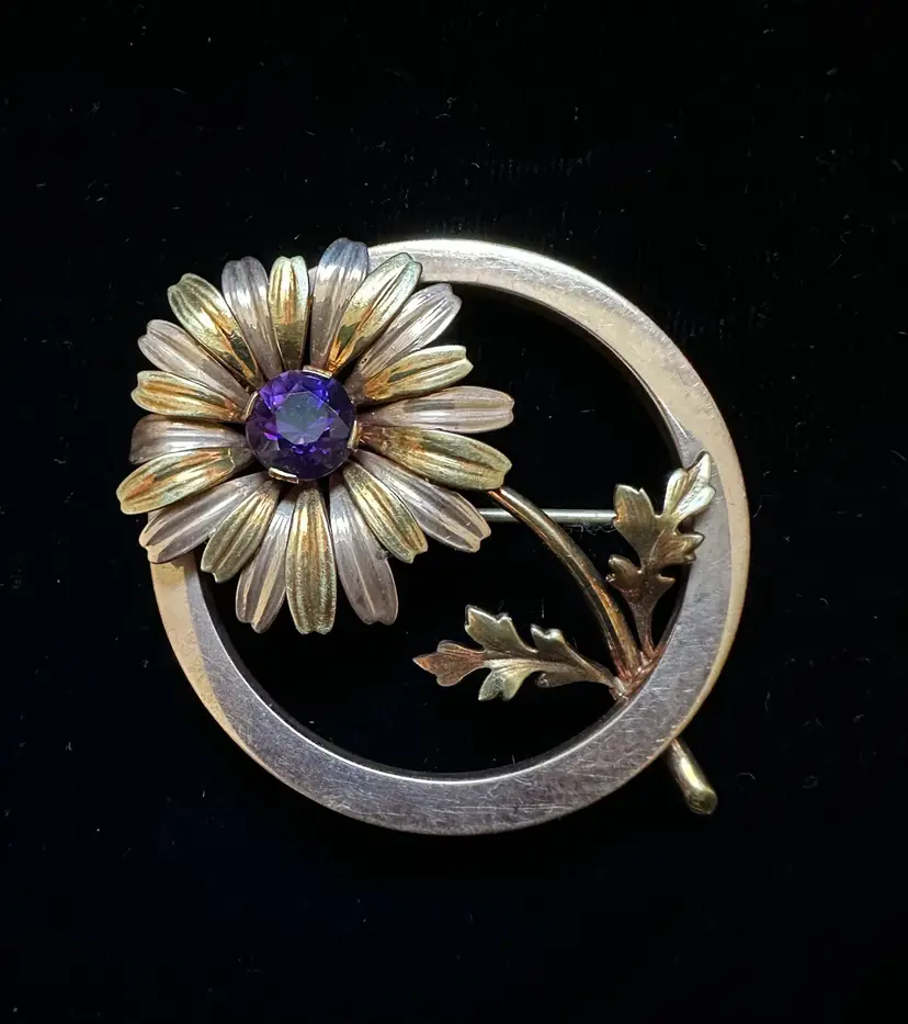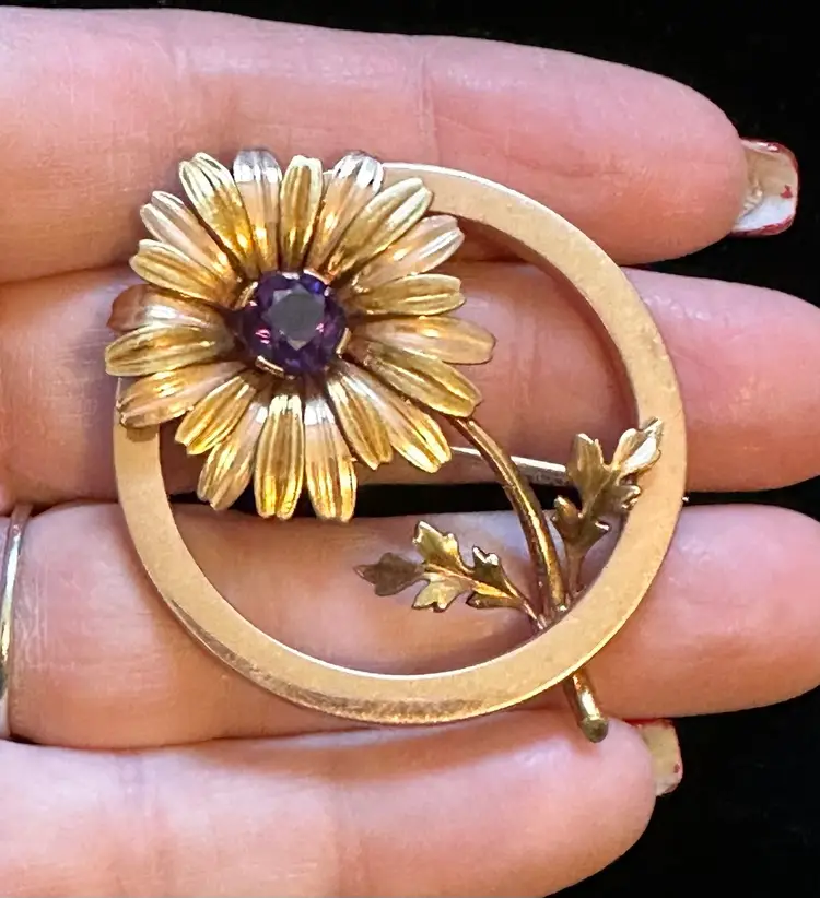 Lovely 1940’s daisy floral circle pin. It is 14k solid gold and set with an amethyst gemstone. It is 2” at widest point. It ways 14 grams. Excellent condition.