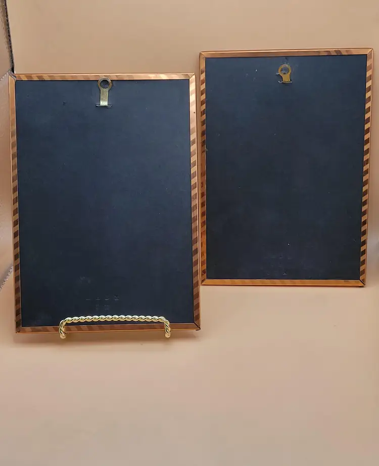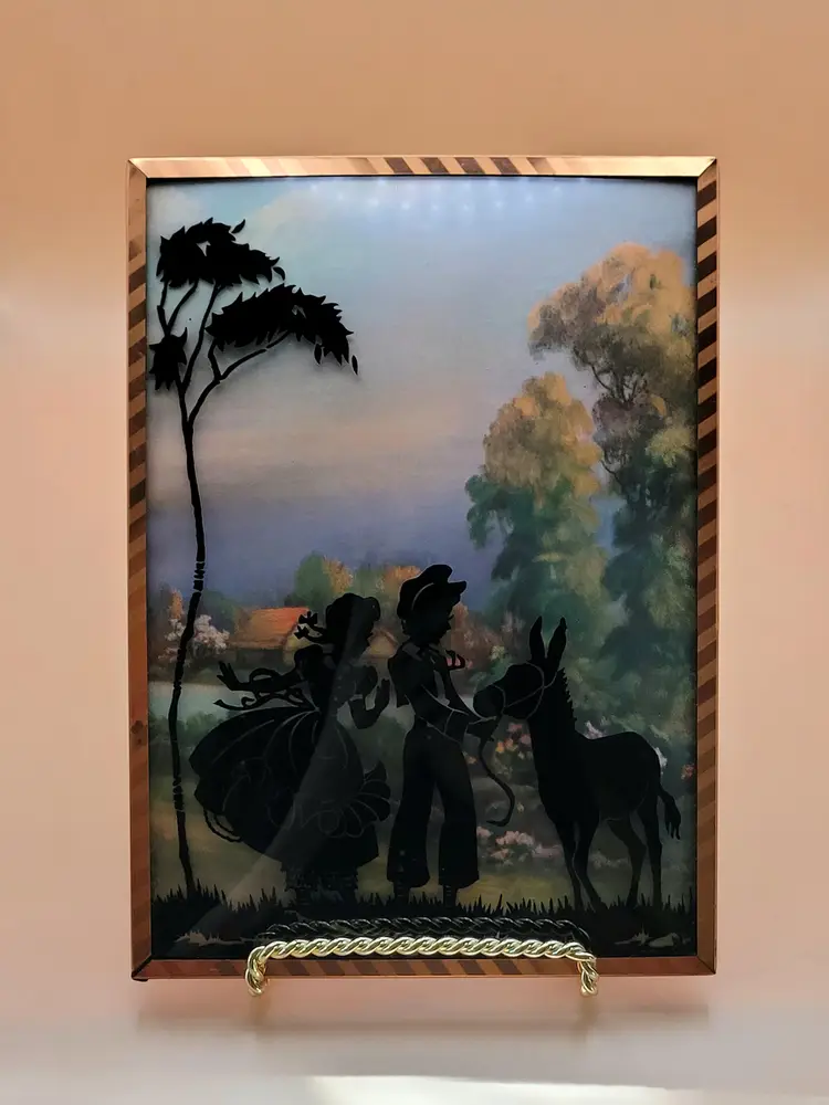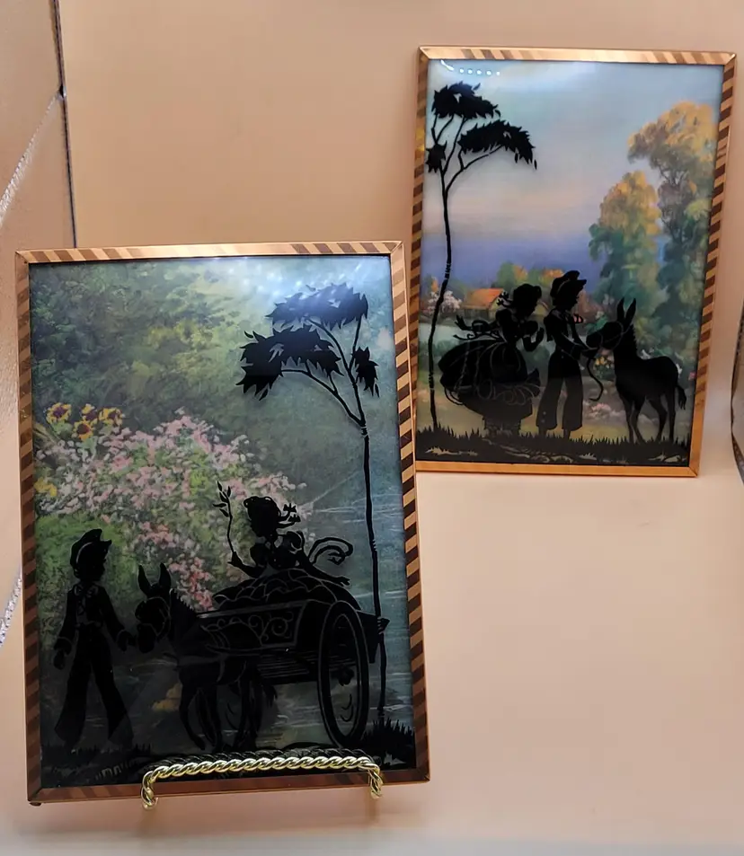 Here are two vintage romantic framed silhouettes. One silhouette is of a boy handing a girl a flower as she rides along in her donkey drawn buggy the other is of a boy & girl feeding a donkey. The silhouettes are reverse paintings on convex (curved) glass. the frames are copper. Both pictures are in very nice condition. These silhouettes are rare, I could not find them anywhere. Making them a wonderful addition to your collection! *Price is for the pair