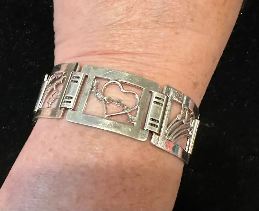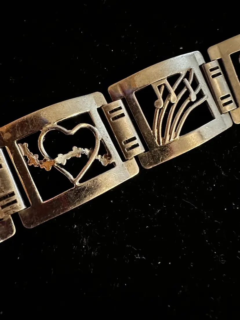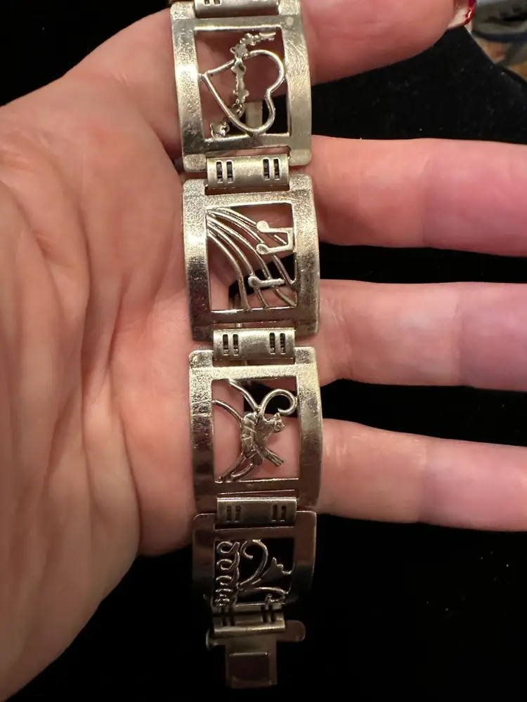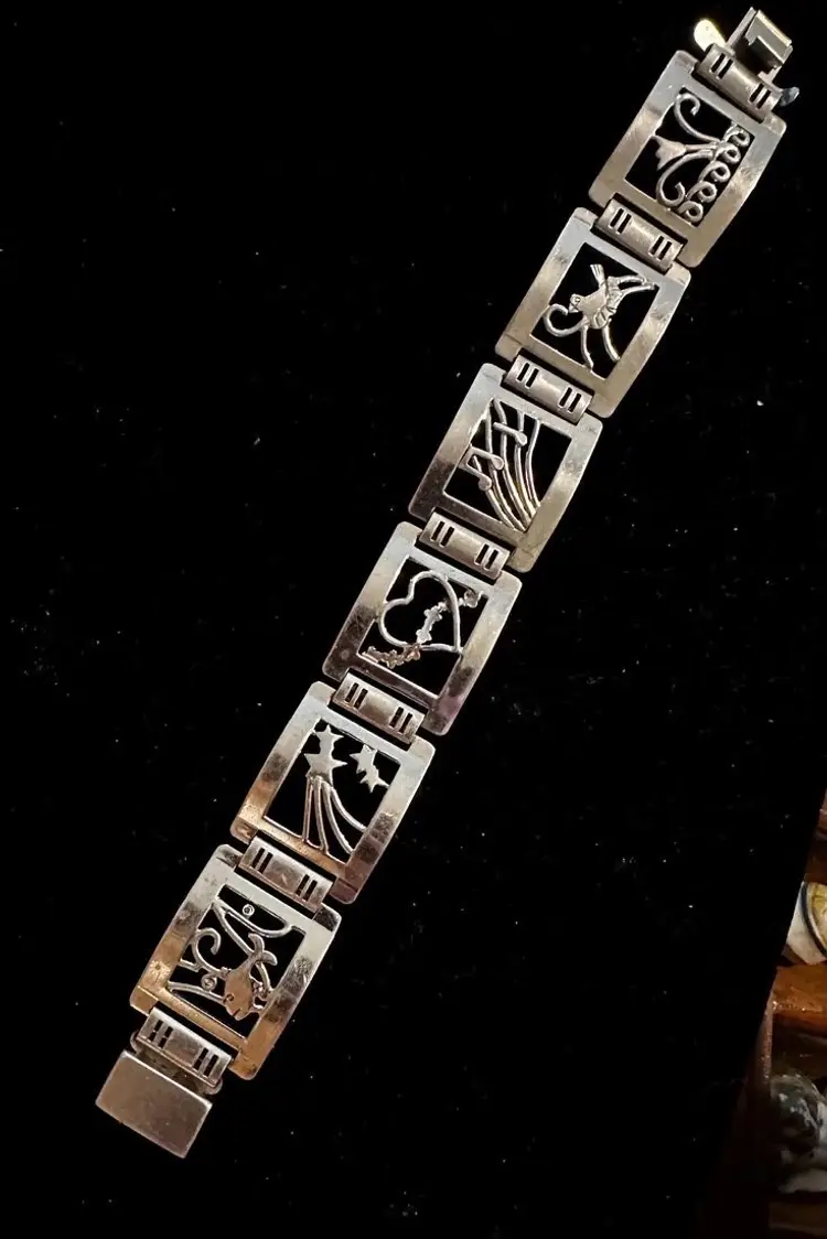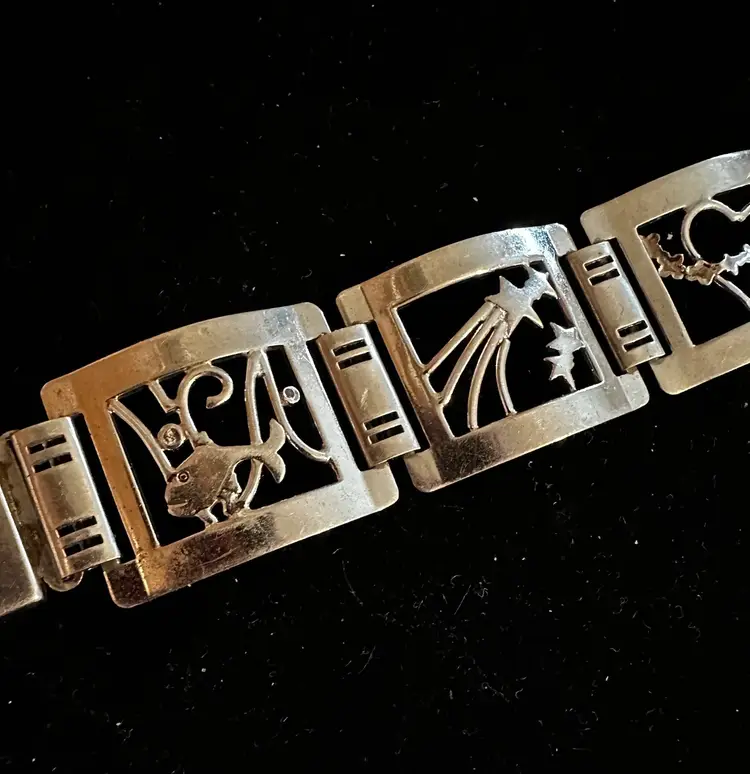 Art deco era handmade Sterling Silver bracelet. It is made up of 6 panels and each has a picture, fish, stars, heart, music, bird and flower. It is 7.5” x 7/8”. Condition is very good.