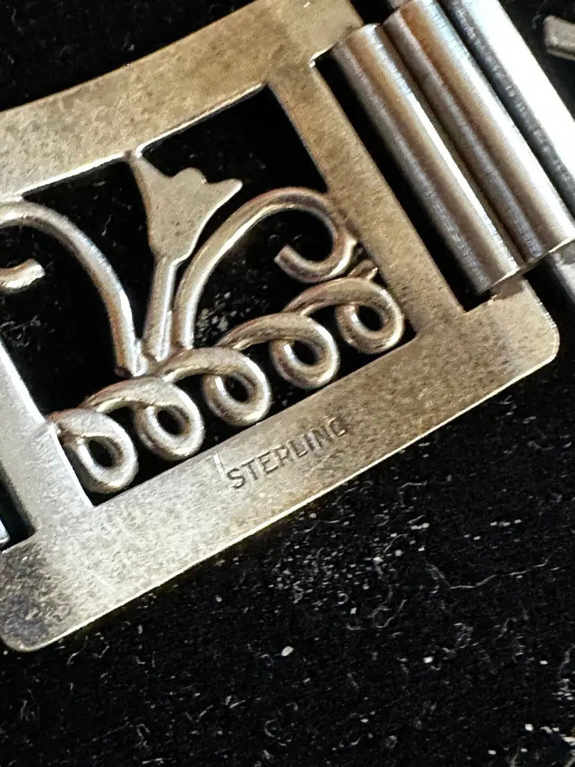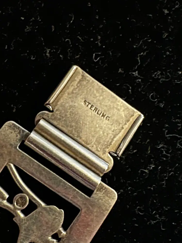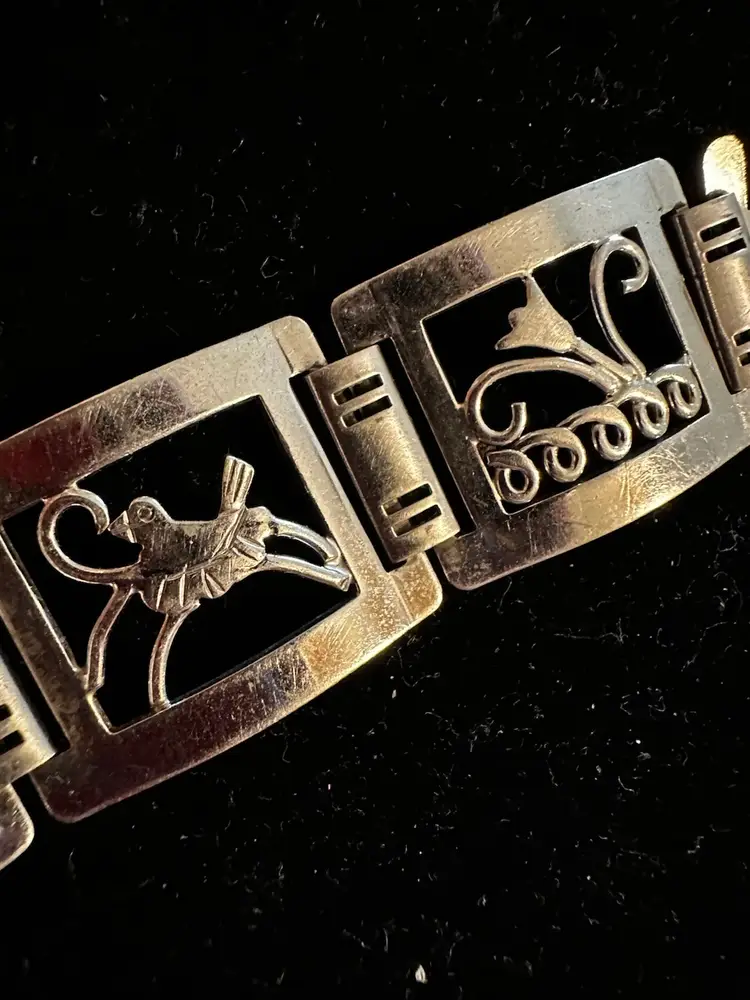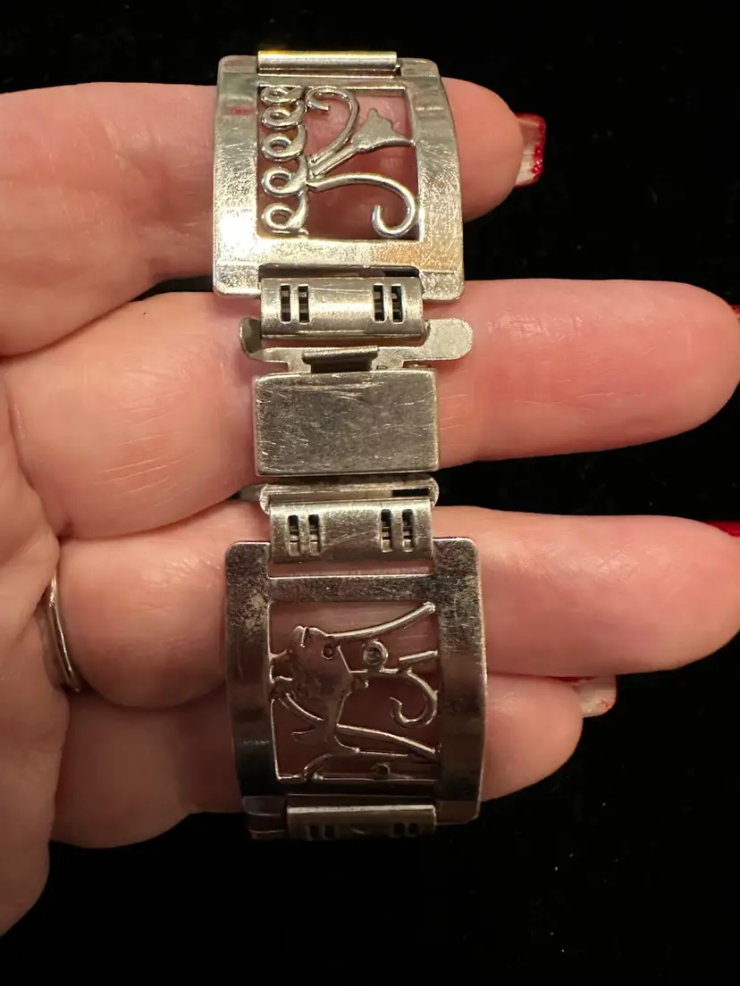Art deco era handmade Sterling Silver bracelet. It is made up of 6 panels and each has a picture, fish, stars, heart, music, bird and flower. It is 7.5” x 7/8”. Condition is very good.