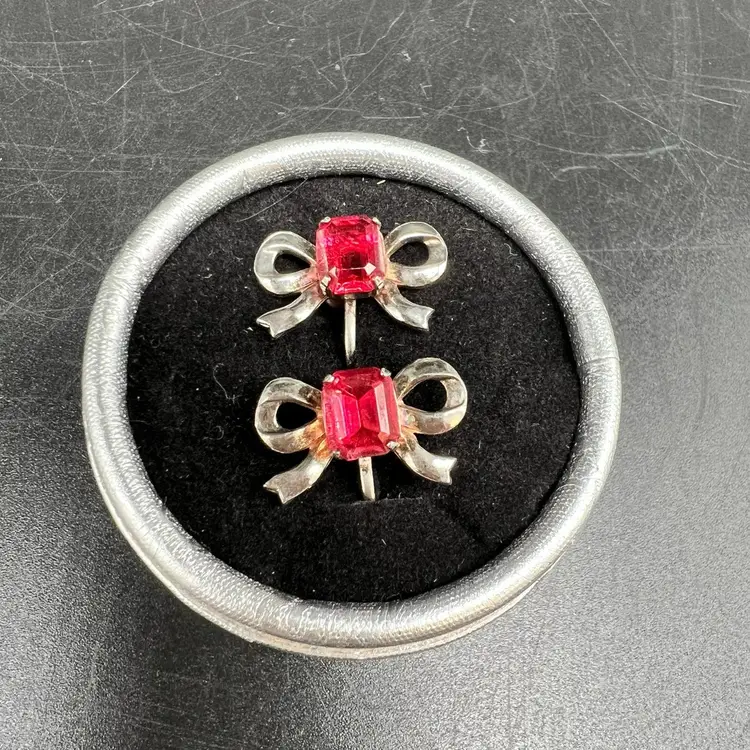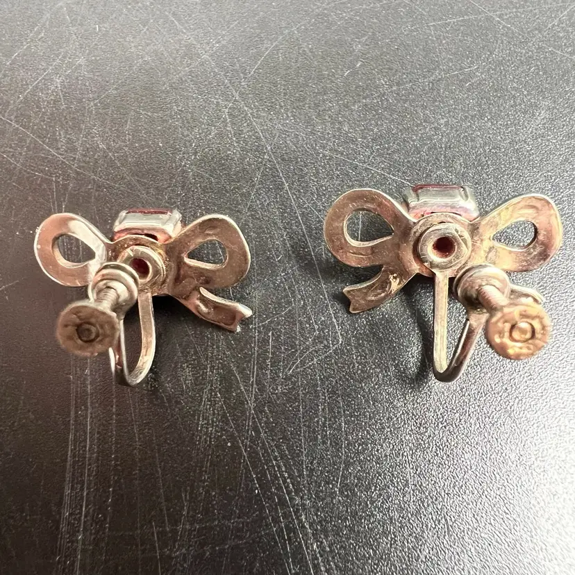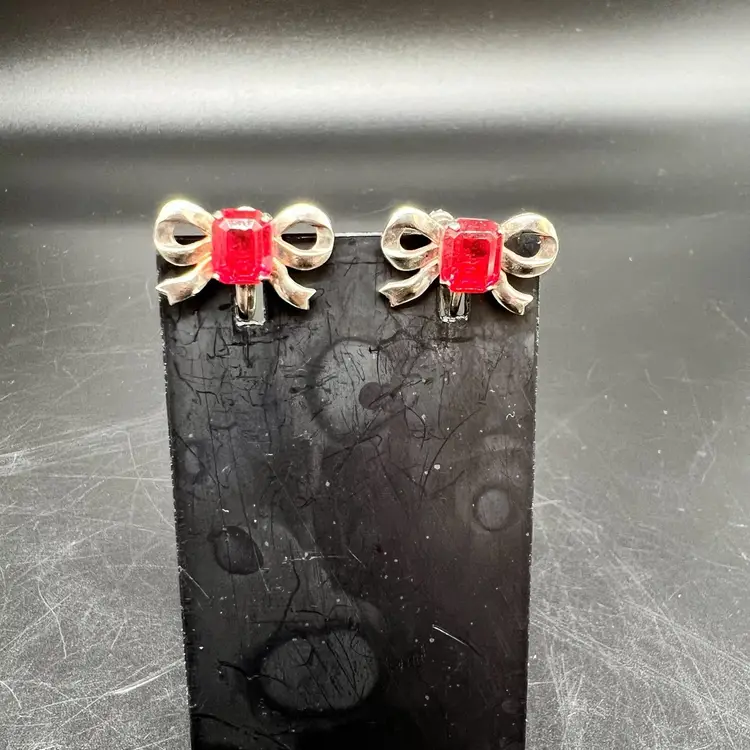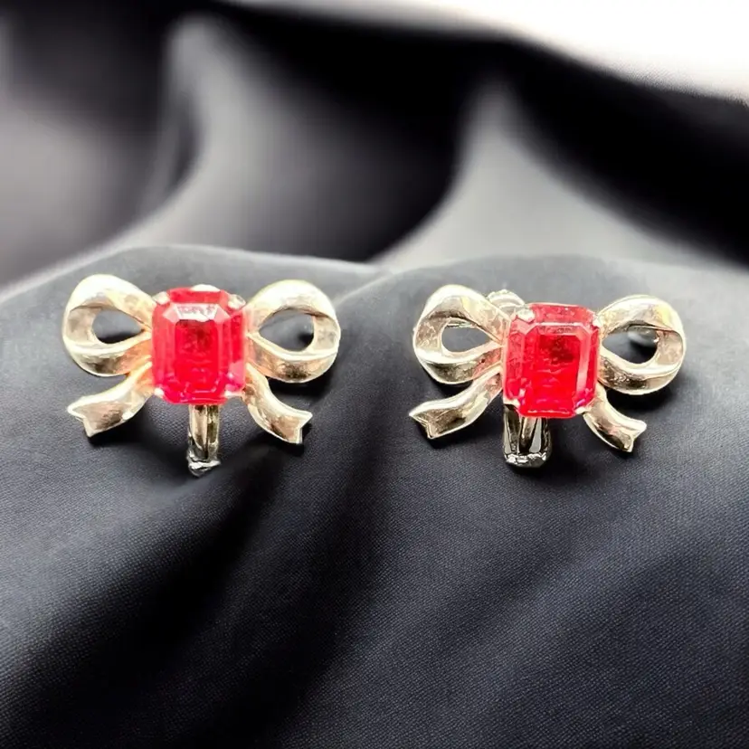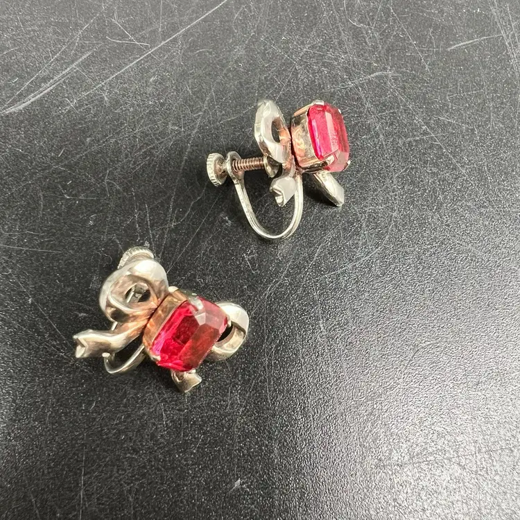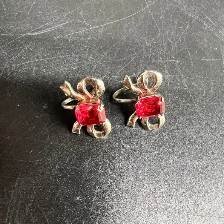 Elevate your jewelry collection with the timeless elegance of these 1940s sterling silver prong-set red glass bow-shaped screw-back earrings. The exquisite emerald-cut red glass stones add a touch of vintage glamour, while the intricate bow design offers a charming retro flair. Crafted with precision, these earrings embody the art and beauty of the era, making them a versatile addition to any outfit, from casual daytime wear to formal evening attire.